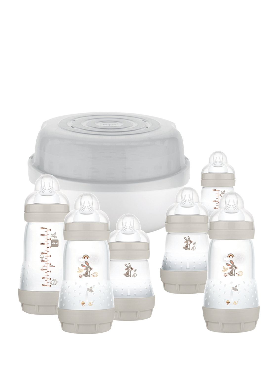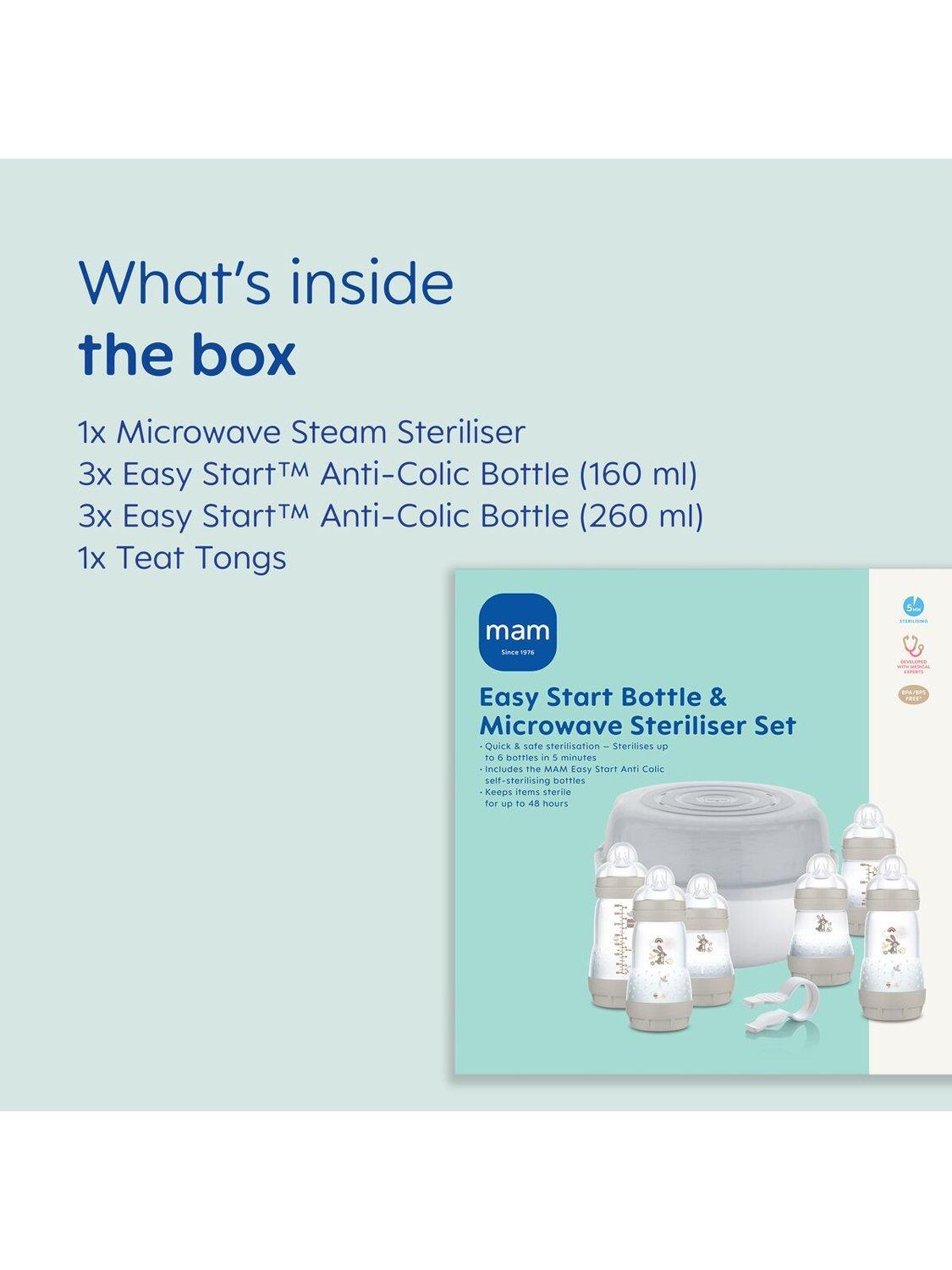 The MAM Microwave Easy Start Bottle and Microwave Steriliser Set is the perfect accompaniment for parents who want to sterilise and bottle feed. The set includes the steriliser and 3 Easy Start Anti Colic 160ml and 260ml bottles.