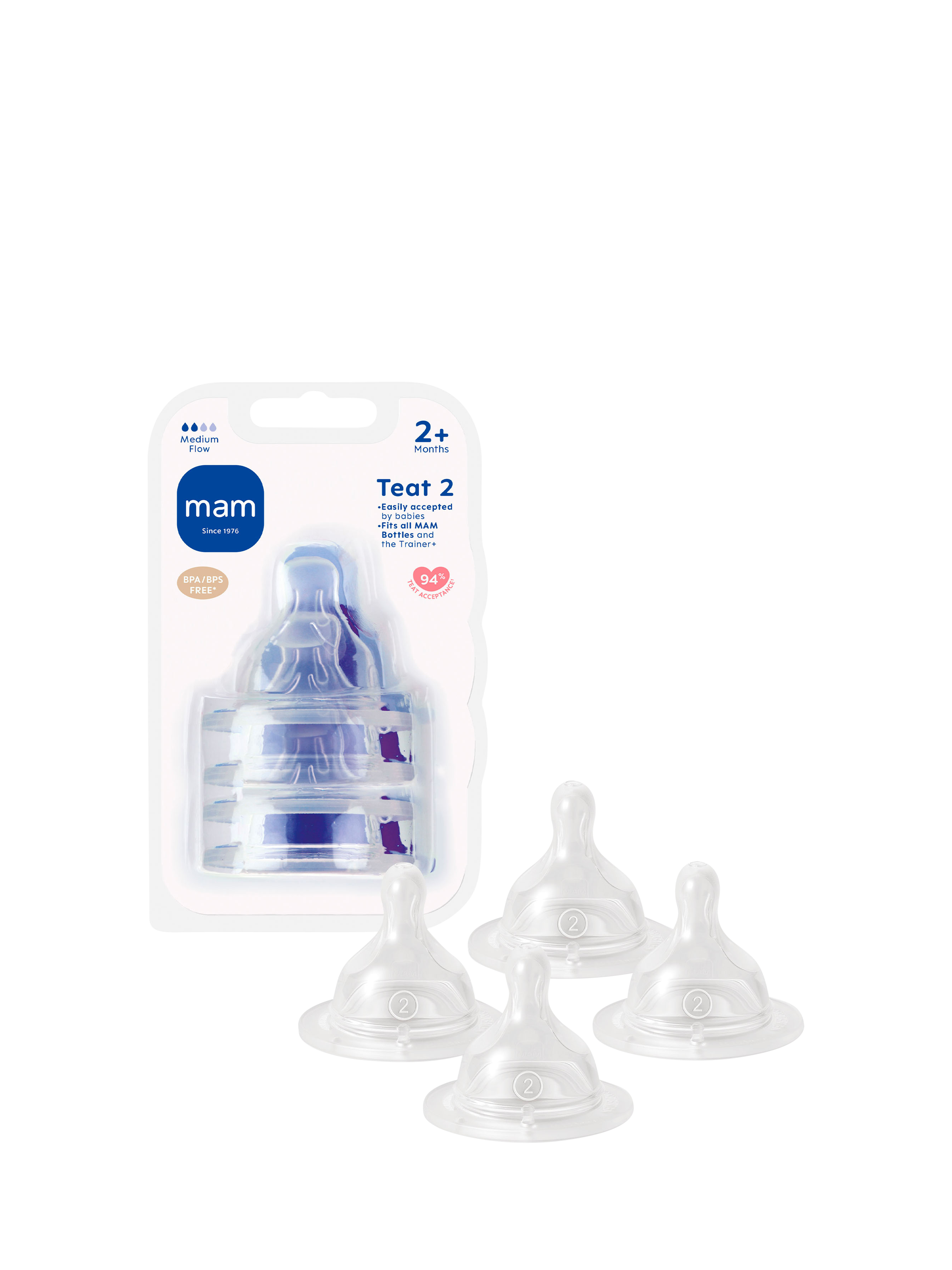 Now available in a handy 4 pack, the symmetric shape of the teat fits perfectly in baby's mouth and has been proven effective with 94%* of babies accepting the MAM Teat.