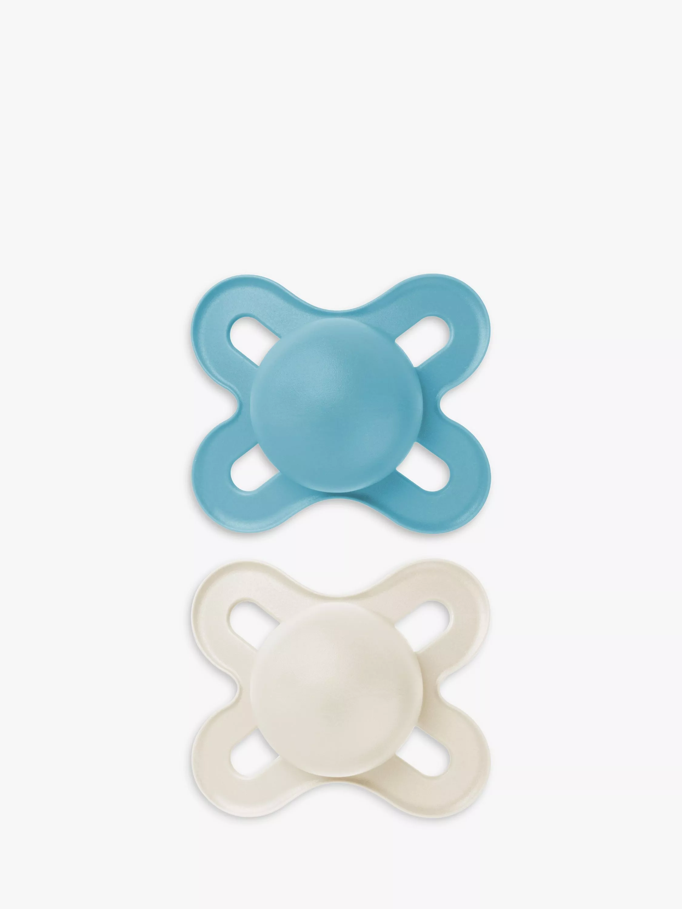 The MAM Original Pure soother has all the same great features as the MAM Original soother - including the SkinSoft™ Silicone teat which is easily accepted by 94%* of babies, and the flat, symmetrical shape designed in association with dentists to support healthy dental development. Packed in a handy self-sterilising box, these soothers can be sterilised in just 3 minutes in the microwave, and using this sterilising method can reduce CO₂ emissions by 77%**