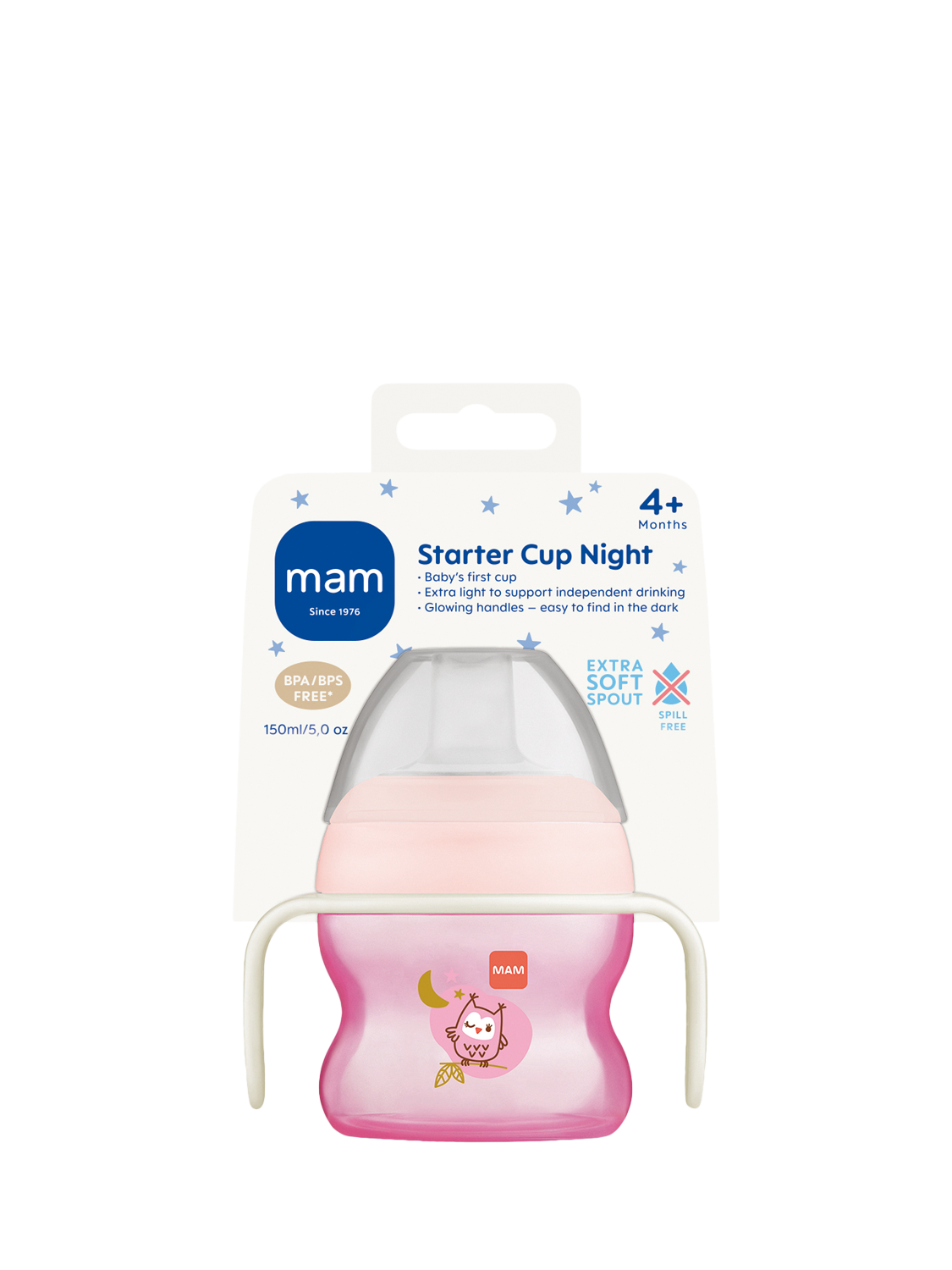 MAM’s Starter Cup with Glow Handles is especially small and cute! To help baby switch from bottle to cup, MAM designers in close cooperation with developmental specialists have developed this cup with an extra soft spill-free spout allowing baby to control the flow rate at their own pace. Its lightweight, ergonomic design with non-slip handles also makes it easy and comfortable for baby to hold. The glow-in-the-dark handles ensure that parents can locate their cup at night time without disturbing their little one and help facilitate those difficult night-time feeds.