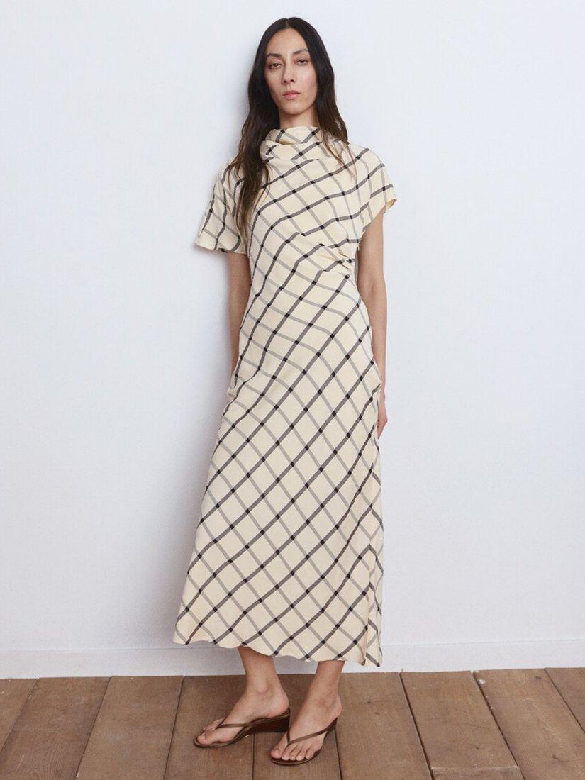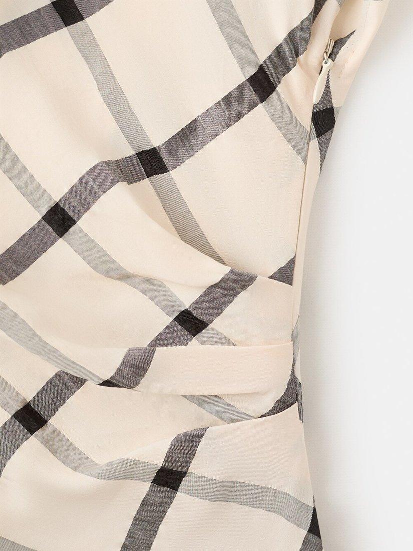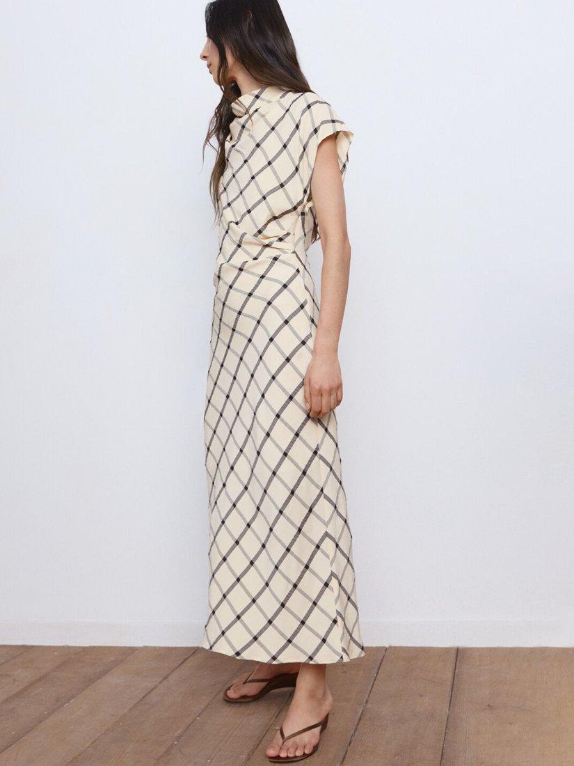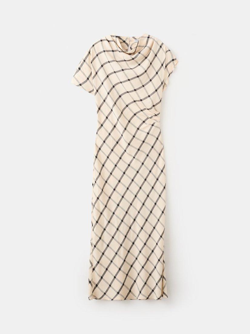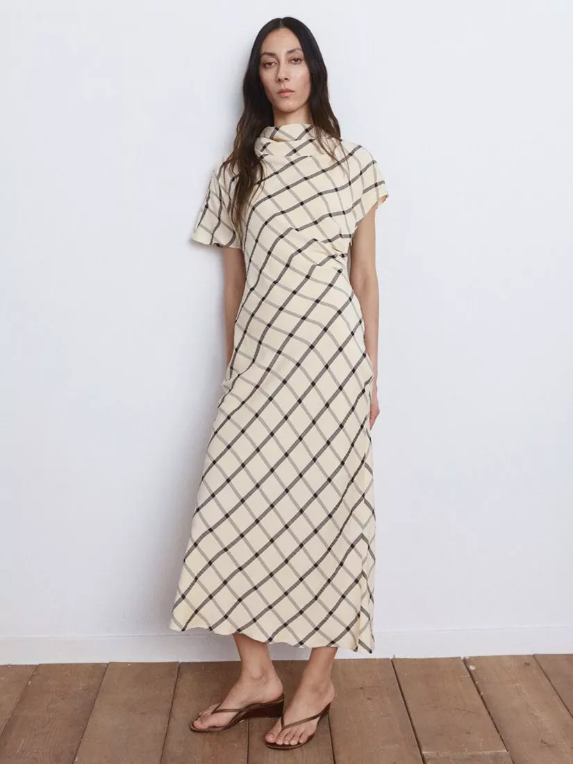 A midi dress in a draped A line cut, designed with a check pattern and a softly structured cowl neck. Short sleeves and a viscose blend bring lightness, making it a sharp choice for day occasions.
