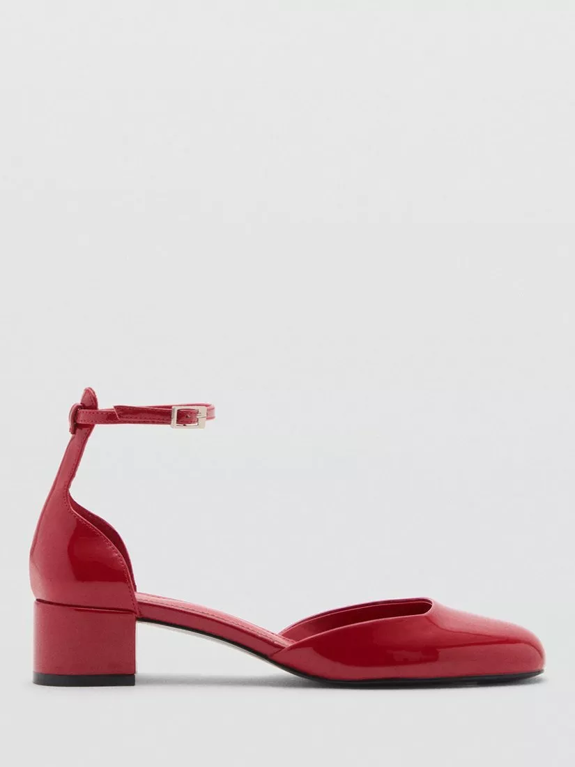 With a shiny patent-effect finish, these Alexa shoes from Mango sit on a low block heel.
