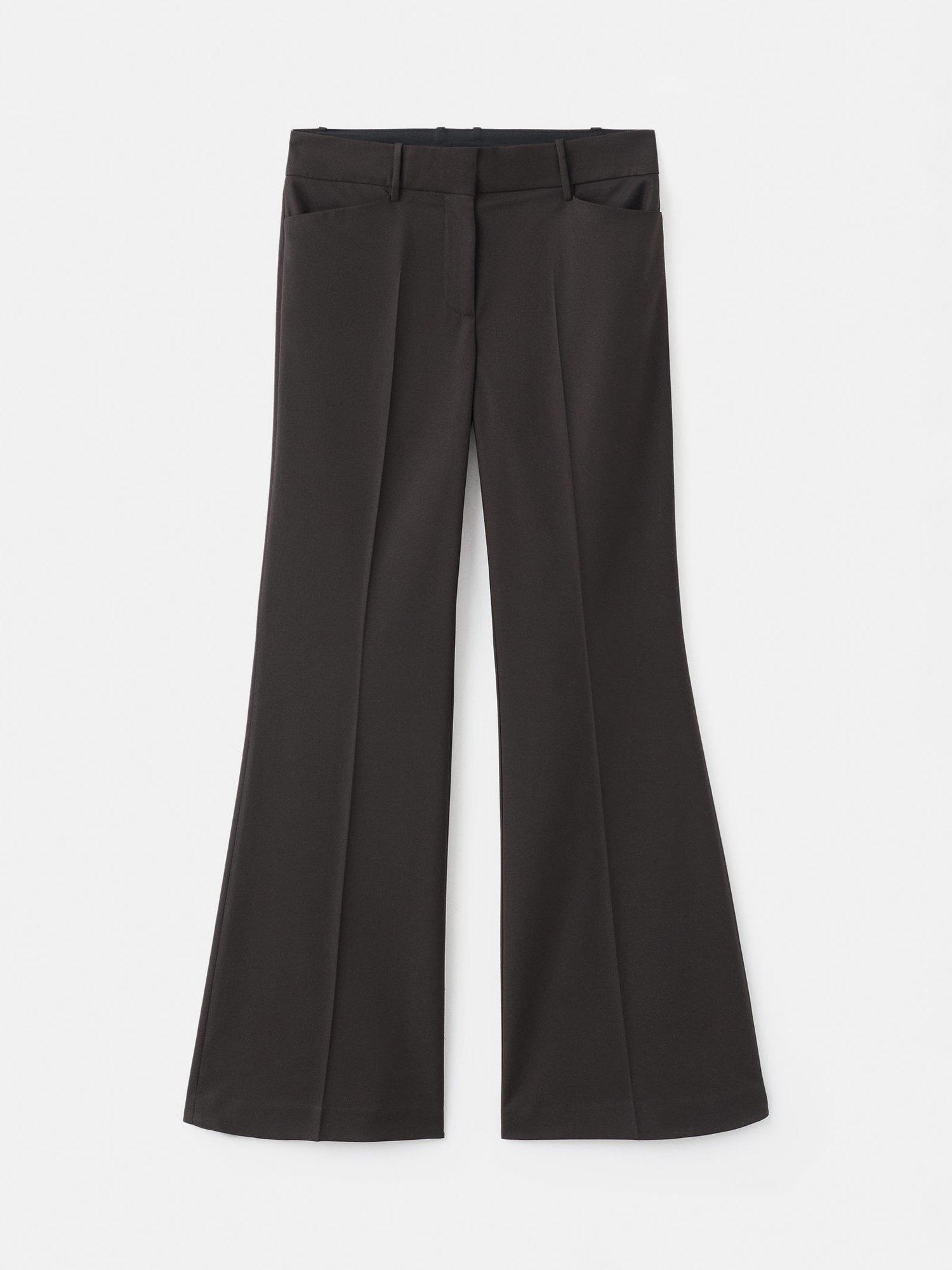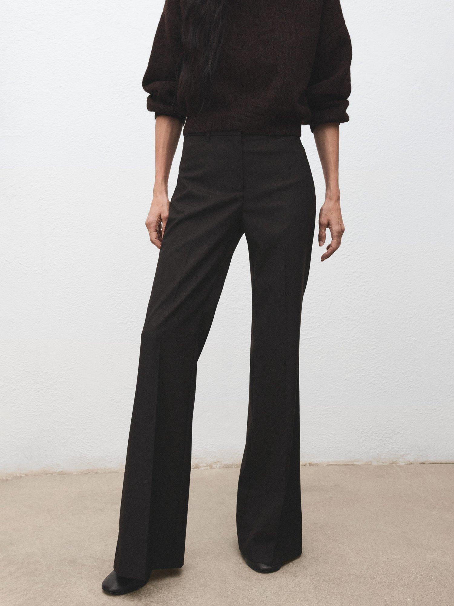 Sleek flared tailored trousers by Mango. They sit mid rise with a concealed zip and a hook and eye and hems that are fall past the ankle.