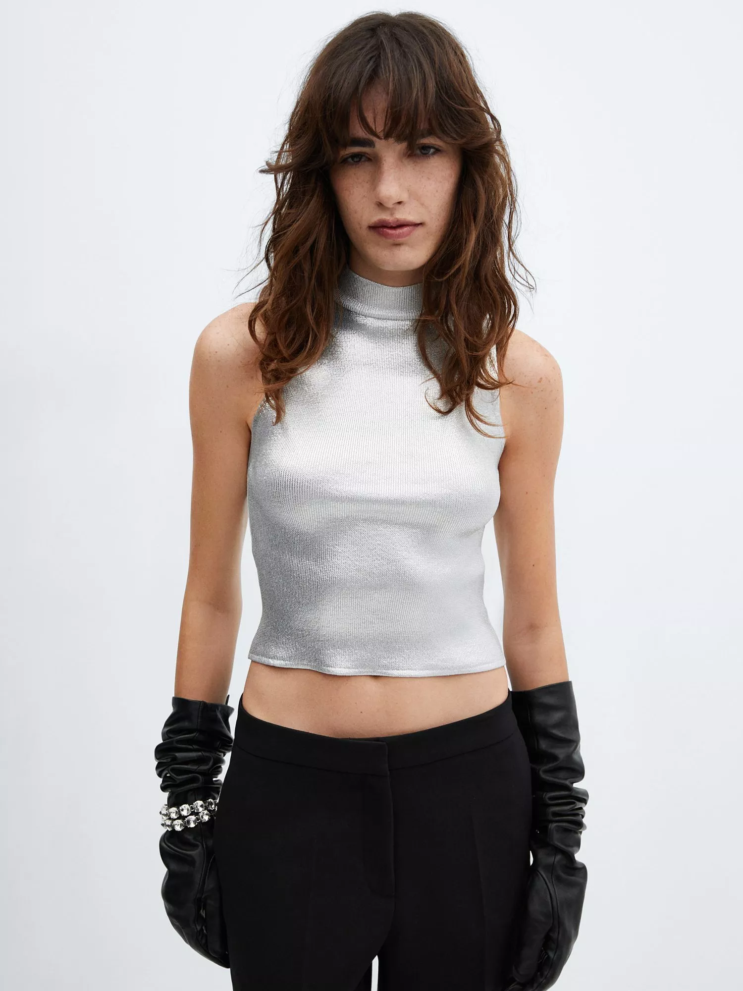 Cropped at the hem for an urban aesthetic, this top from Mango is enlivened with a shimmery effect.
