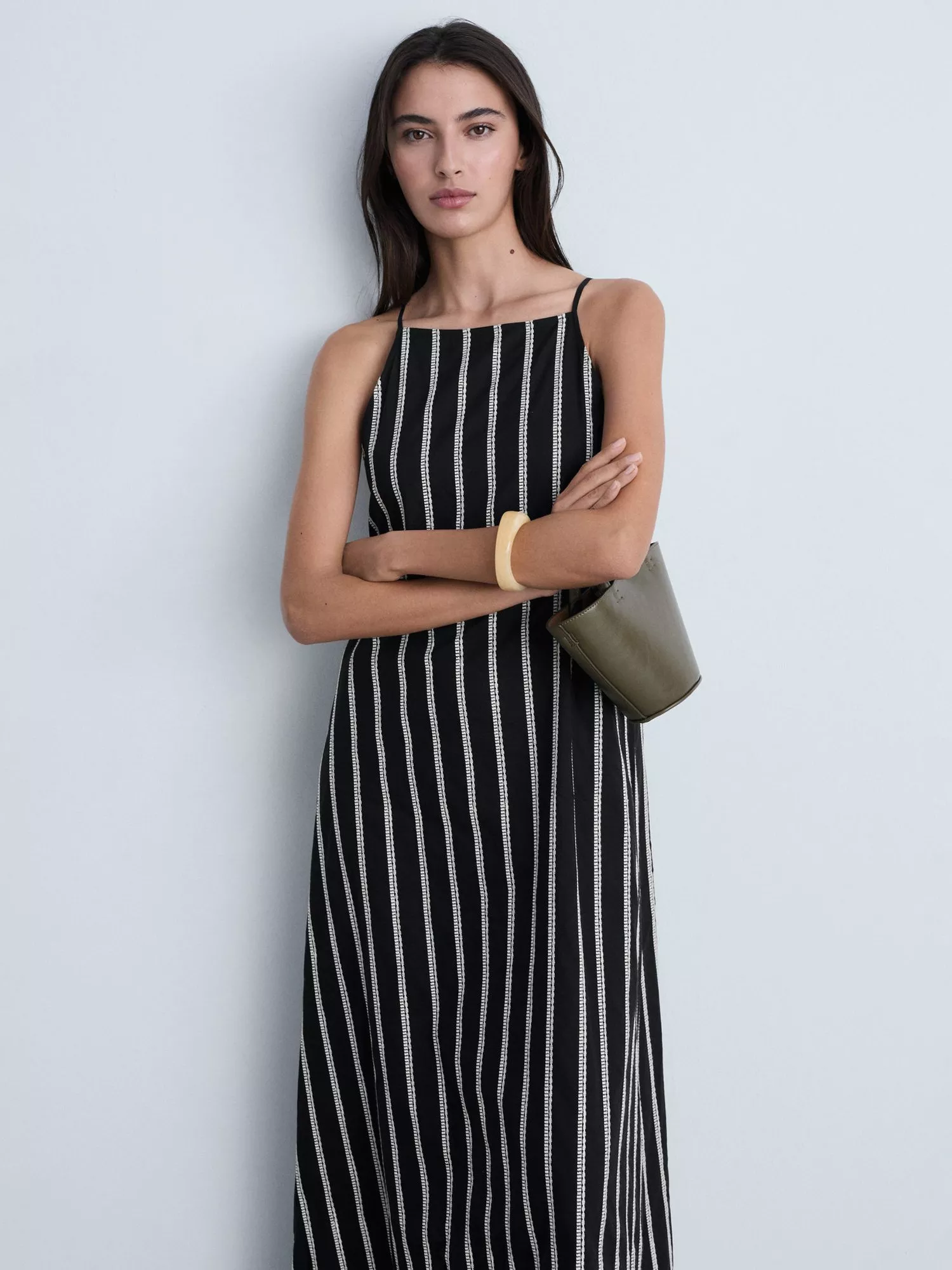 In a flattering fit that accentuates the waist, this floor-length dress from Mango is crafted from soft and durable cotton. Sporting a square neckline, this sleeveless style features embroidered striping across its canvas (because let's be honest, they're too hard to say no to).