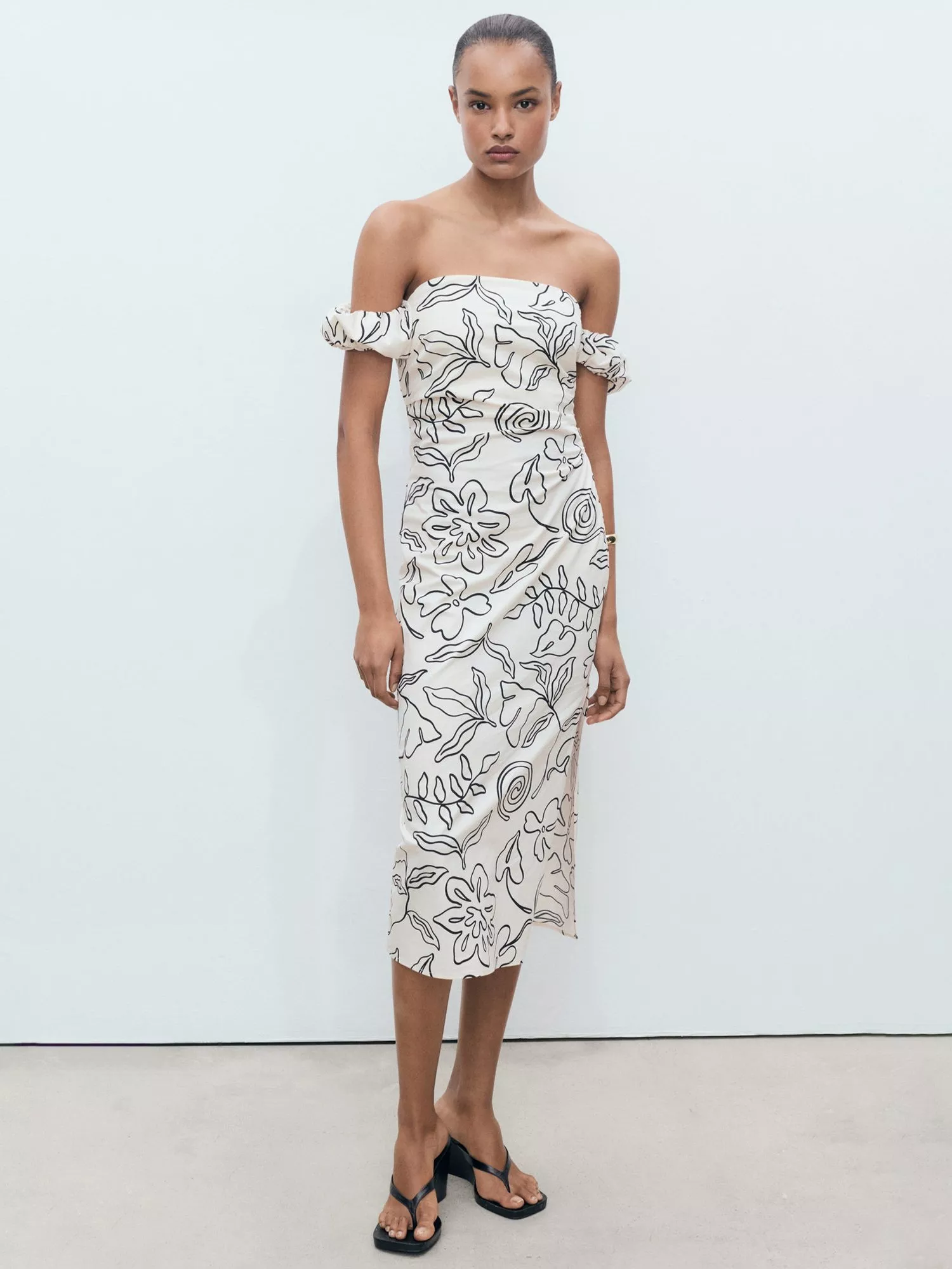 With puffy Bardot straps and a pencil silhouette, this sleeveless midi dress from Mango is made from pure cotton with an all-over floral and leaves line design.