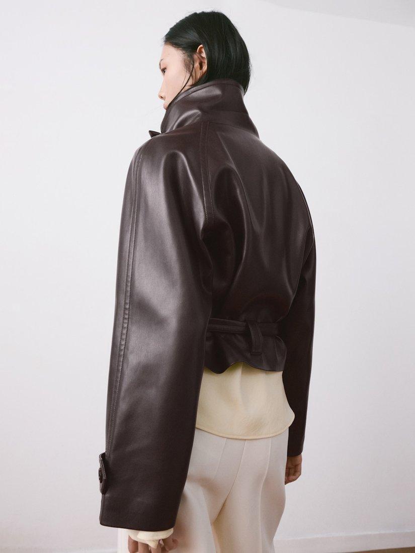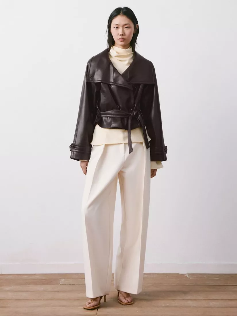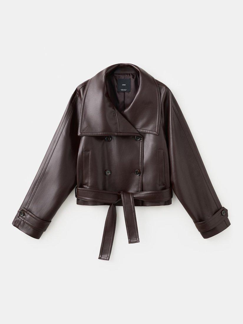 A short faux-leather jacket with maxi lapels and a crossover collar. Features long sleeves with buttoned cuffs, two side pockets, double button fastening, and a nightgown-style belt for added style.