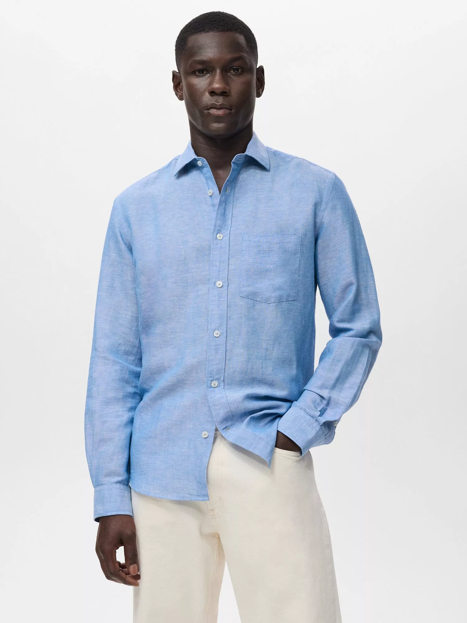 Classic fit, Linen and cotton mix, Shirt Collar, Front closure with buttons, Front patch pocket, Dart on the back, Rounded base, Buttoned cuffs, The model is 188 cm tall and is wearing a size M