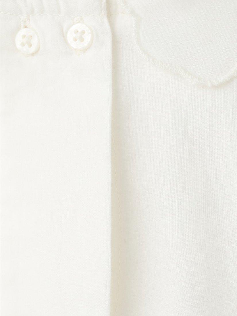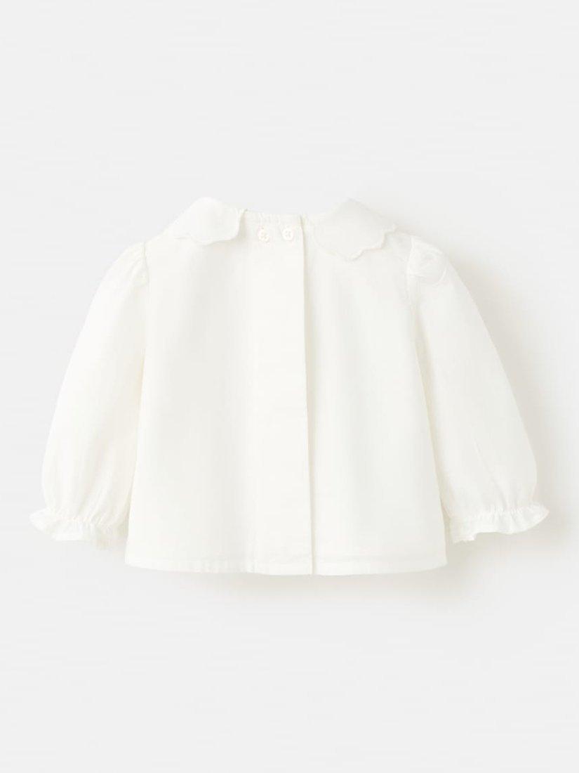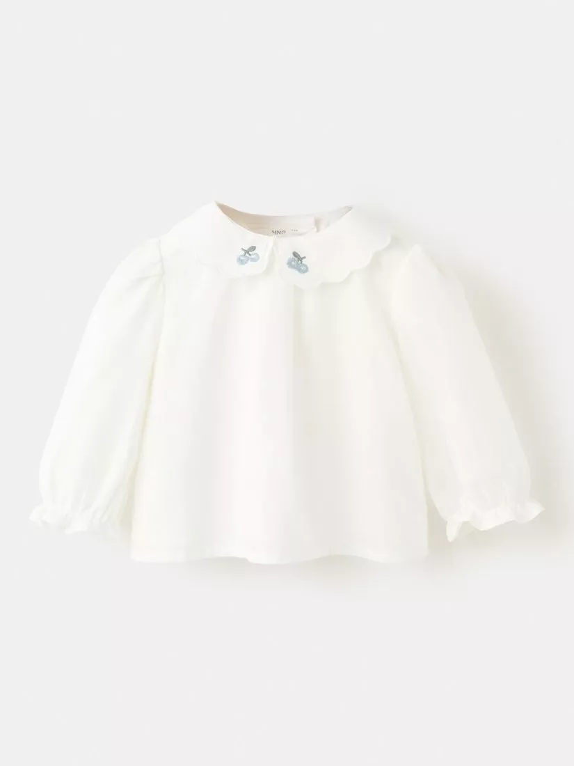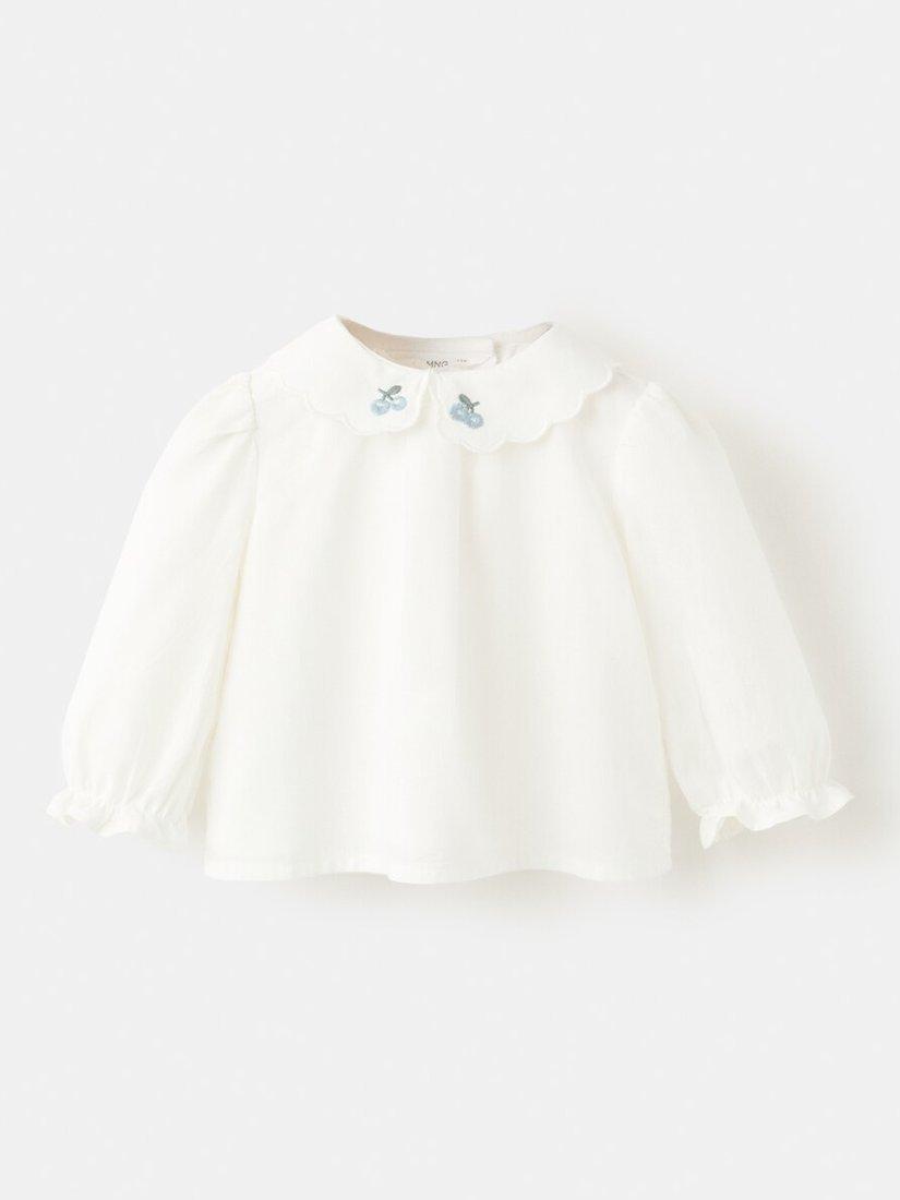 This long sleeve cotton blouse features delicate embroidery, a Peter pan collar and scalloped edges, offering a comfortable fit that keeps them stylish.