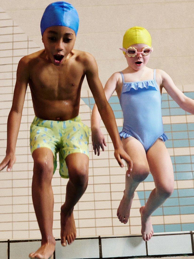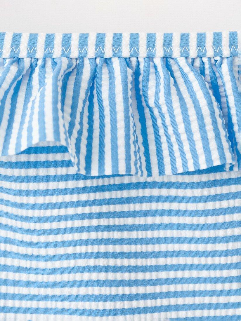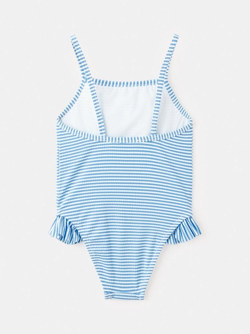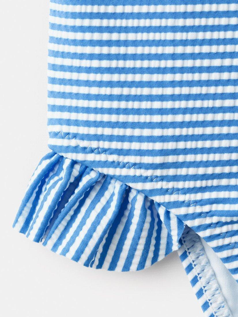 Soft stretch striped swimsuit, ensuring baby feels snug and comfortable. Suitable for delicate skin, it features a ruffle trim.