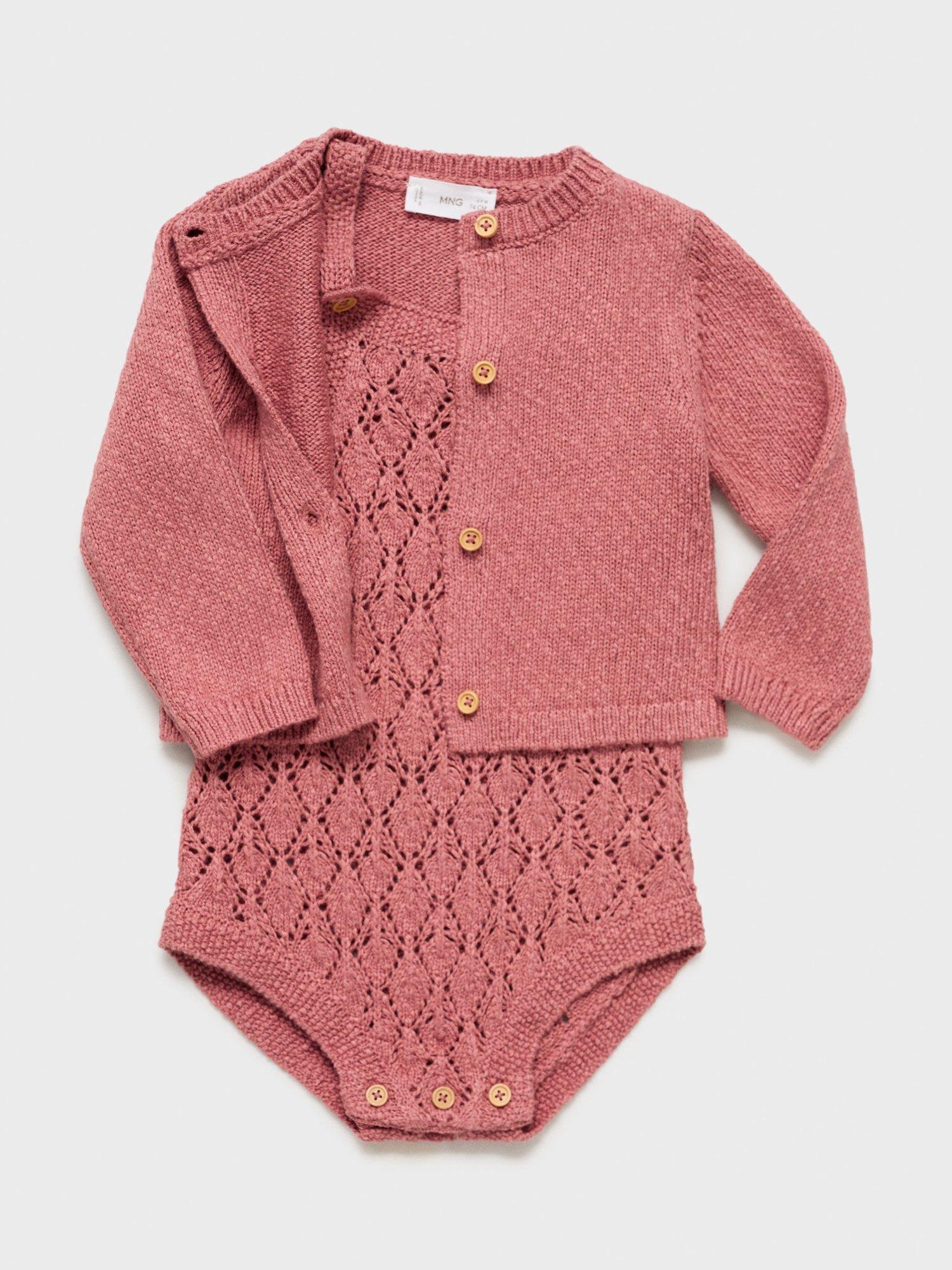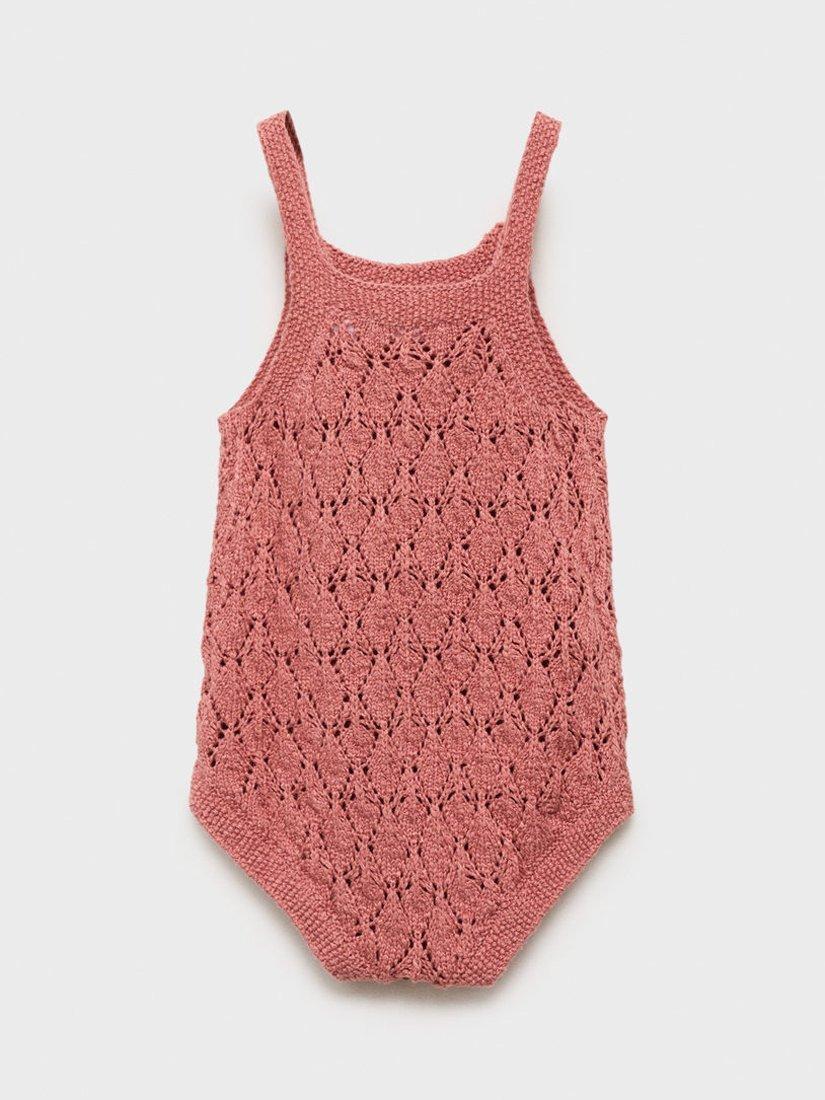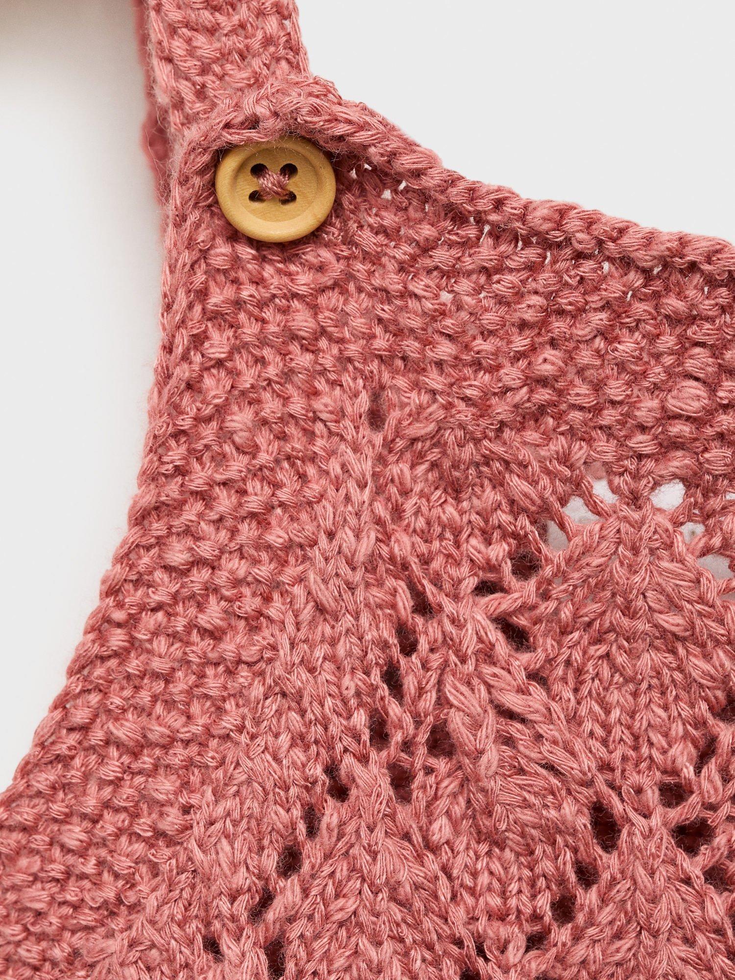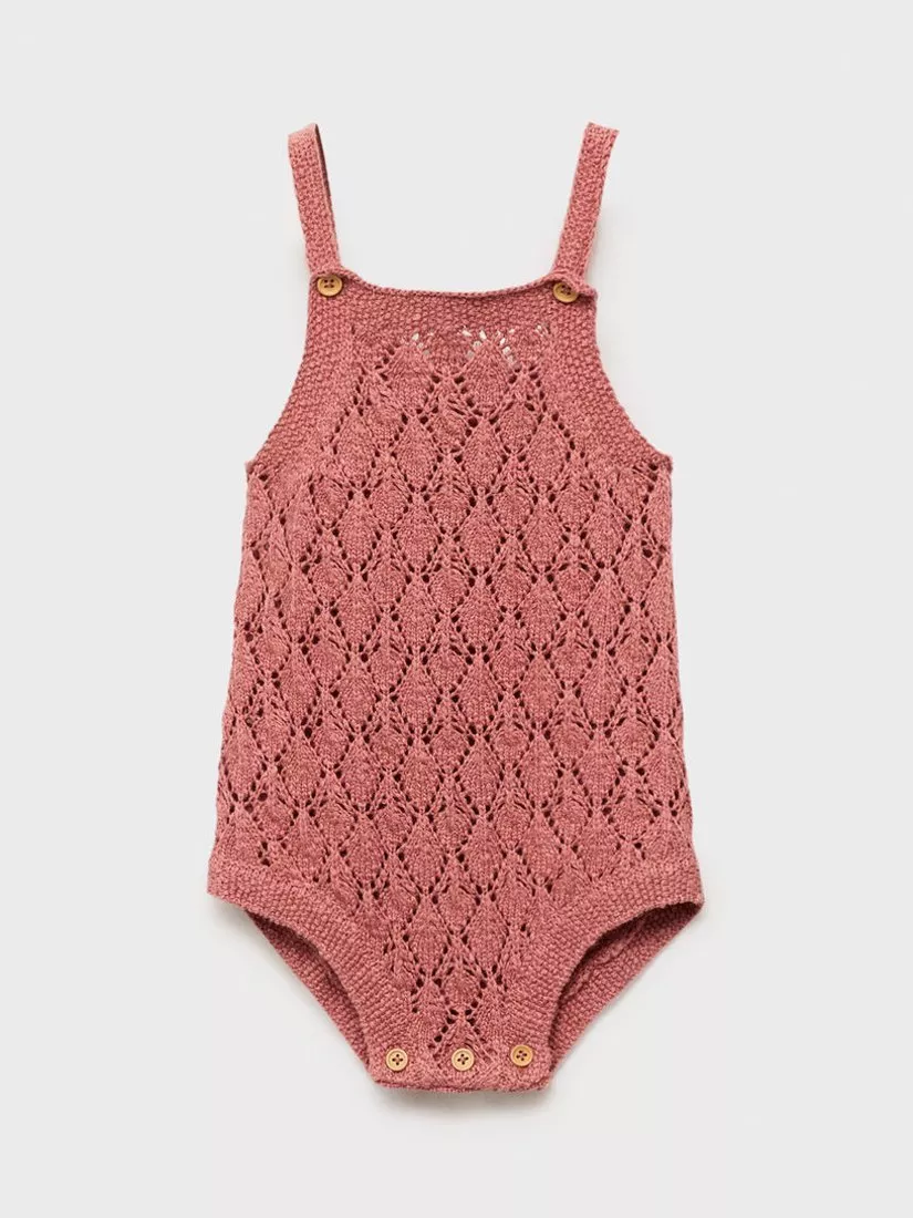 Open knit cotton blend romper, finished with wood effect buttons and square neckline.