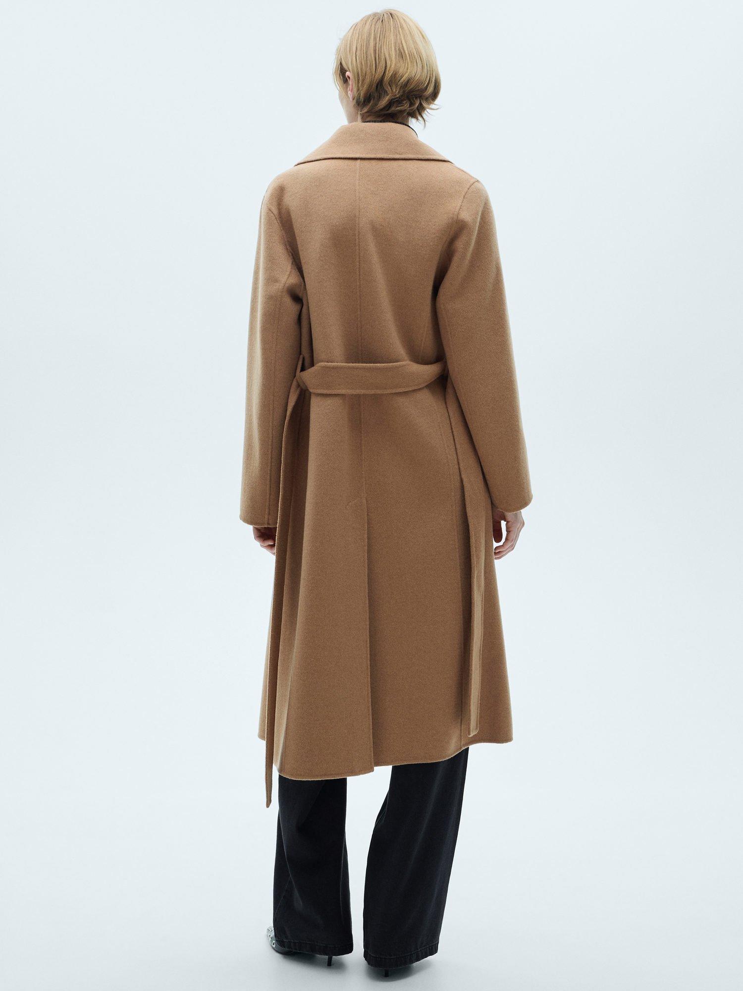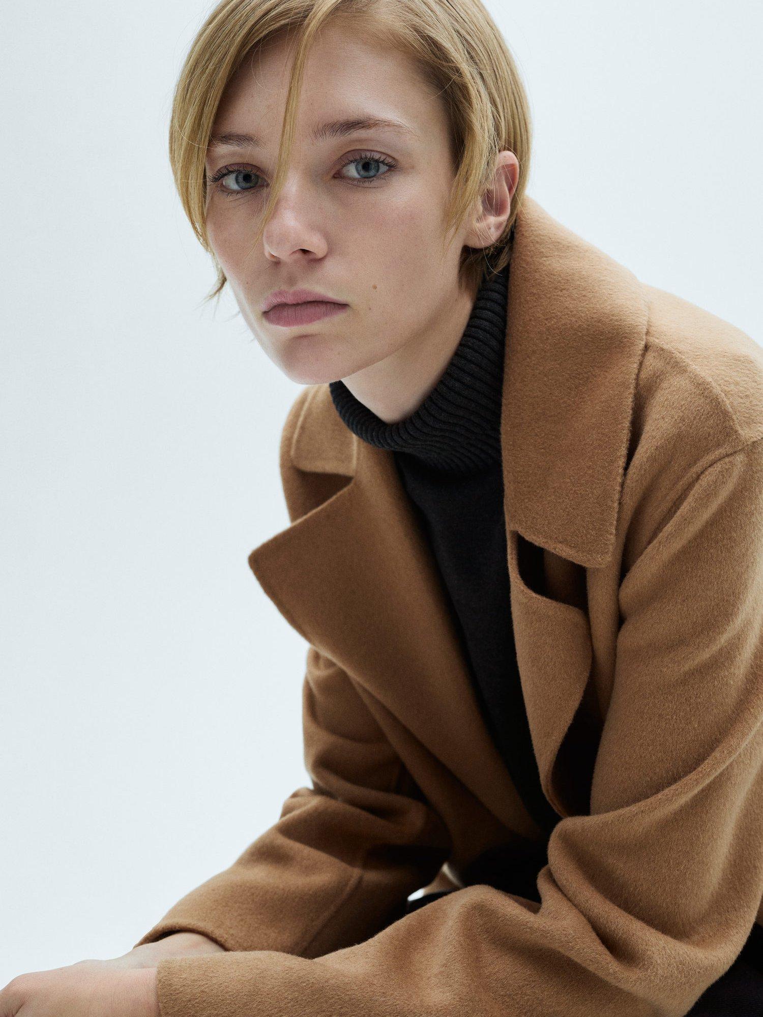 - COMPOSITION: 56% WOOL, 40% POLYESTER, 2% POLYAMIDE, 1% ACRYLIC, 1% VISCOSE. BELT: 56% WOOL, 40% POLYESTER, 2% POLYAMIDE, 1% ACRYLIC, 1% VISCOSE. POCKETS LINING: 55% POLYESTER, 45% VISCOSE.