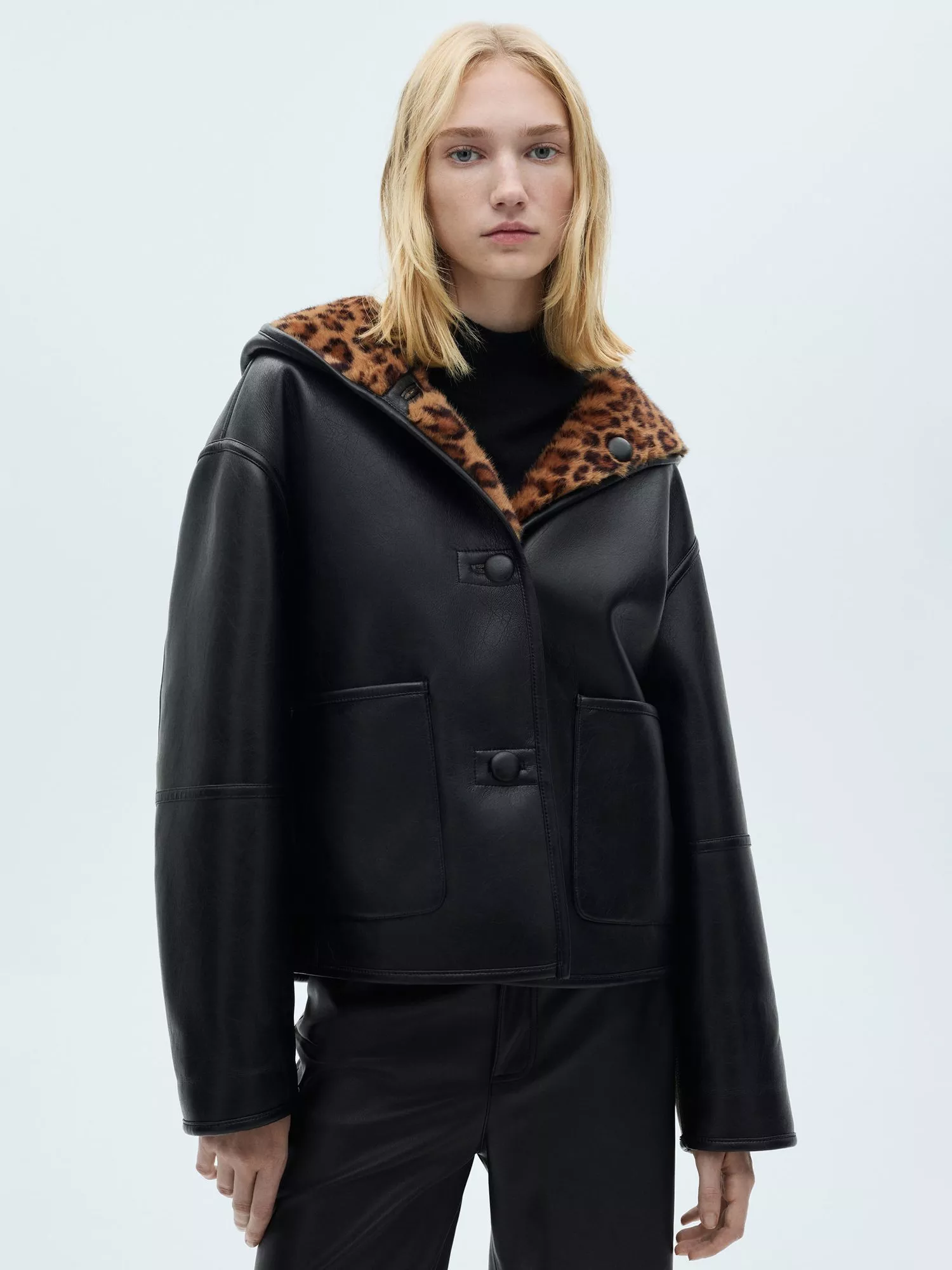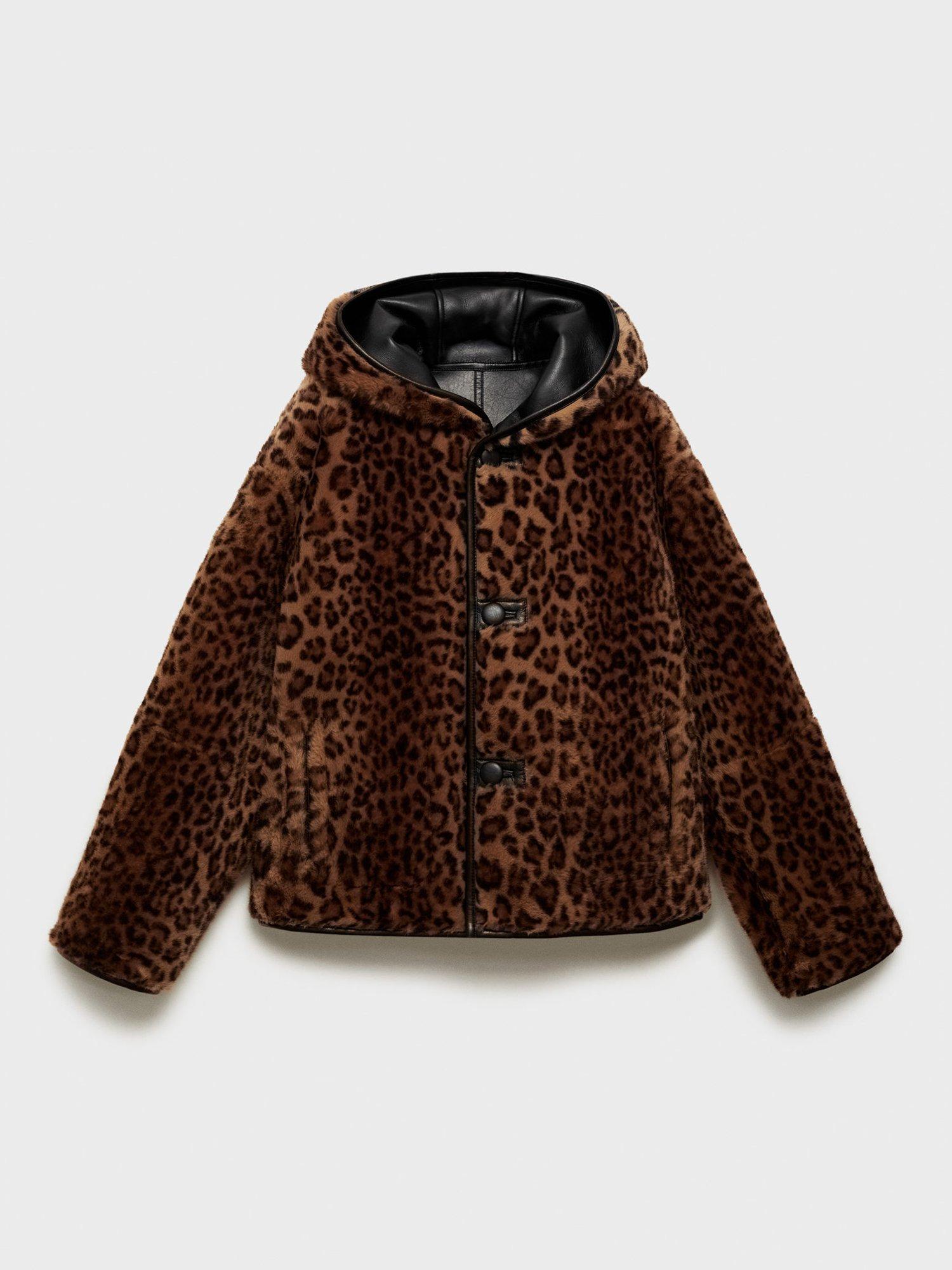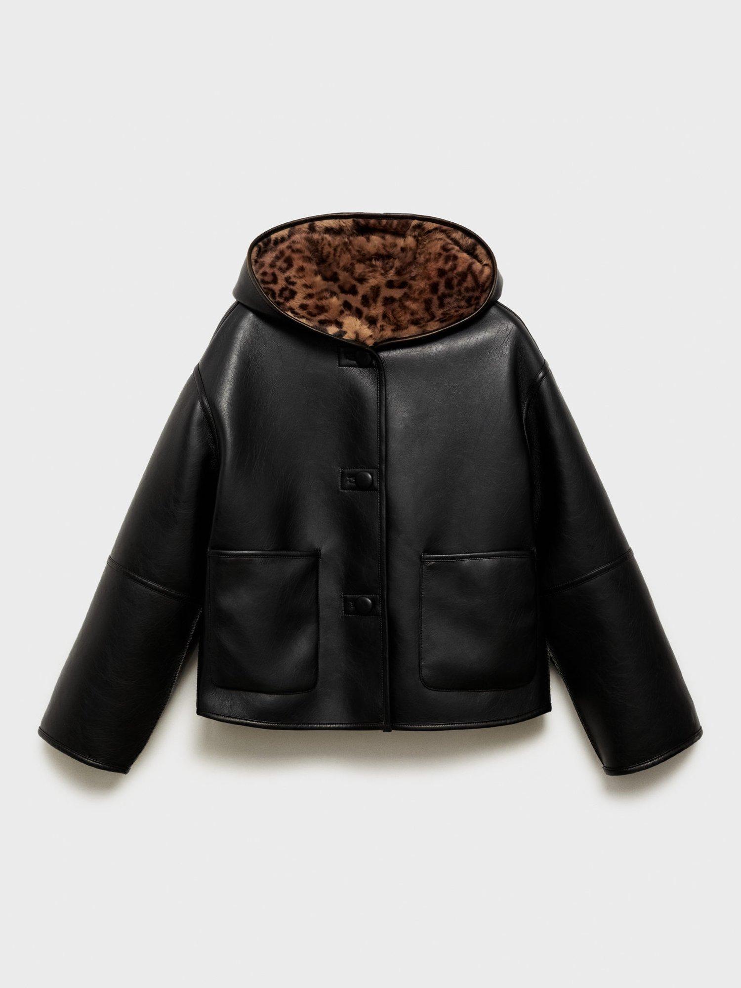 The ultimate in winter styling and topped with a handy hood, this reversible jacket from Mango features smooth faux leather on one side and leopard printed faux fur on the other.