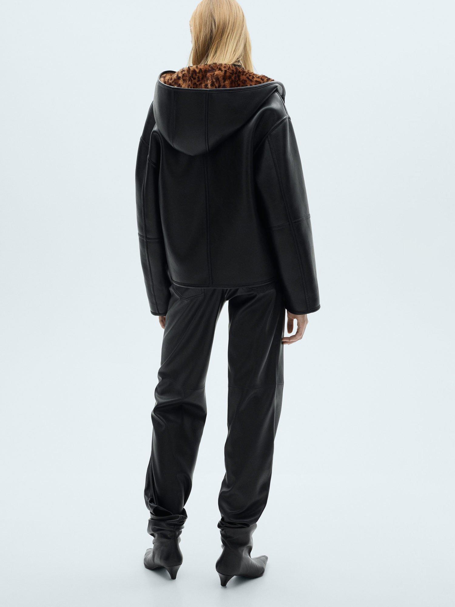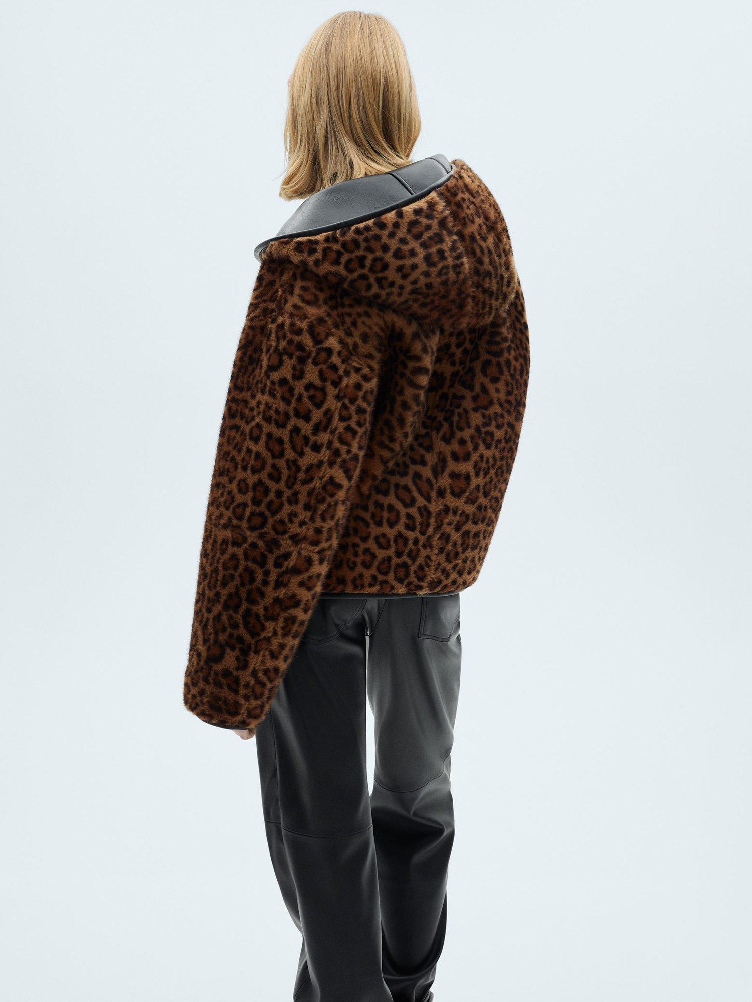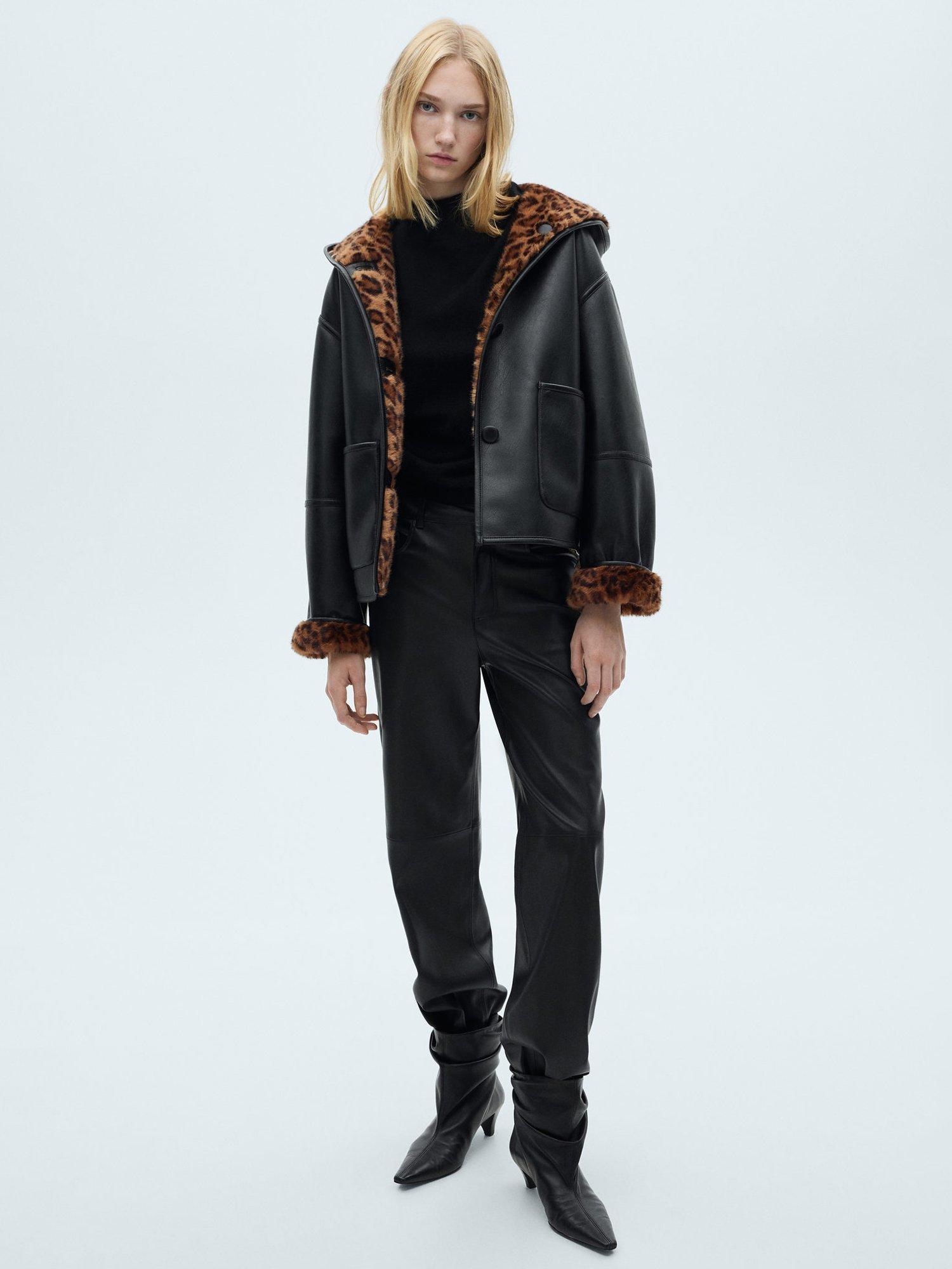 The ultimate in winter styling and topped with a handy hood, this reversible jacket from Mango features smooth faux leather on one side and leopard printed faux fur on the other.
