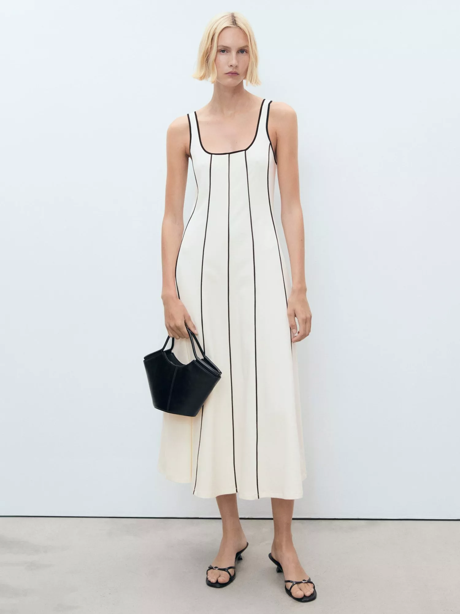 A striped midi dress by Mango, featuring a square neck and sleeveless design. The A-line shape gives you room to move while the cotton blend keeps you comfortable from morning errands to evening plans.