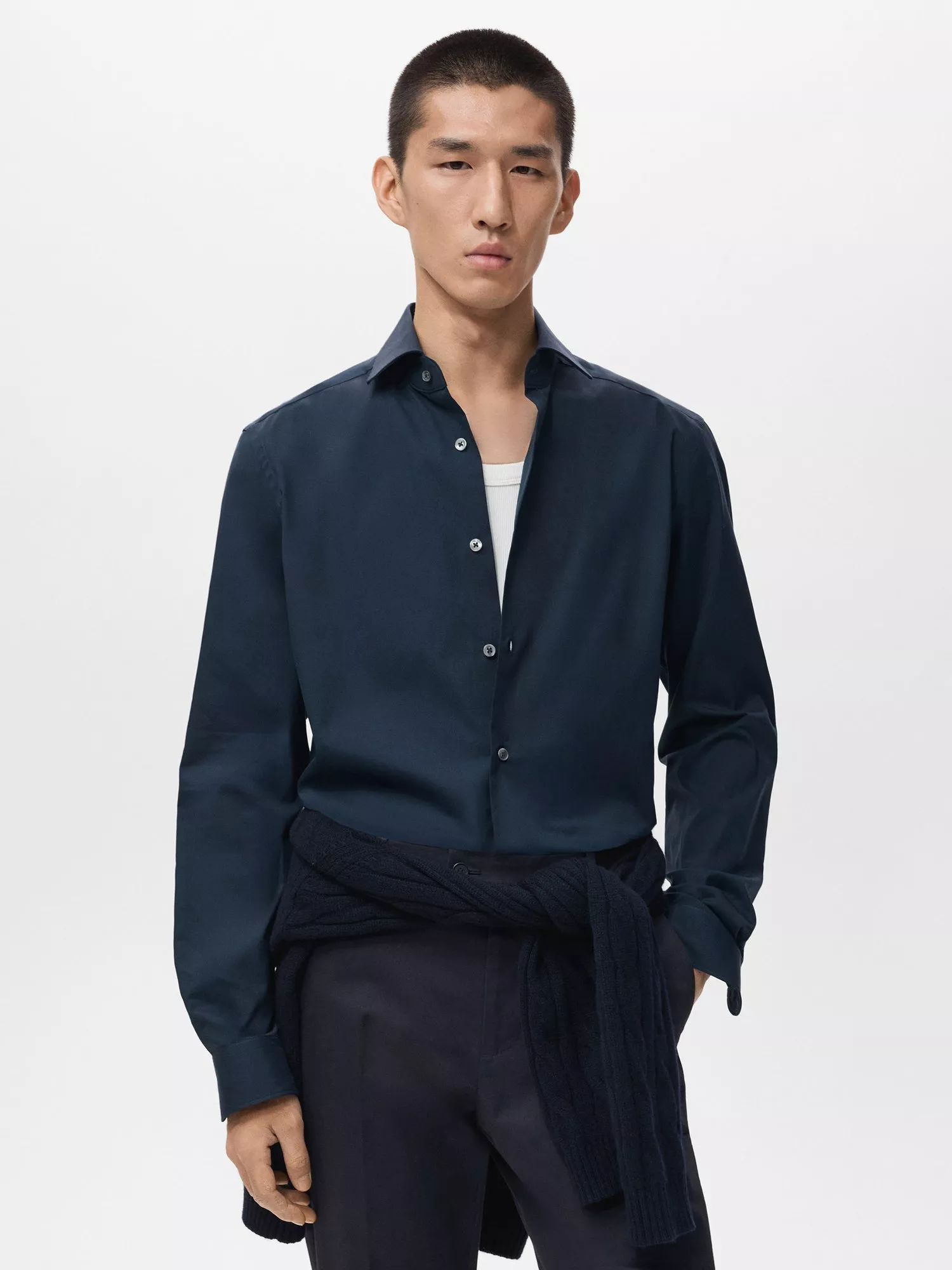 Regular fit cotton shirt with long sleeves and buttoned cuffs. Fastens with a buttoned front and features a spread collar and rounded hem.