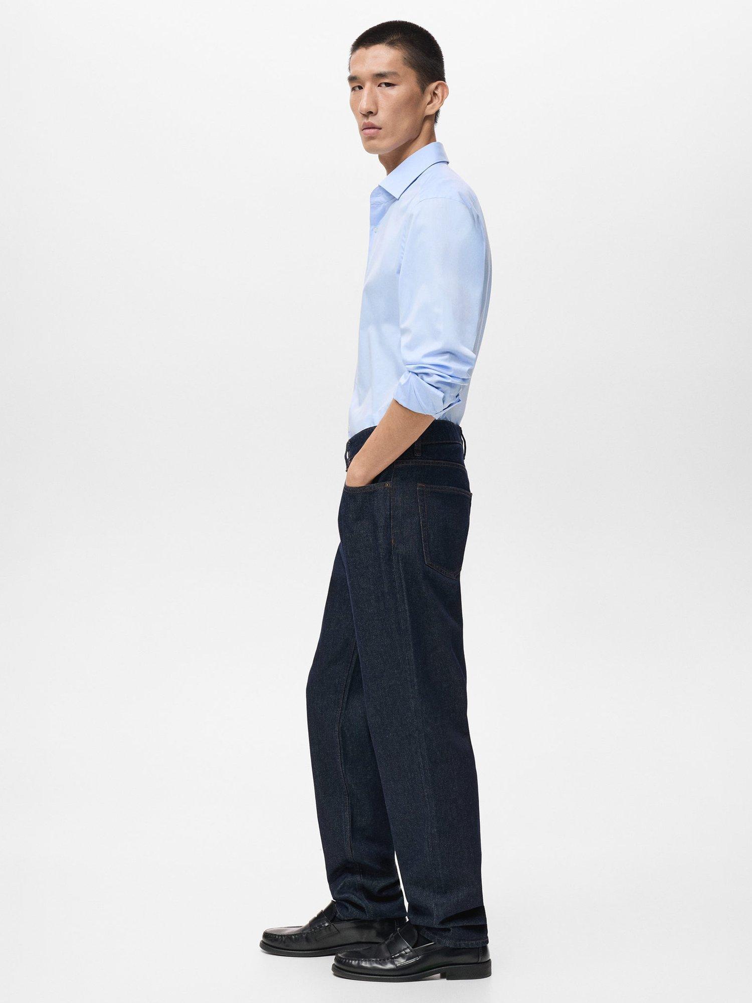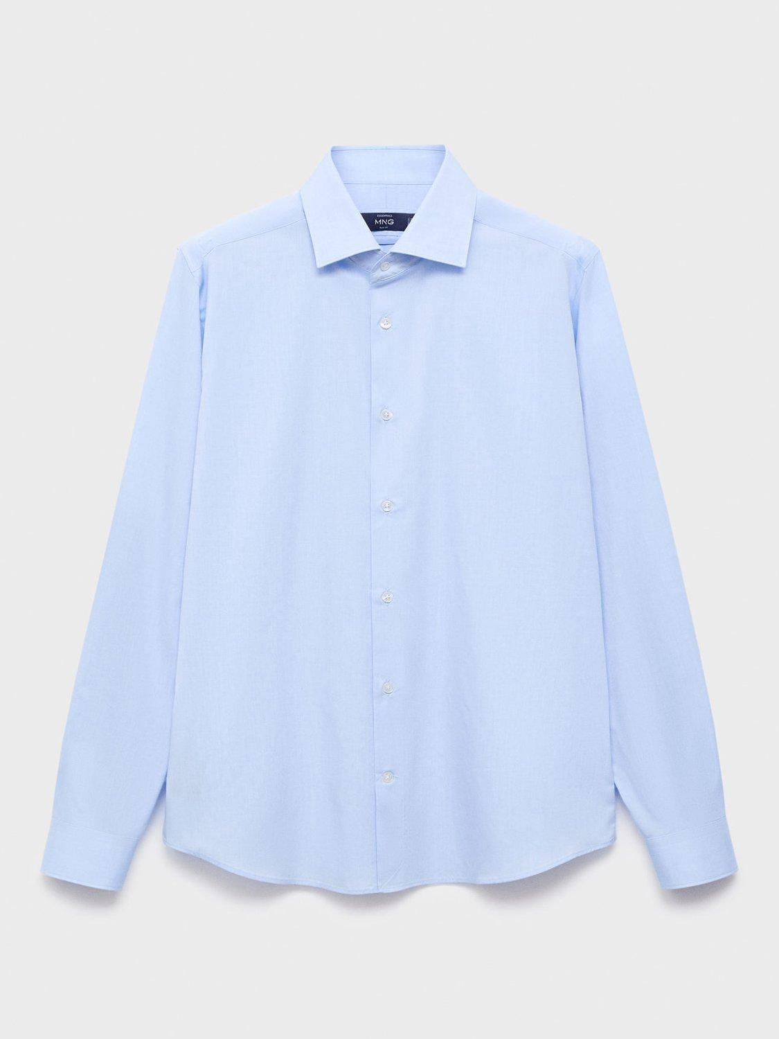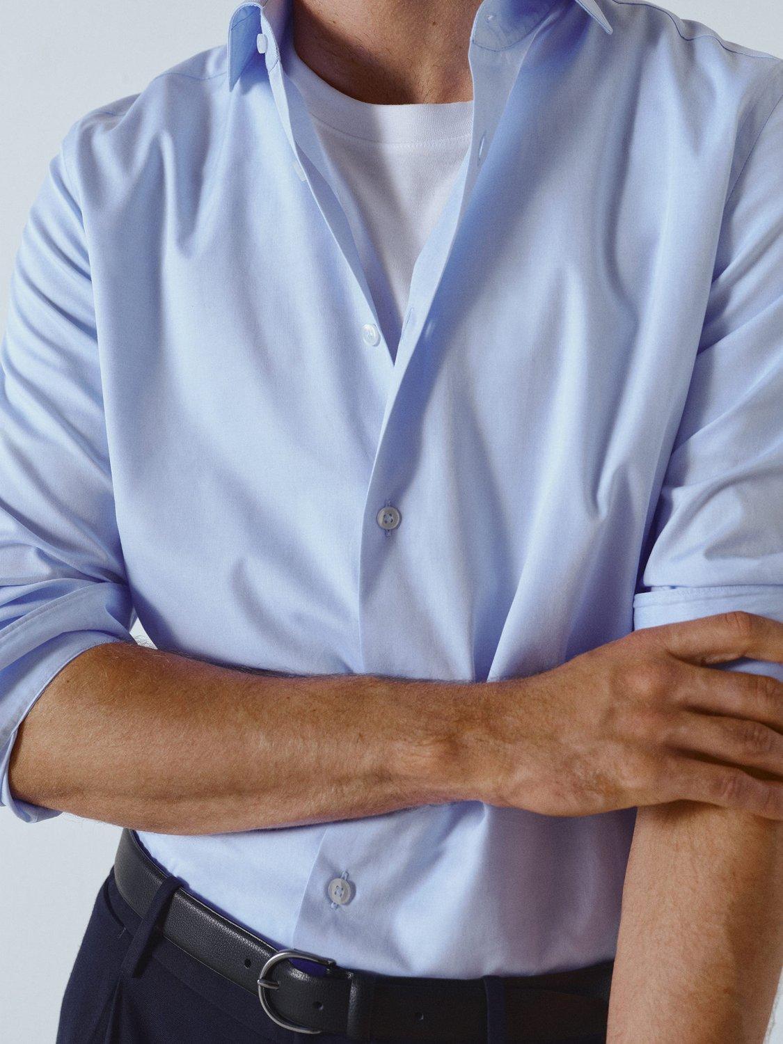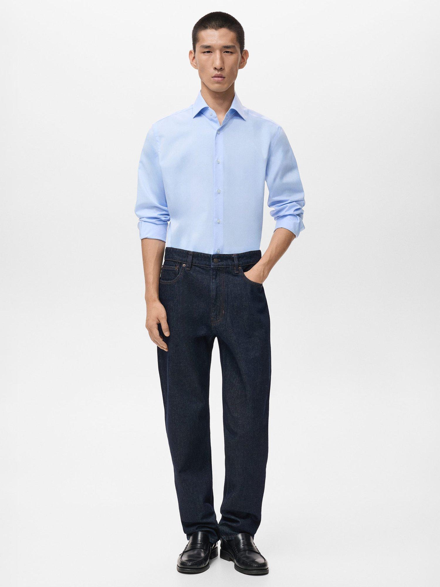 Regular fit cotton shirt with long sleeves and buttoned cuffs. Fastens with a buttoned front and features a spread collar and rounded hem.