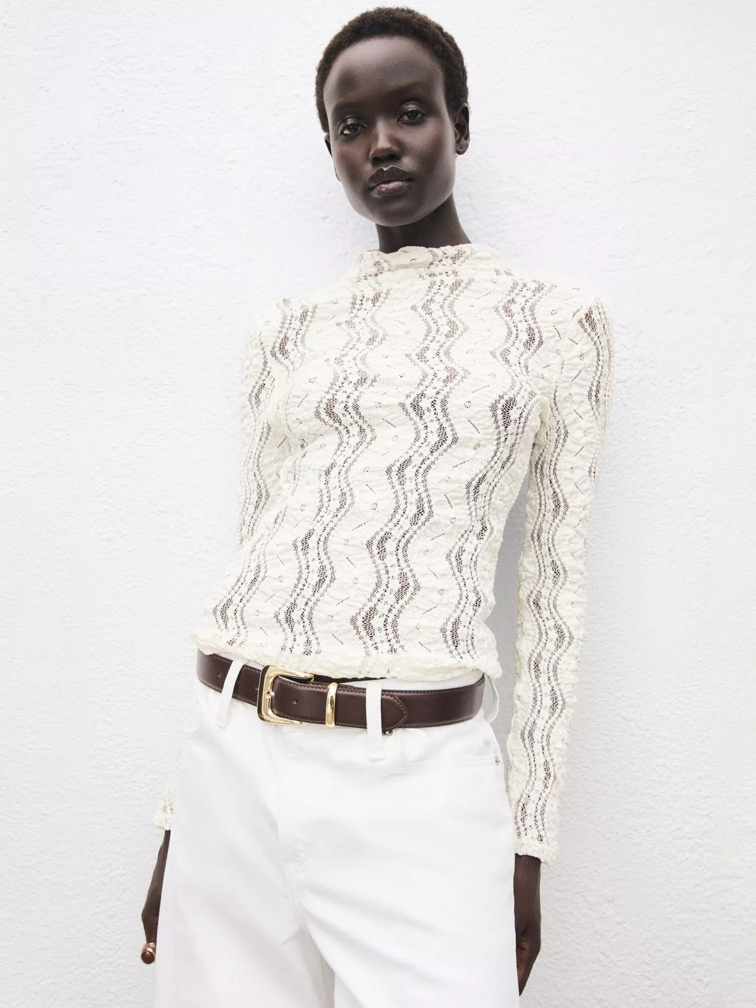 A jersey top from Mango, offered in a cotton blend for a soft feel. With a round neck and long sleeves, it comes in an open work lace style.