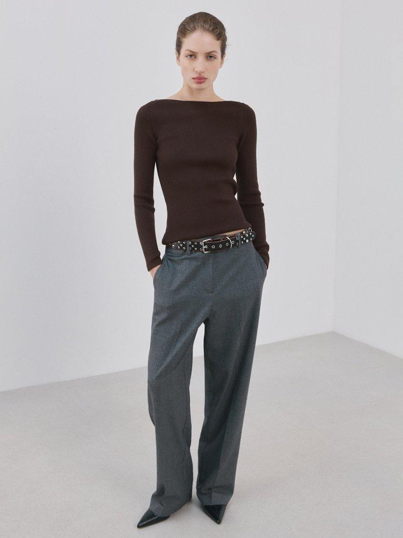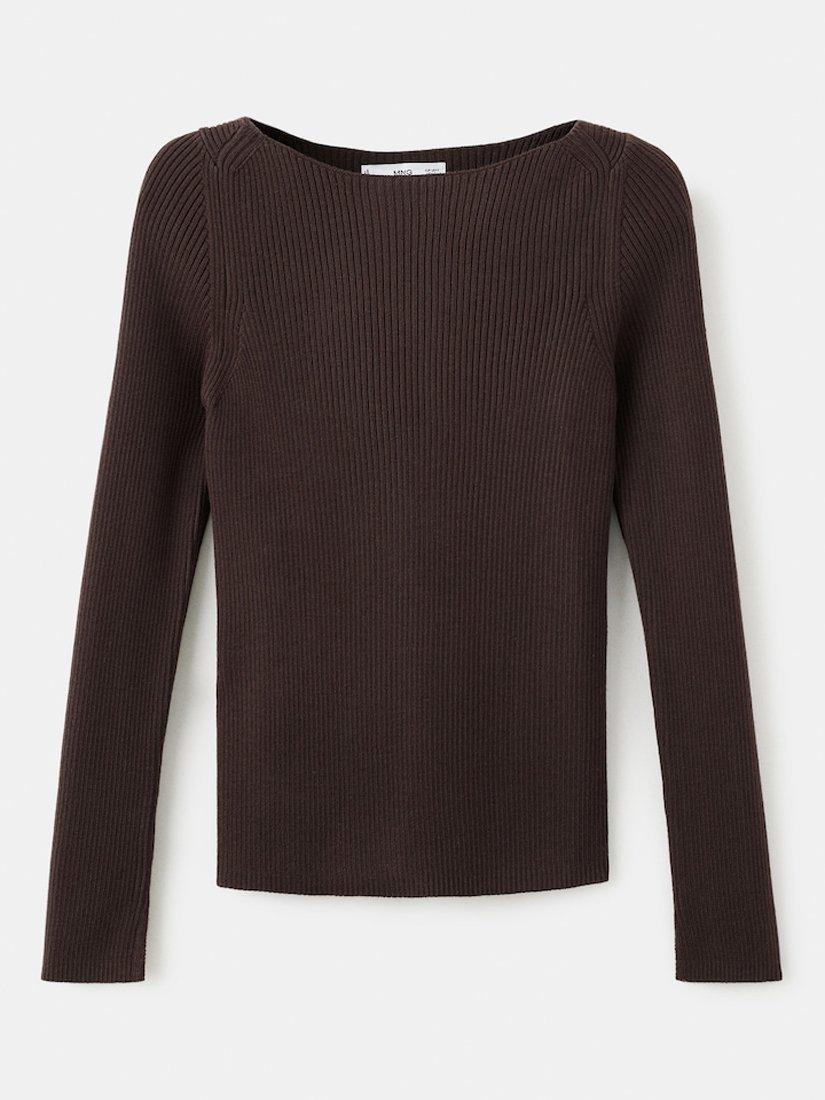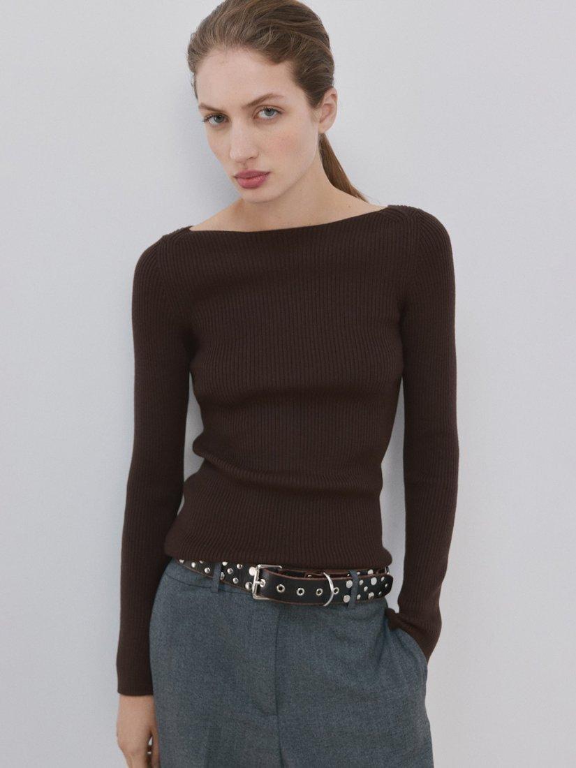 Sculpting ribbed knit that skims the silhouette, boat neck and long sleeves for modern understatement, luxuriously soft feel that moves from workday to weekend.
