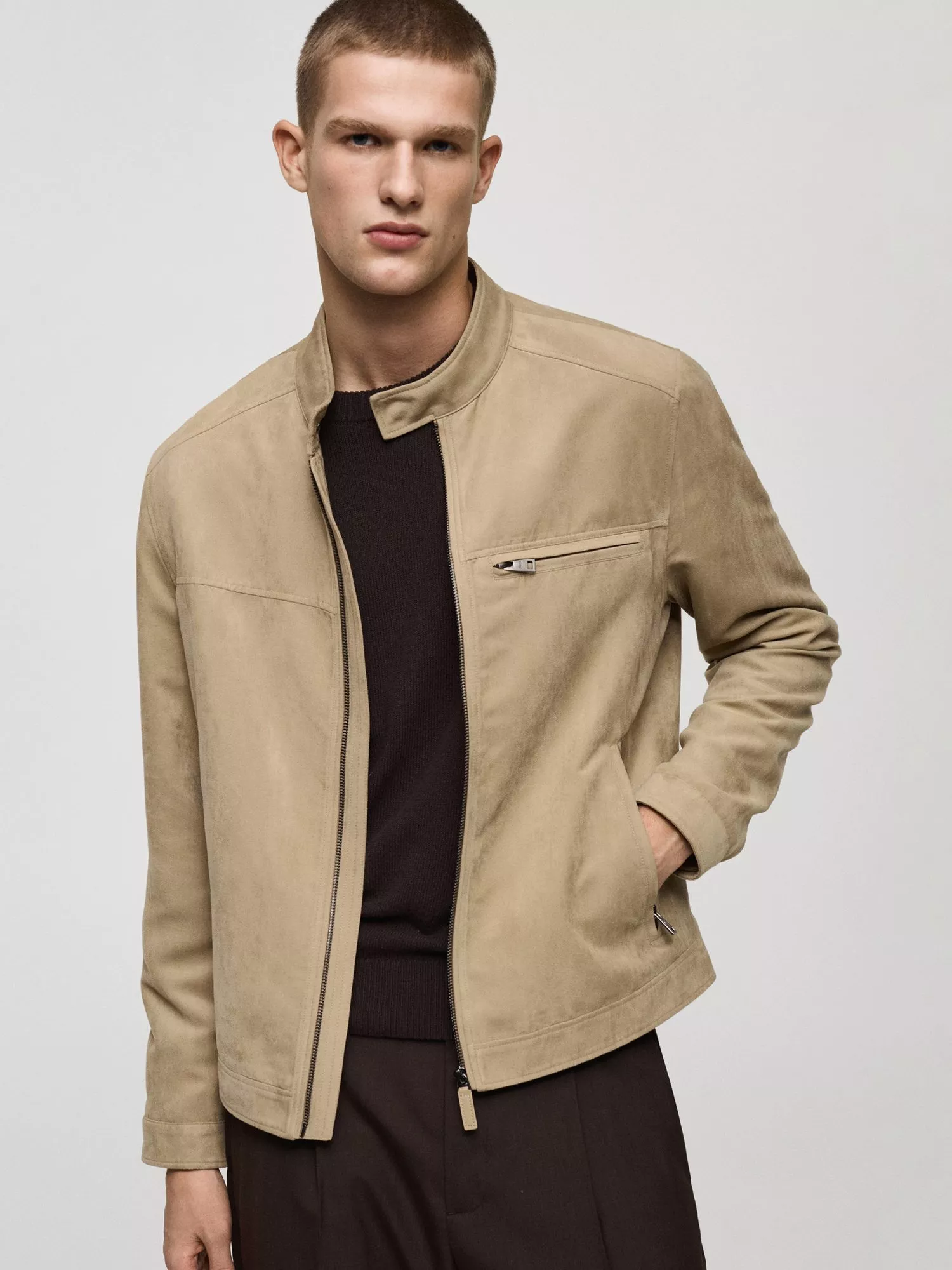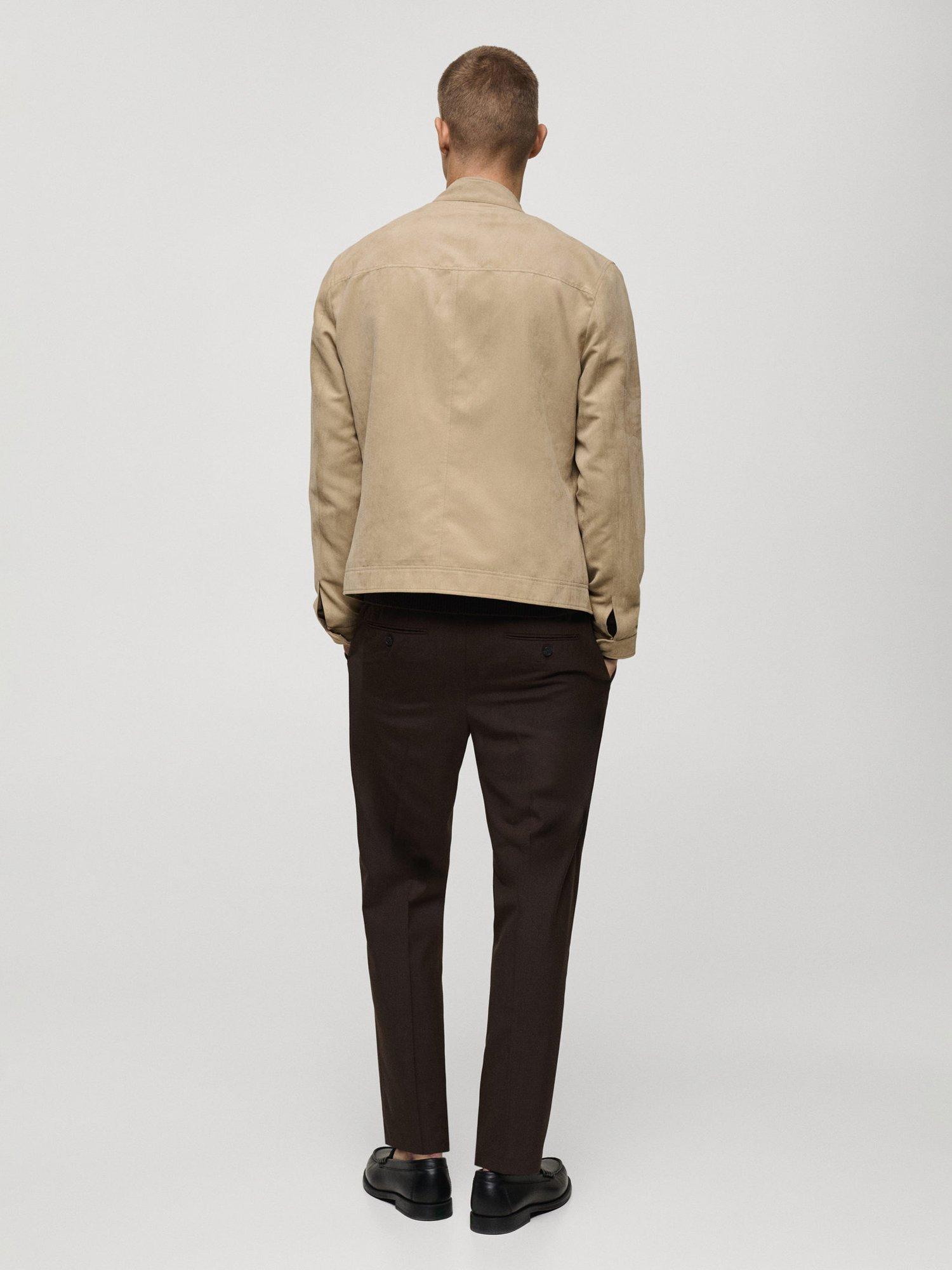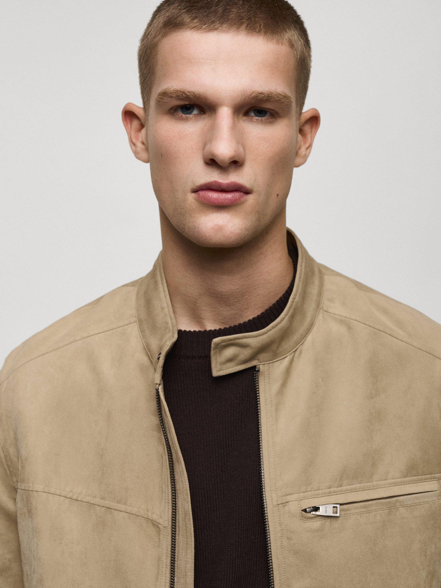 The Boy Biker jacket from Mango is crafted from durable suede effect fabric, crafted purely from polyester. It has a funnel neck with loop and button closure, a welt and zip chest pocket, two front welt pockets with zipped closure, and is inner-lined.