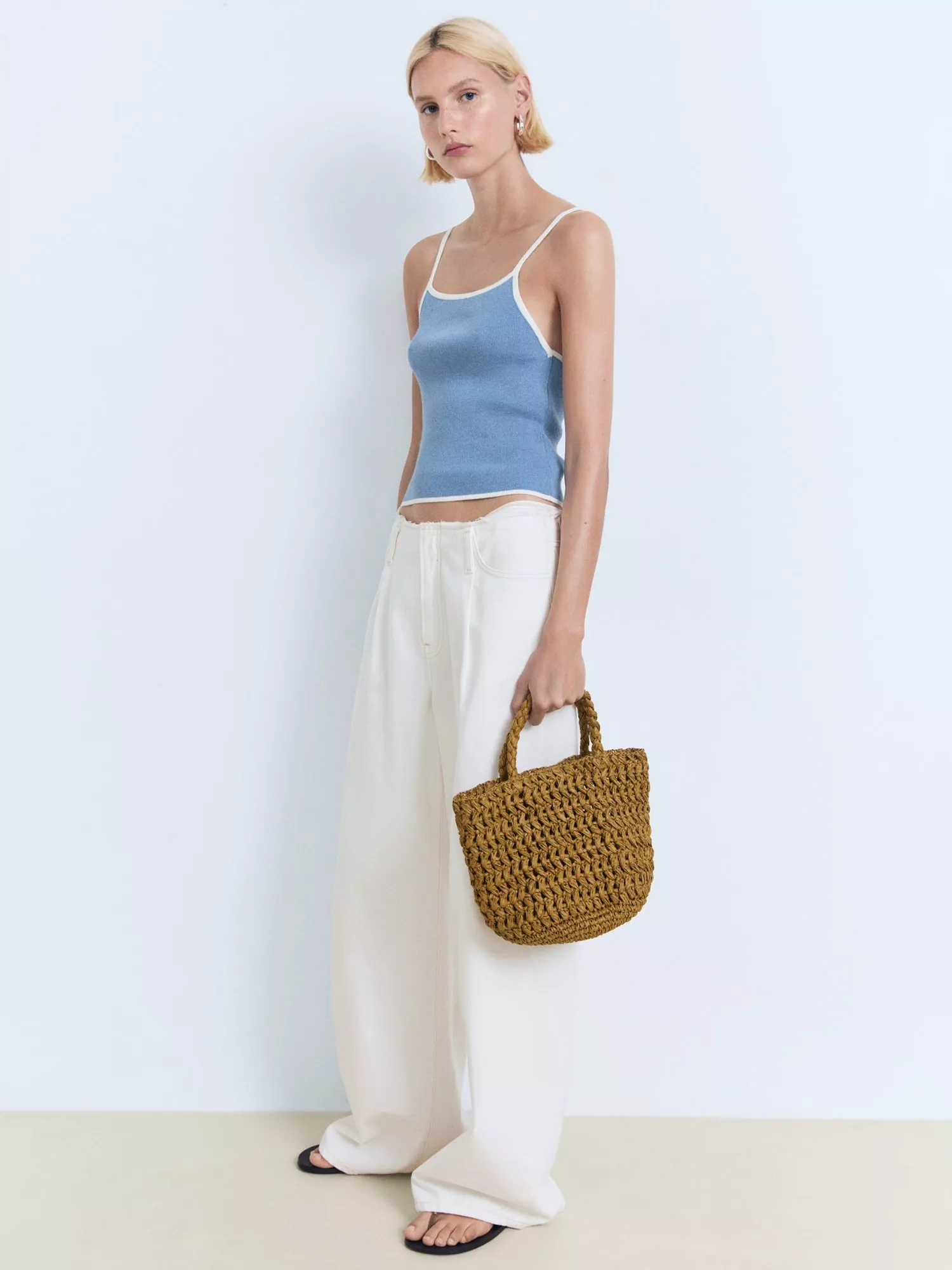 A contrast trim knit top from Mango. Soft cotton blended fabric and a modern square neckline carves the form, perfect worn with floaty midi skirts for summer days.