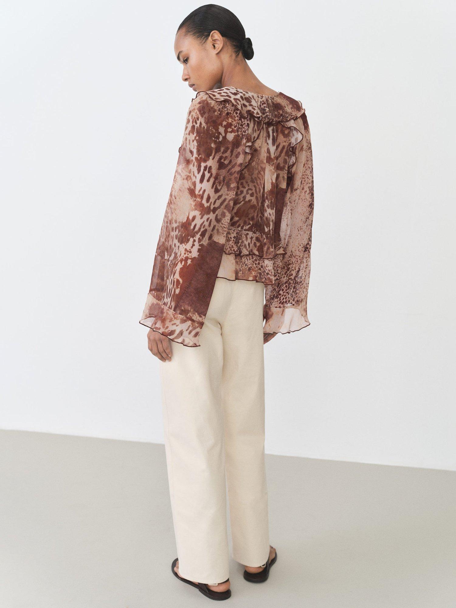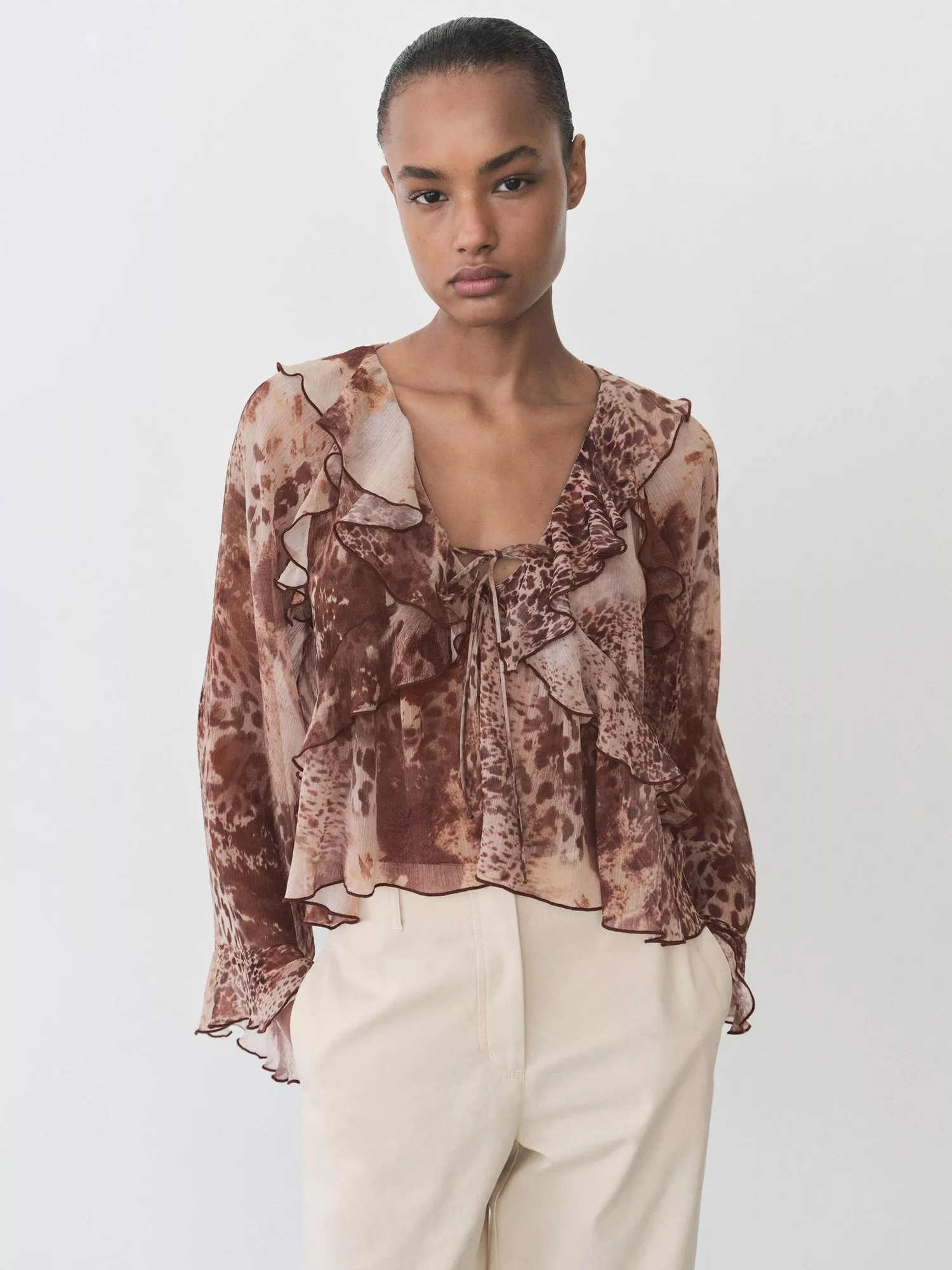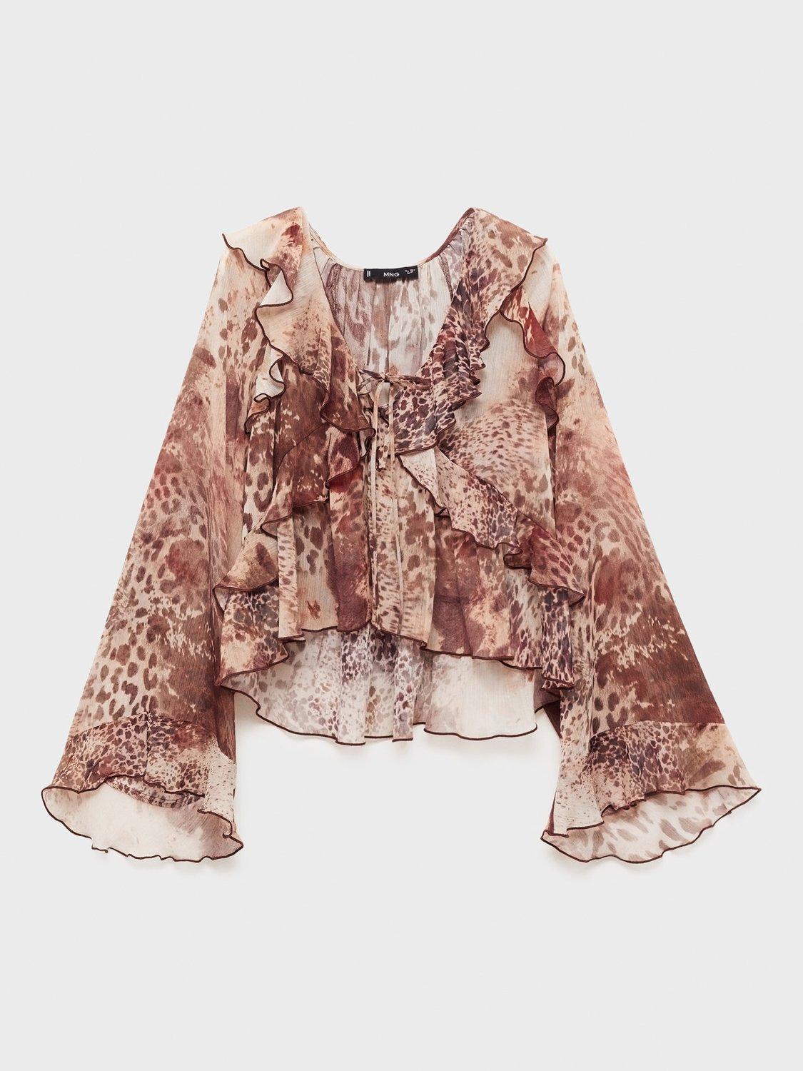 A breezy blouse from Mango, wrapped in an eye-catching animal print. With a ruffled v-neck and long flared sleeves, it's made from a lightweight, semi-sheer gauze fabric.