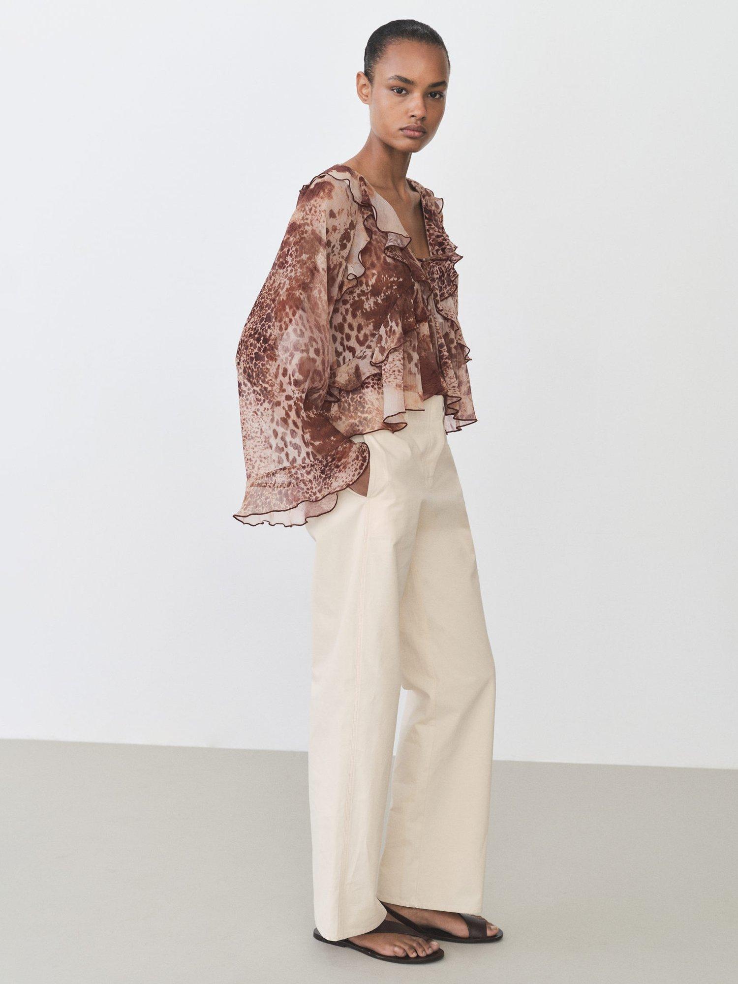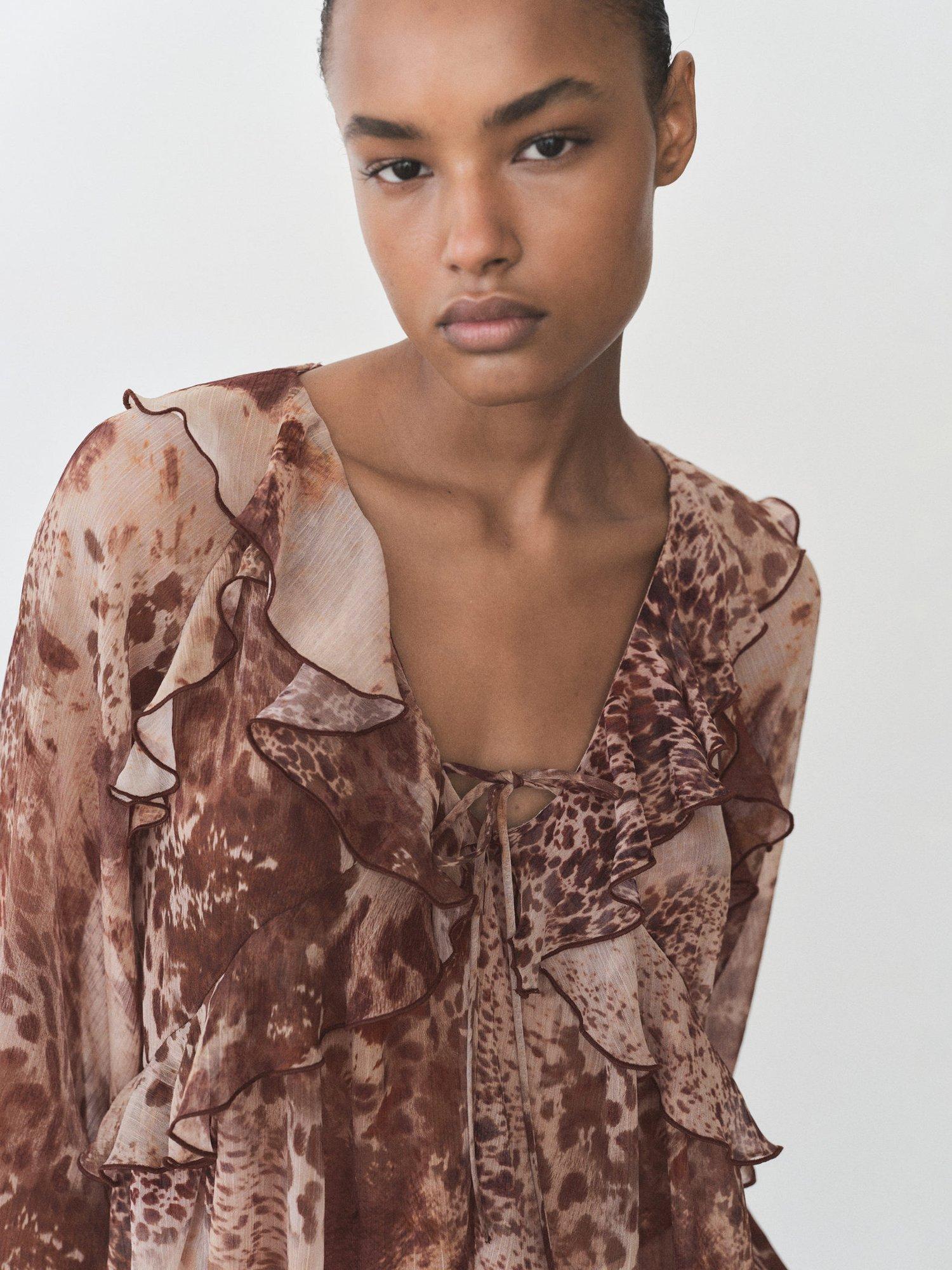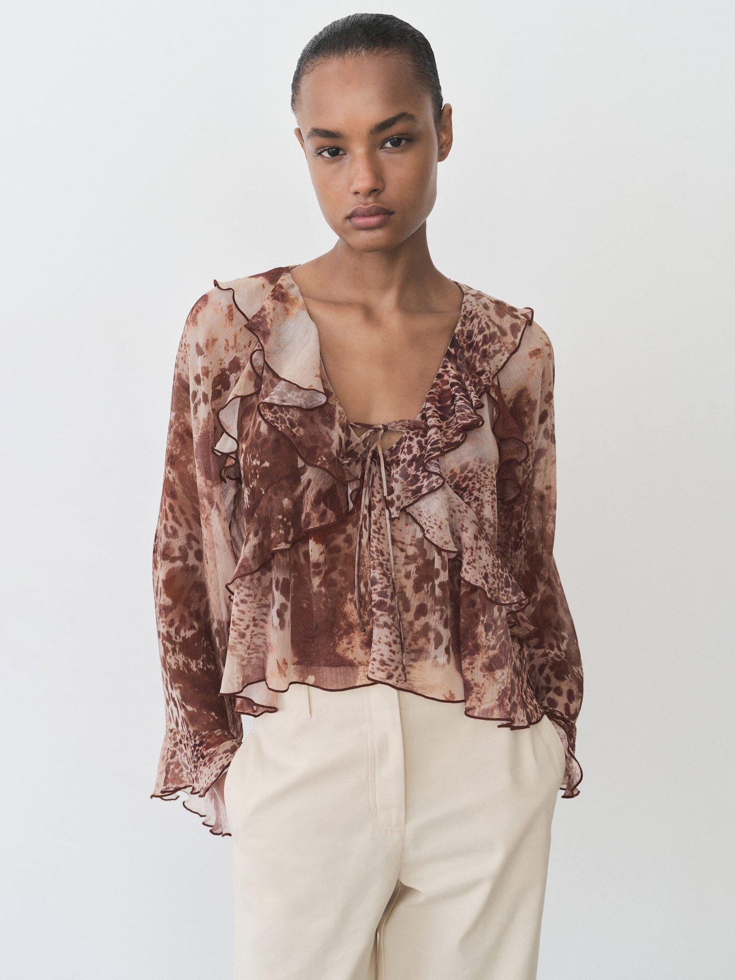 A breezy blouse from Mango, wrapped in an eye-catching animal print. With a ruffled v-neck and long flared sleeves, it's made from a lightweight, semi-sheer gauze fabric.