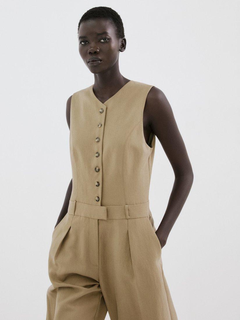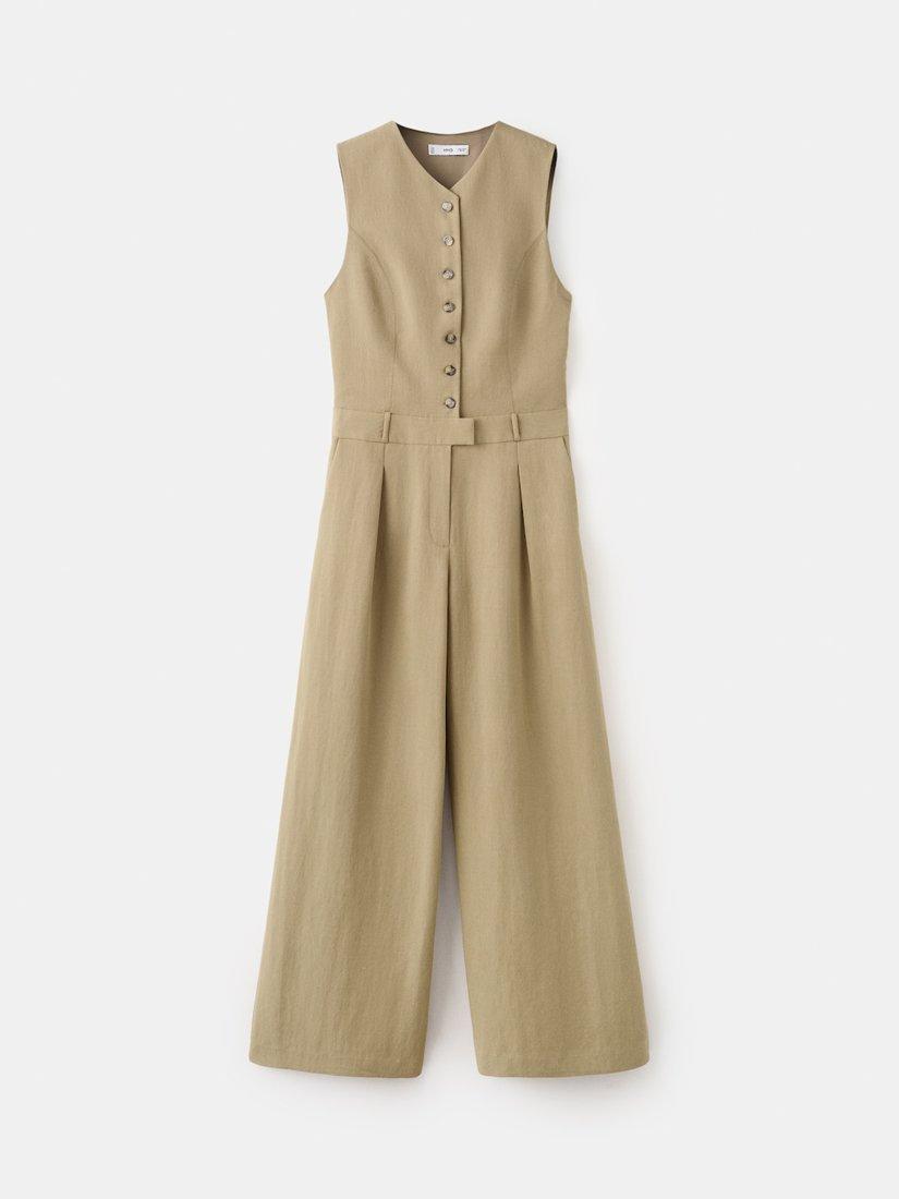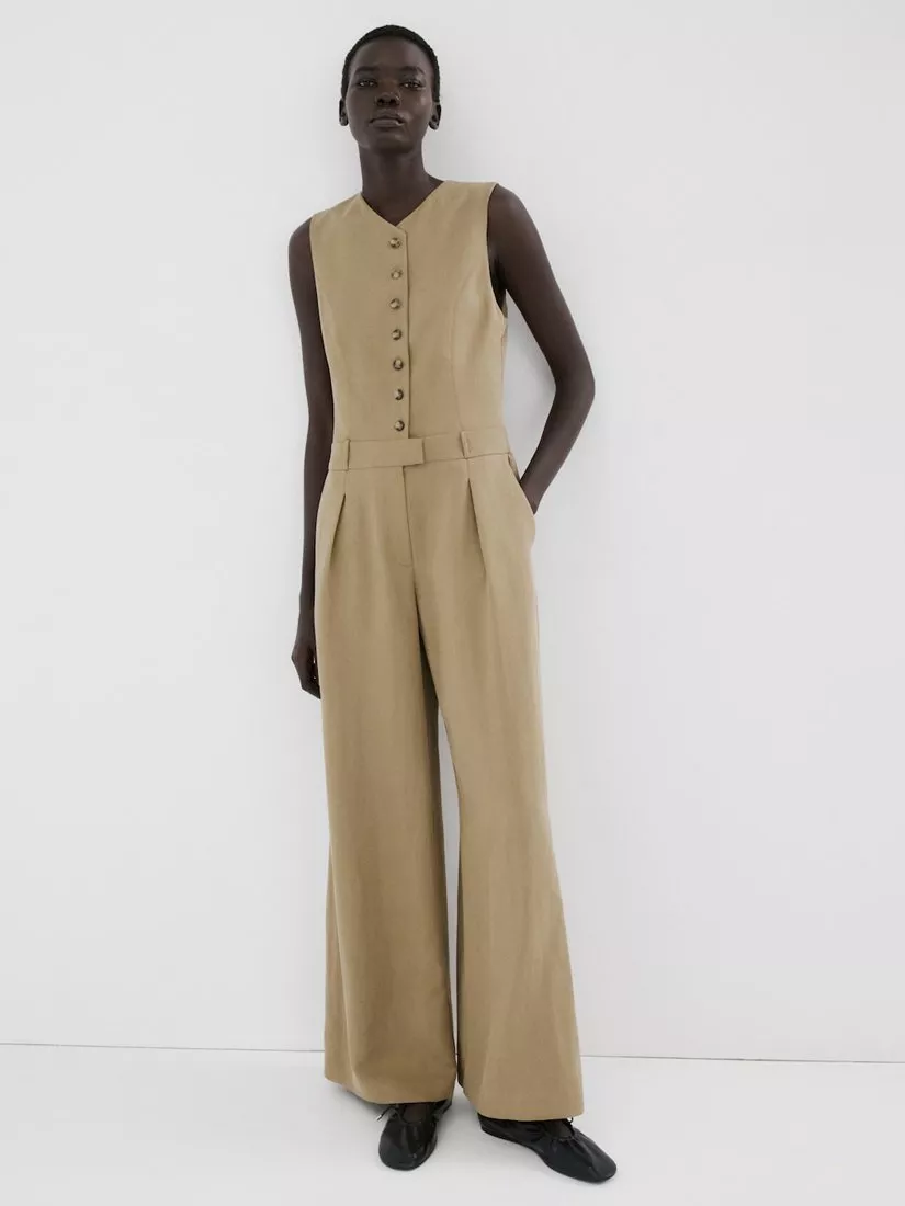 A sleeveless culotte jumpsuit featuring a cinched waist and a sweeping wide-leg. The V-neck style keeps things easy, while practical details make every outing more effortless.