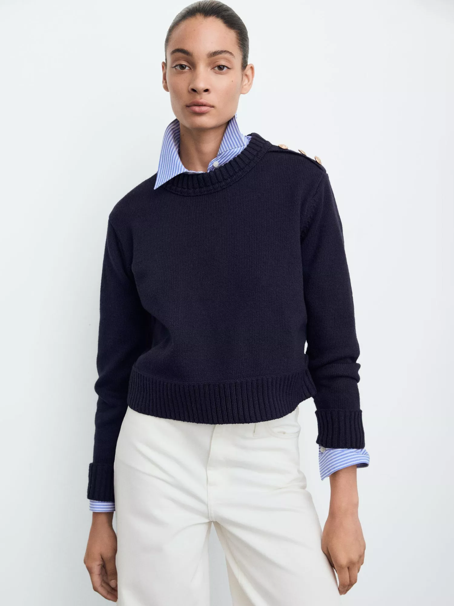 With a wide-ribbed neckline and cuffs, this chunky jumper by Mango is finished with buttons at the shoulder for a modern feel.