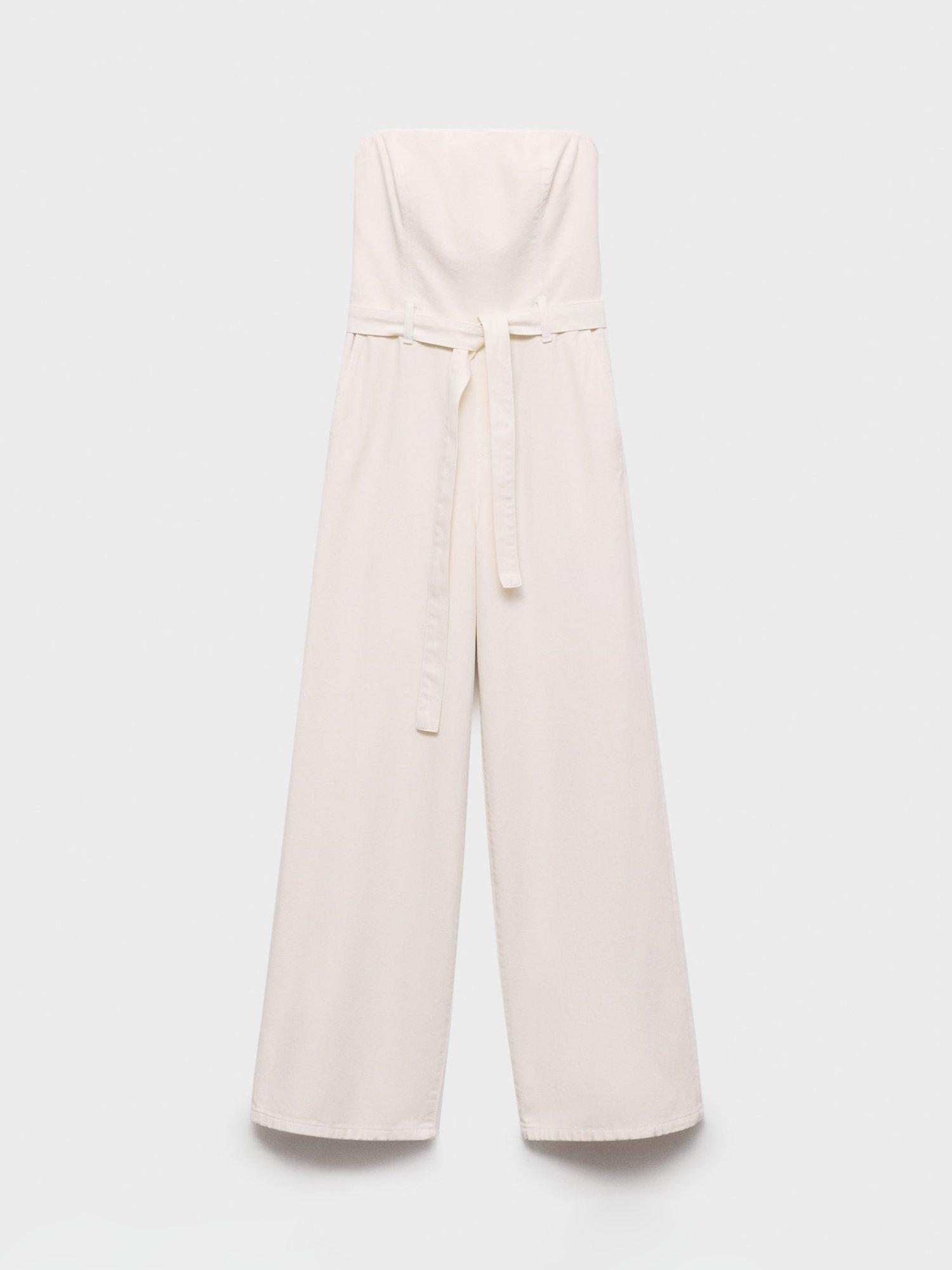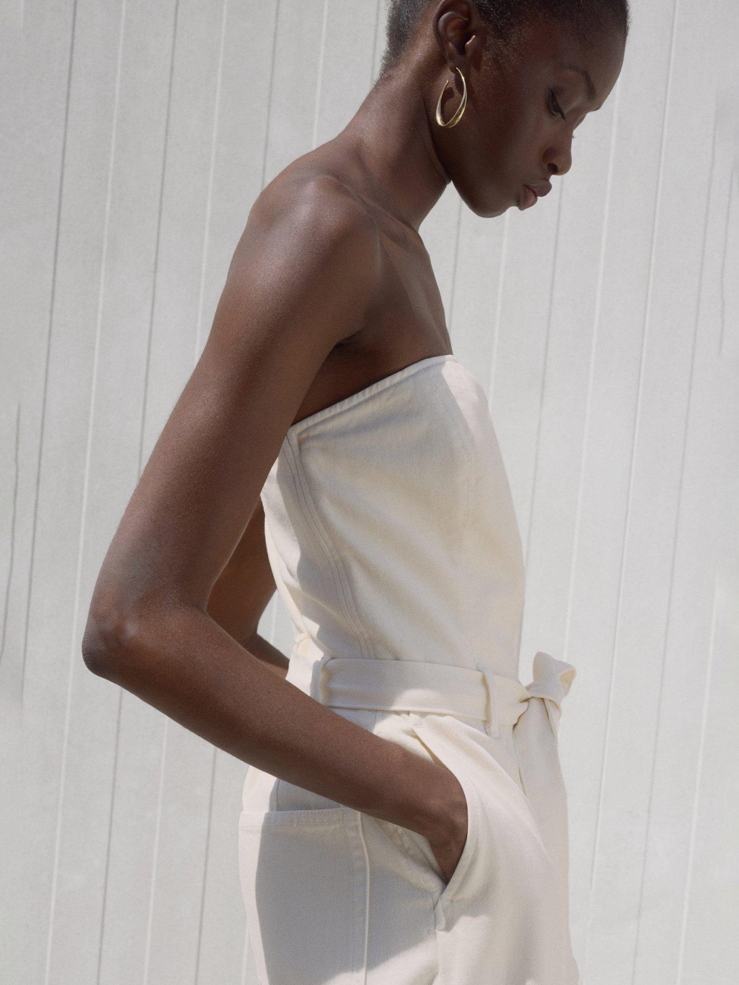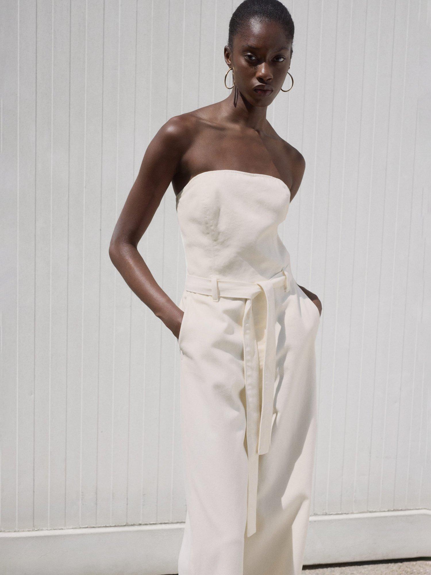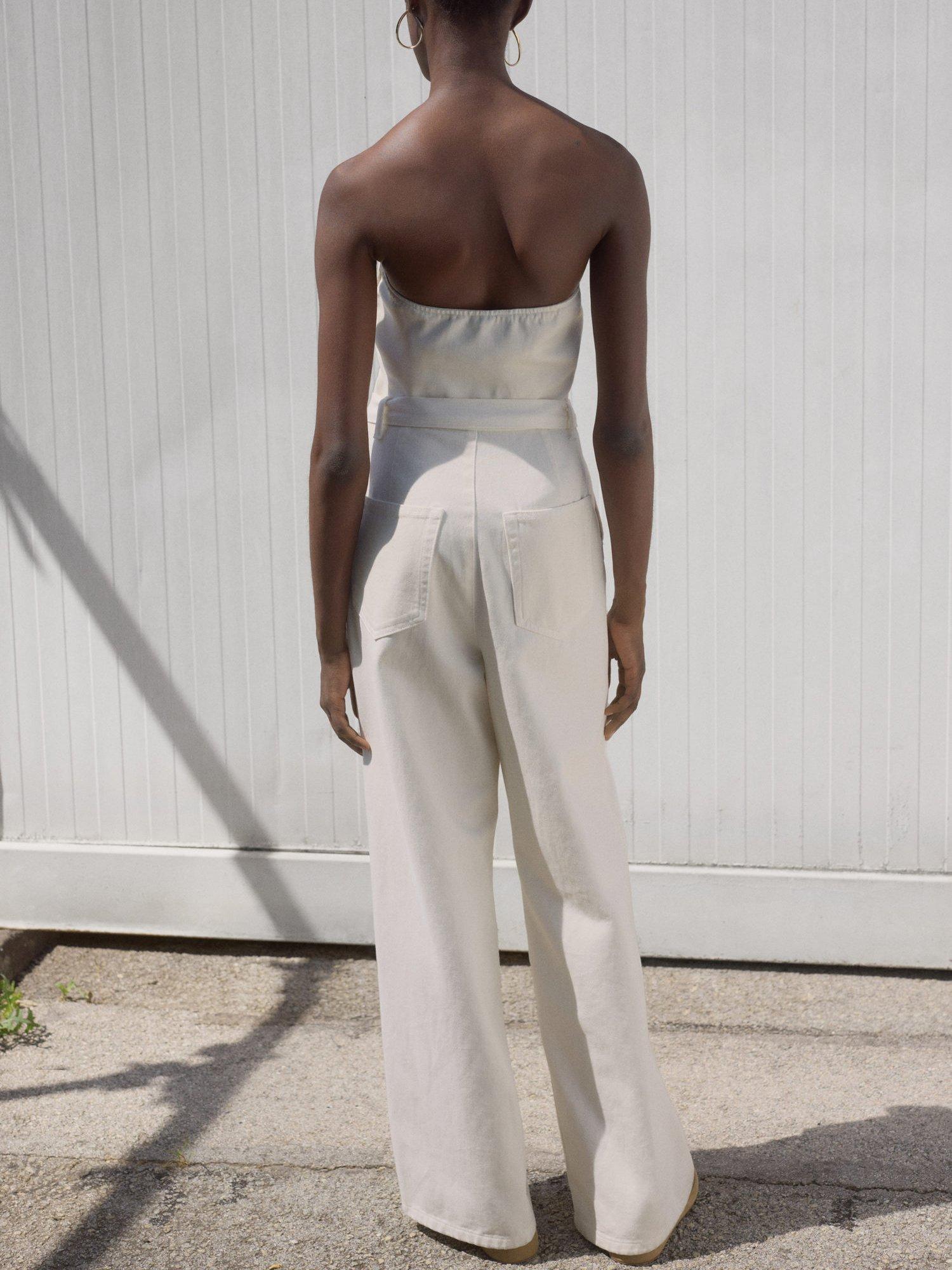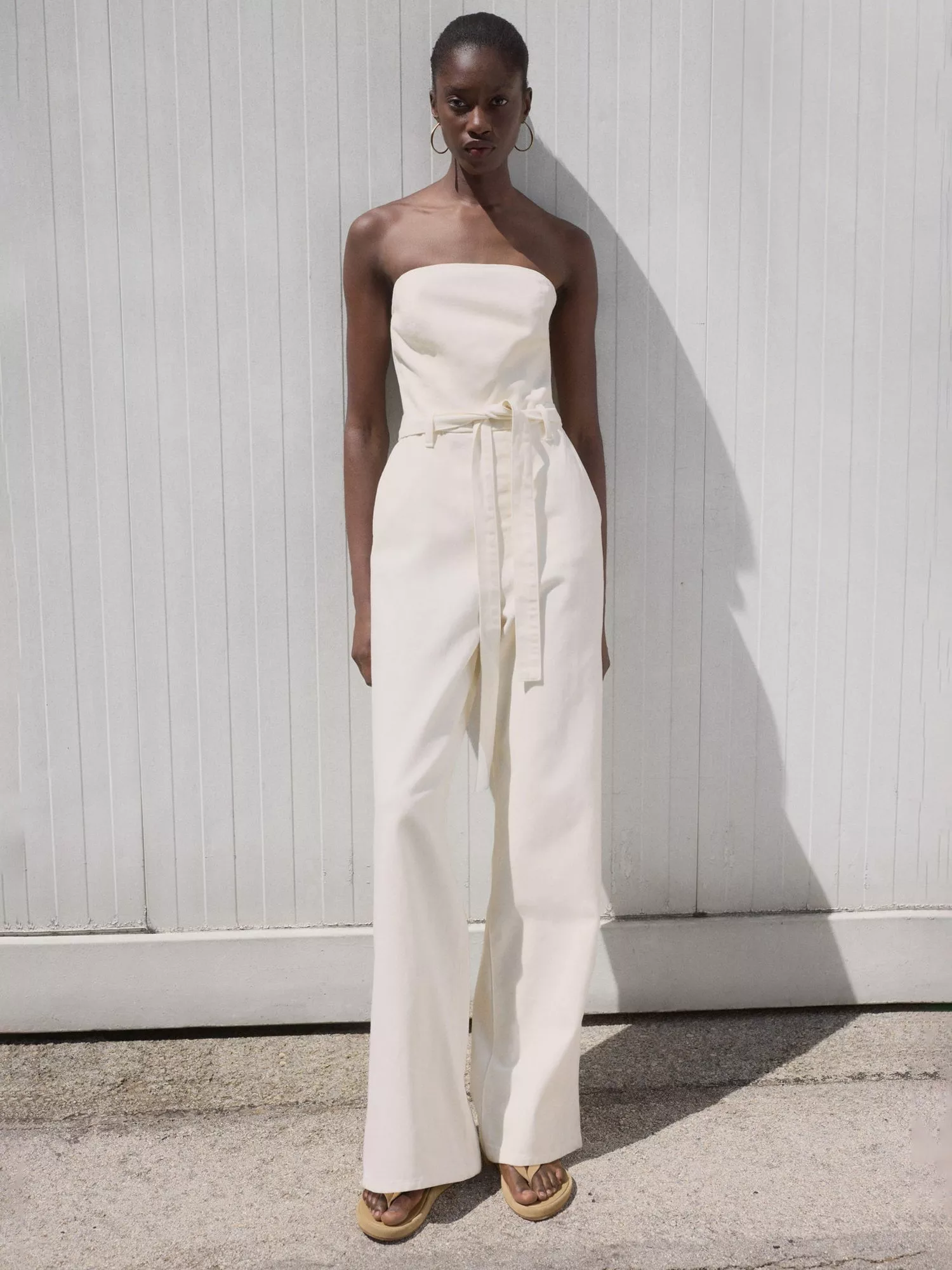 This cotton denim jumpsuit features a bandeau neckline, tailored straight legs, and a self-tie belted waist. Its clever silhouette keeps you comfortable while offering a confident look, perfect for day to night plans. Complete with a zip fastening.