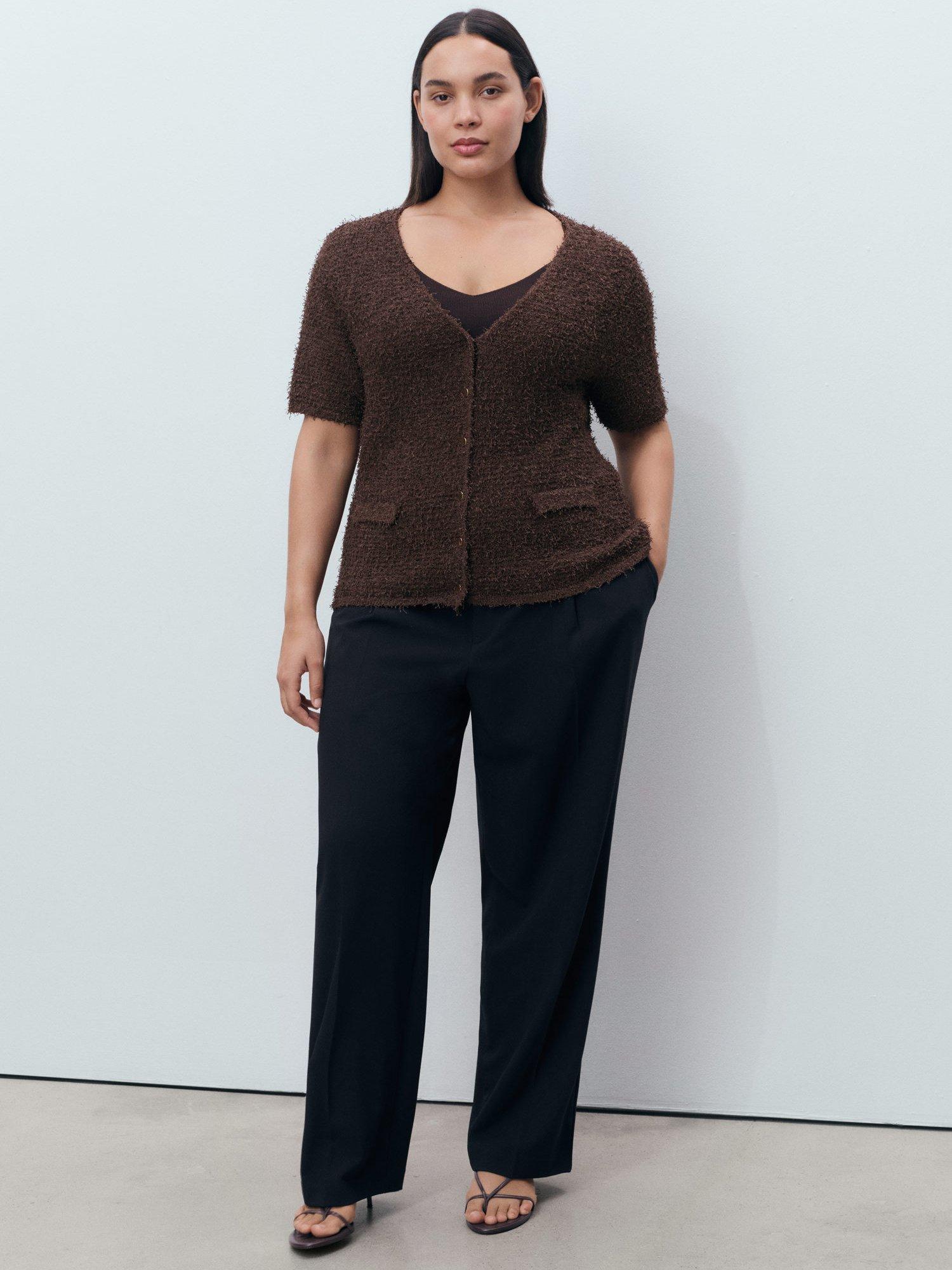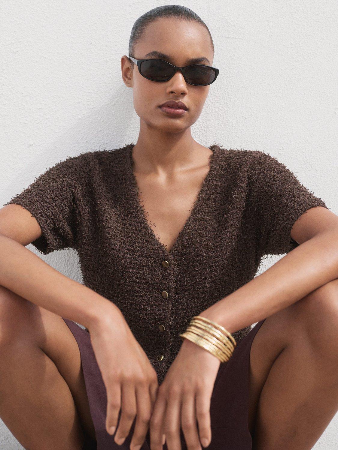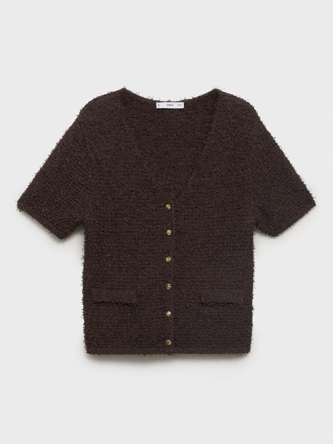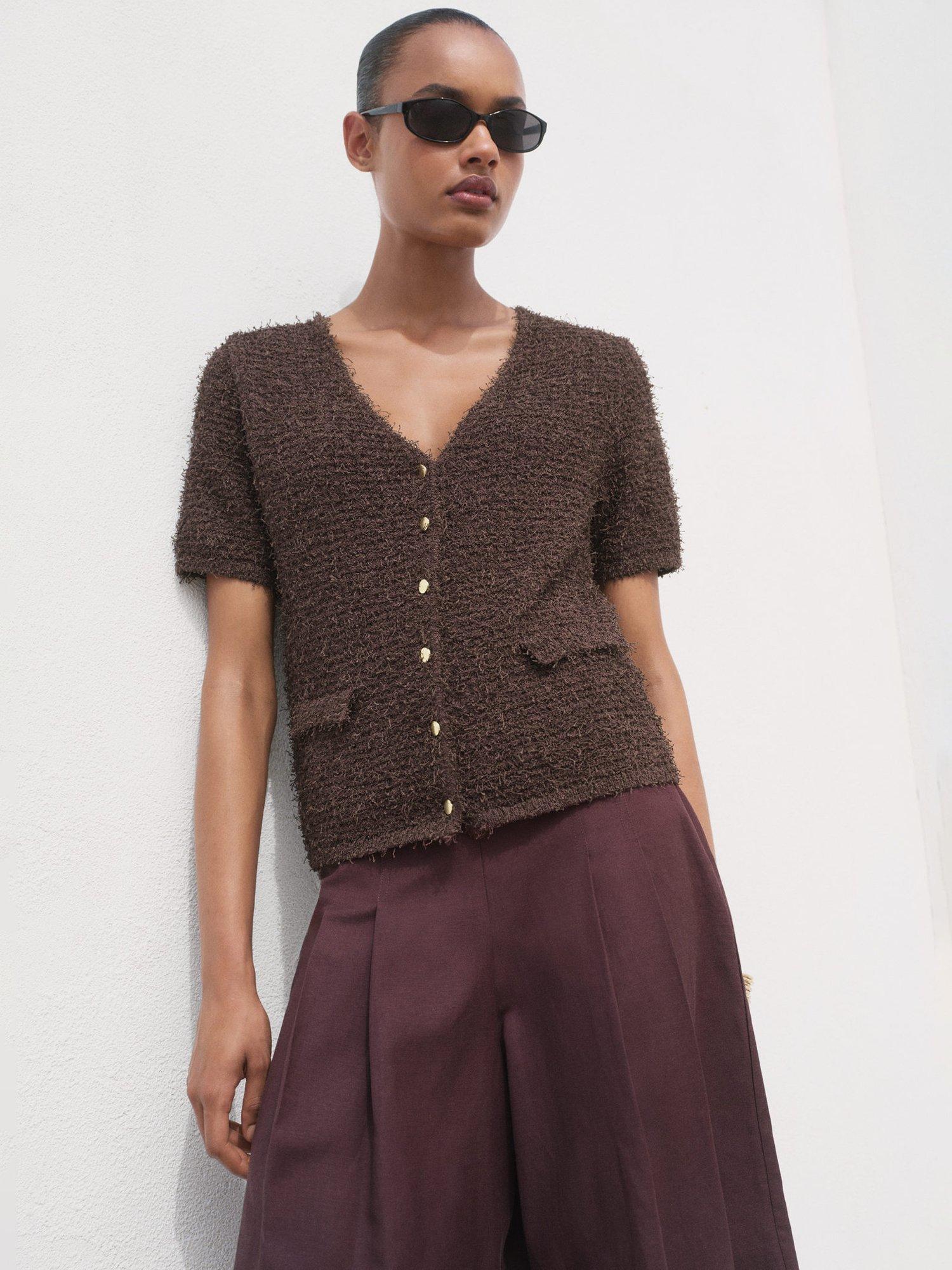This Mango fluffy bouclé jacket offers a unique textured look with a flattering V-neck and short sleeves. The button fastening keeps you comfortable while adding a sharp touch to your everyday style.