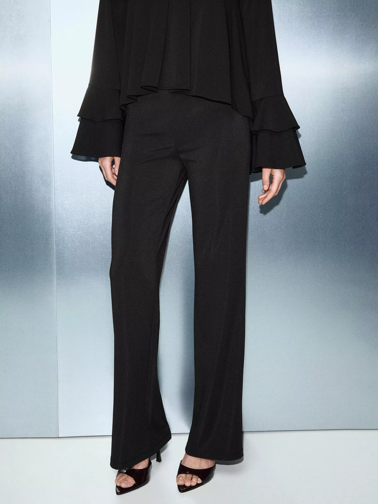 A pair of flared straight trousers from Mango. This style is cut to sit mid rise with a comfortable elasticated waistband and long hems.