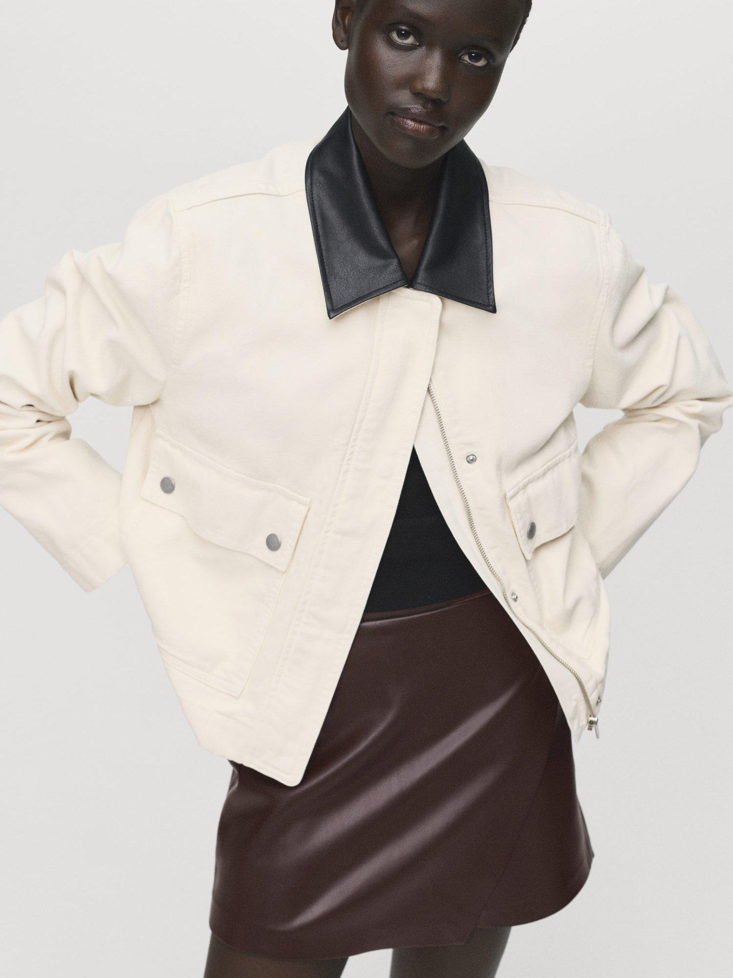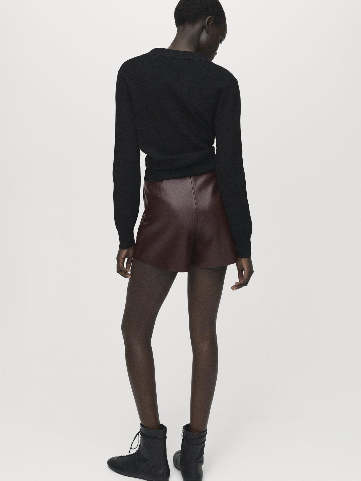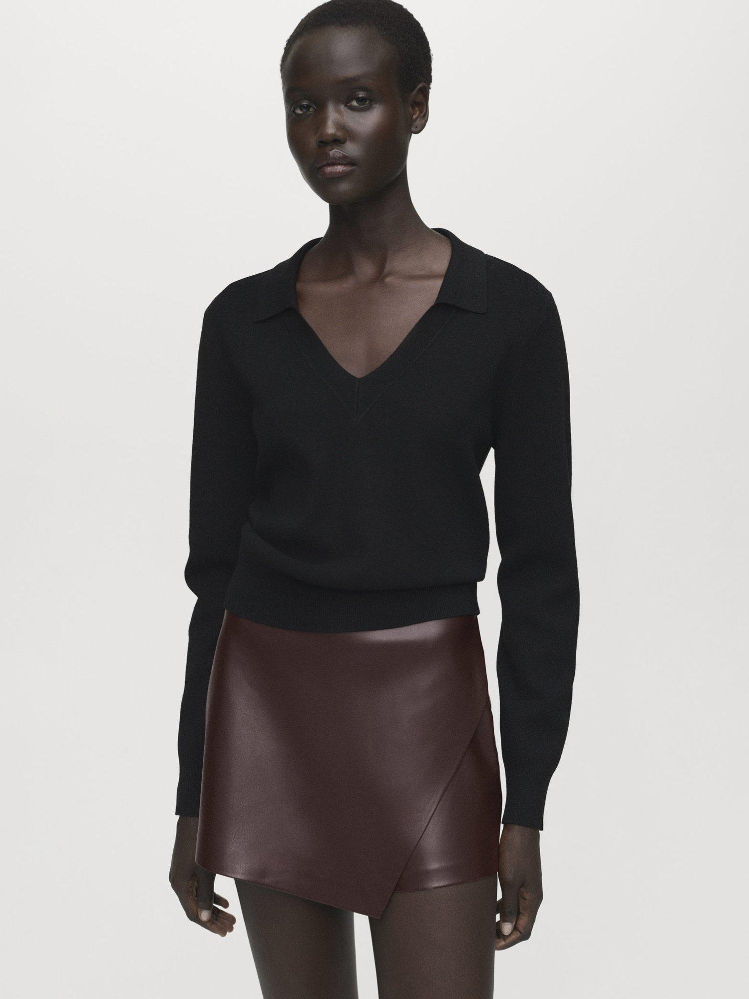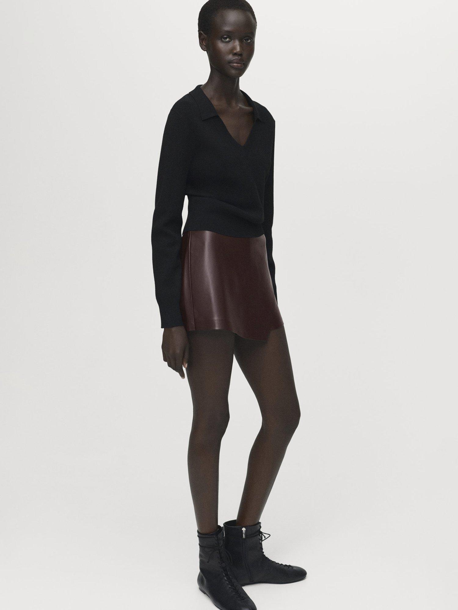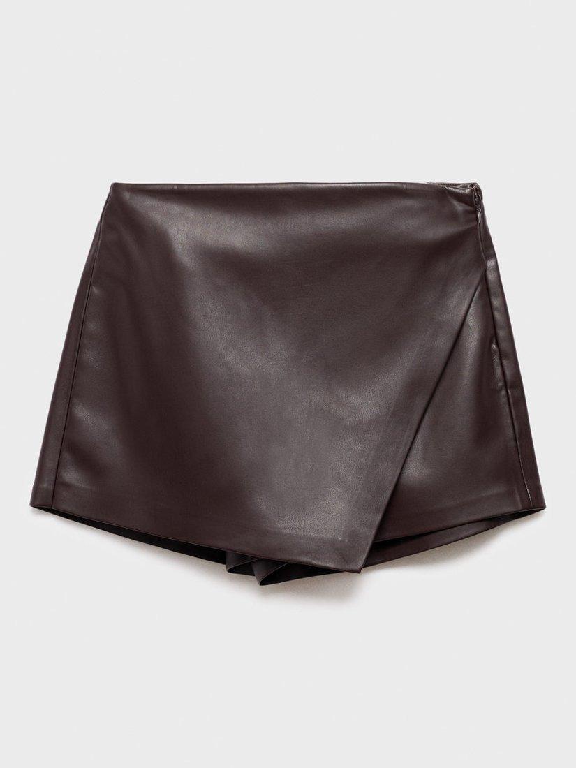 Lifting your everyday or party look, this faux leather wrap A-line mini skirt by Mango is built with a mid rise and fastens with a zip.
