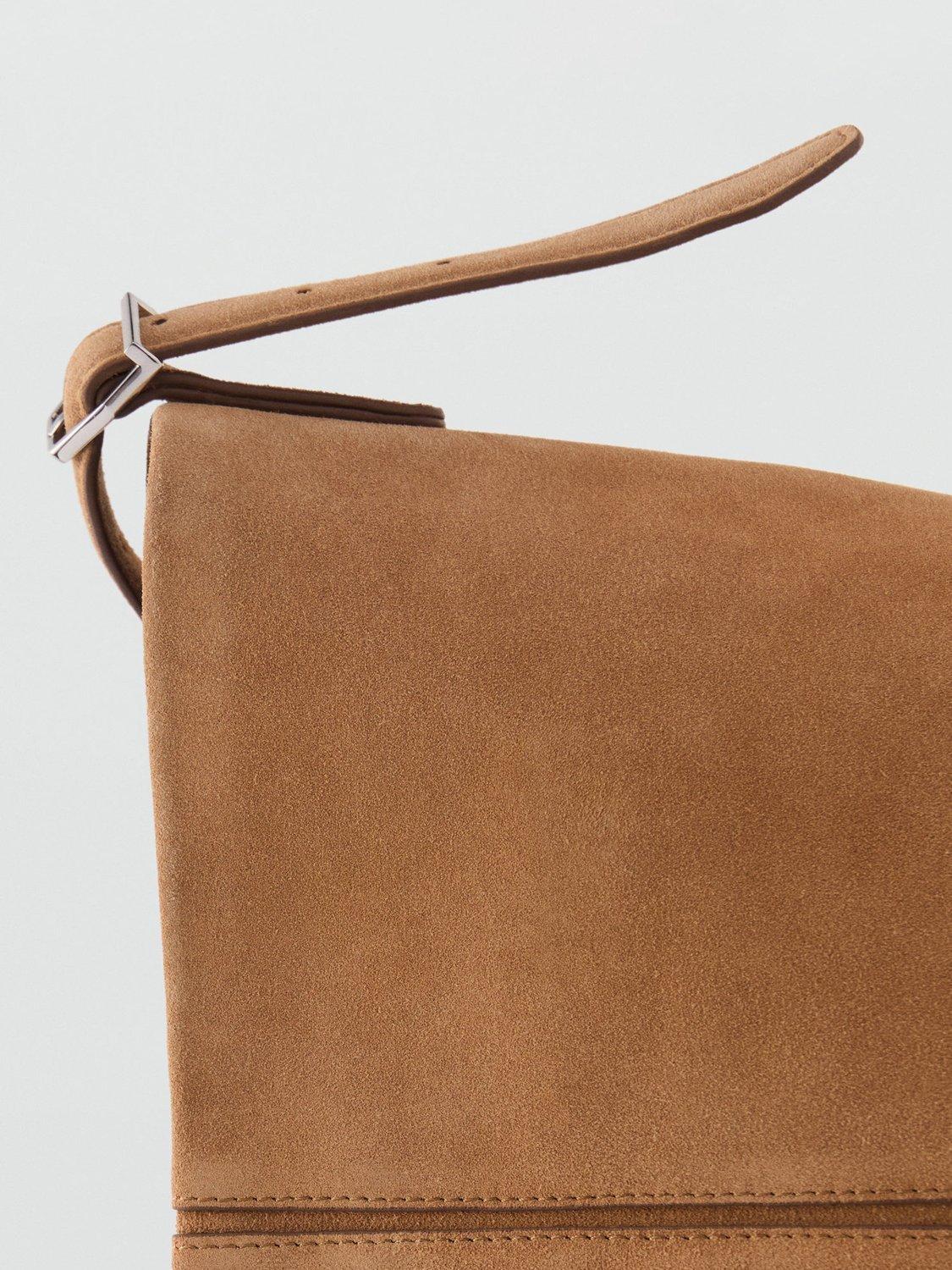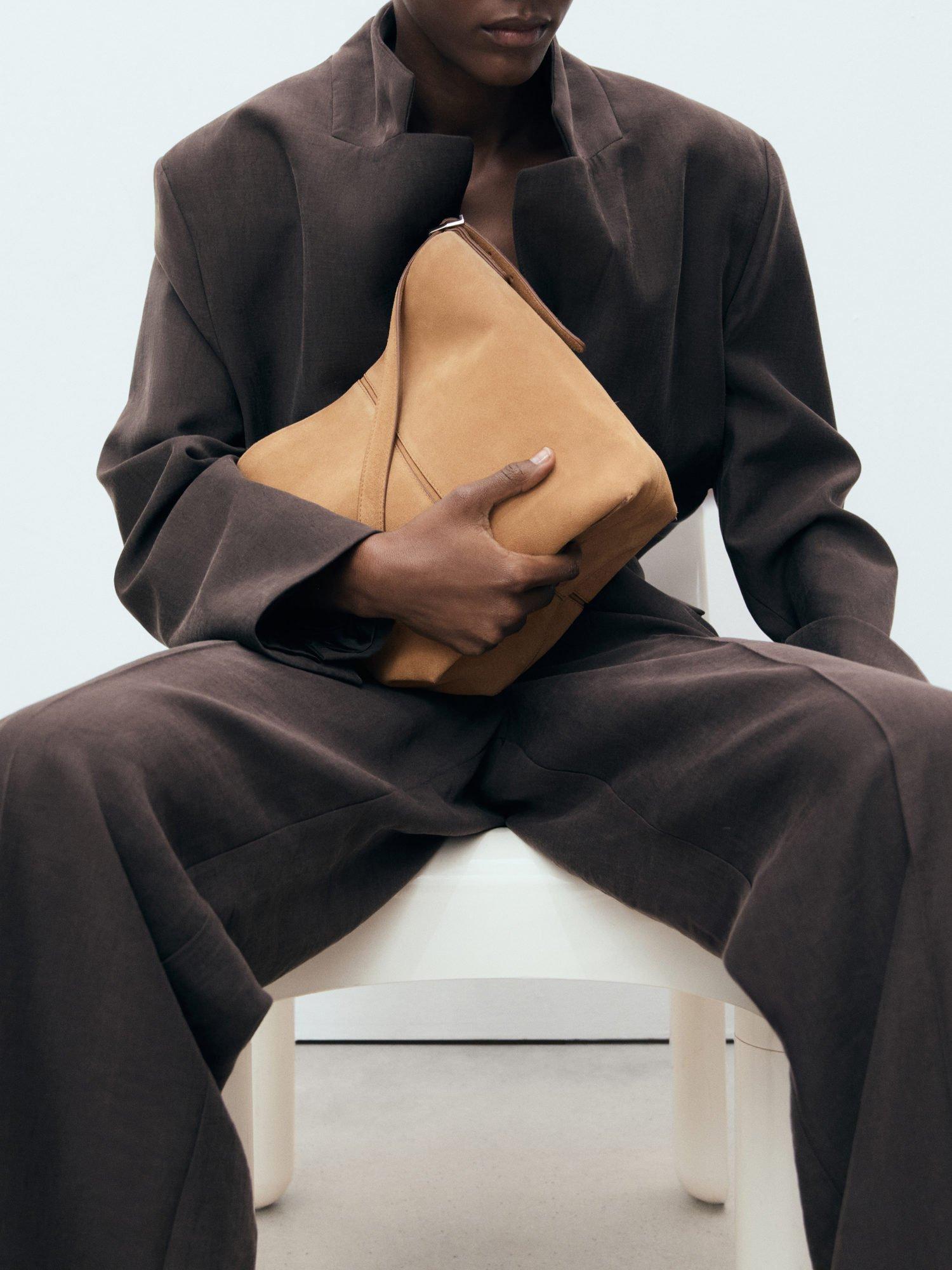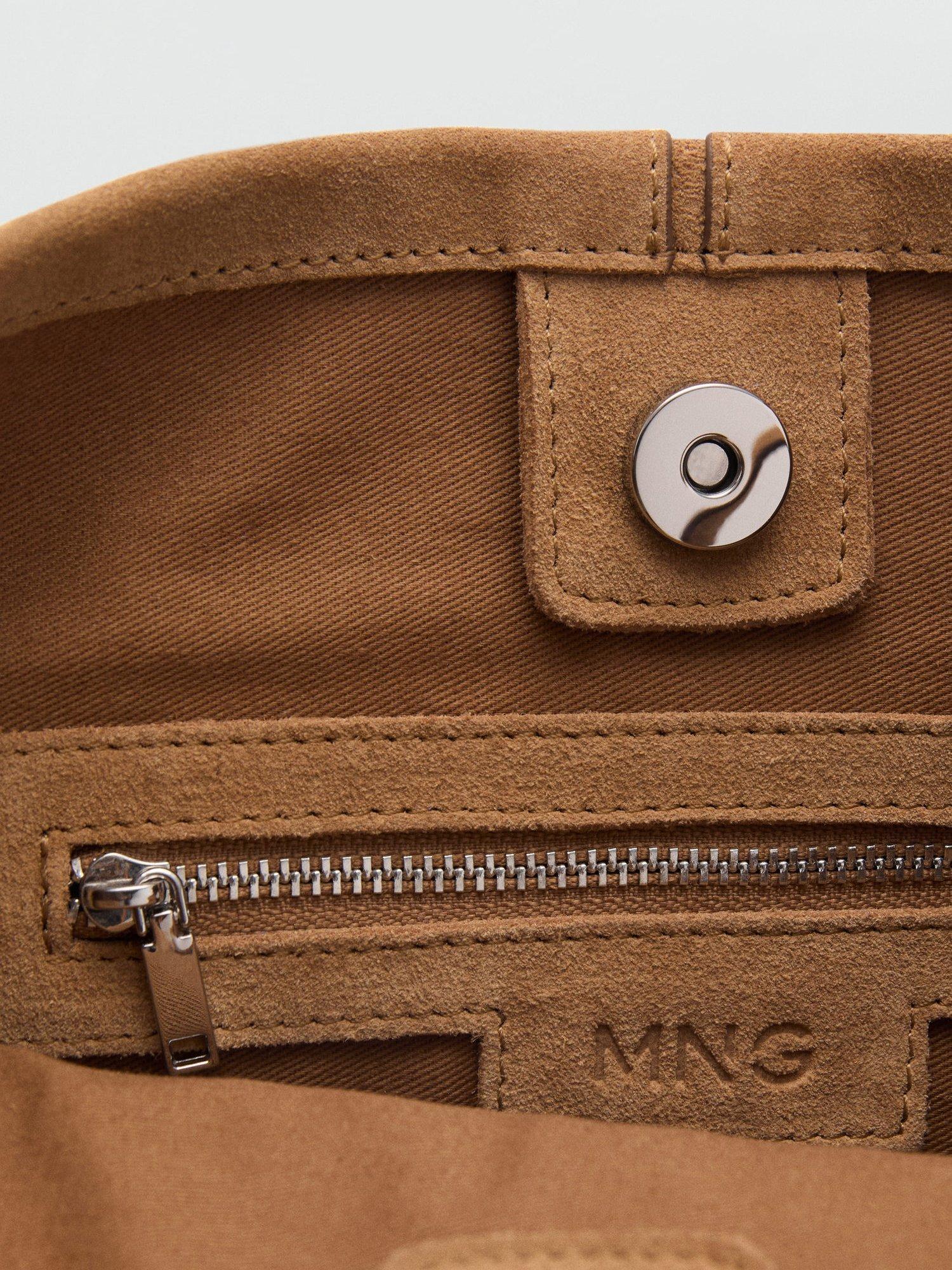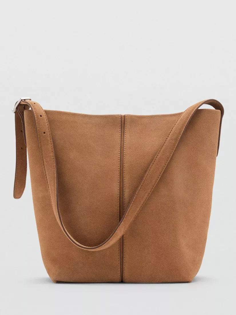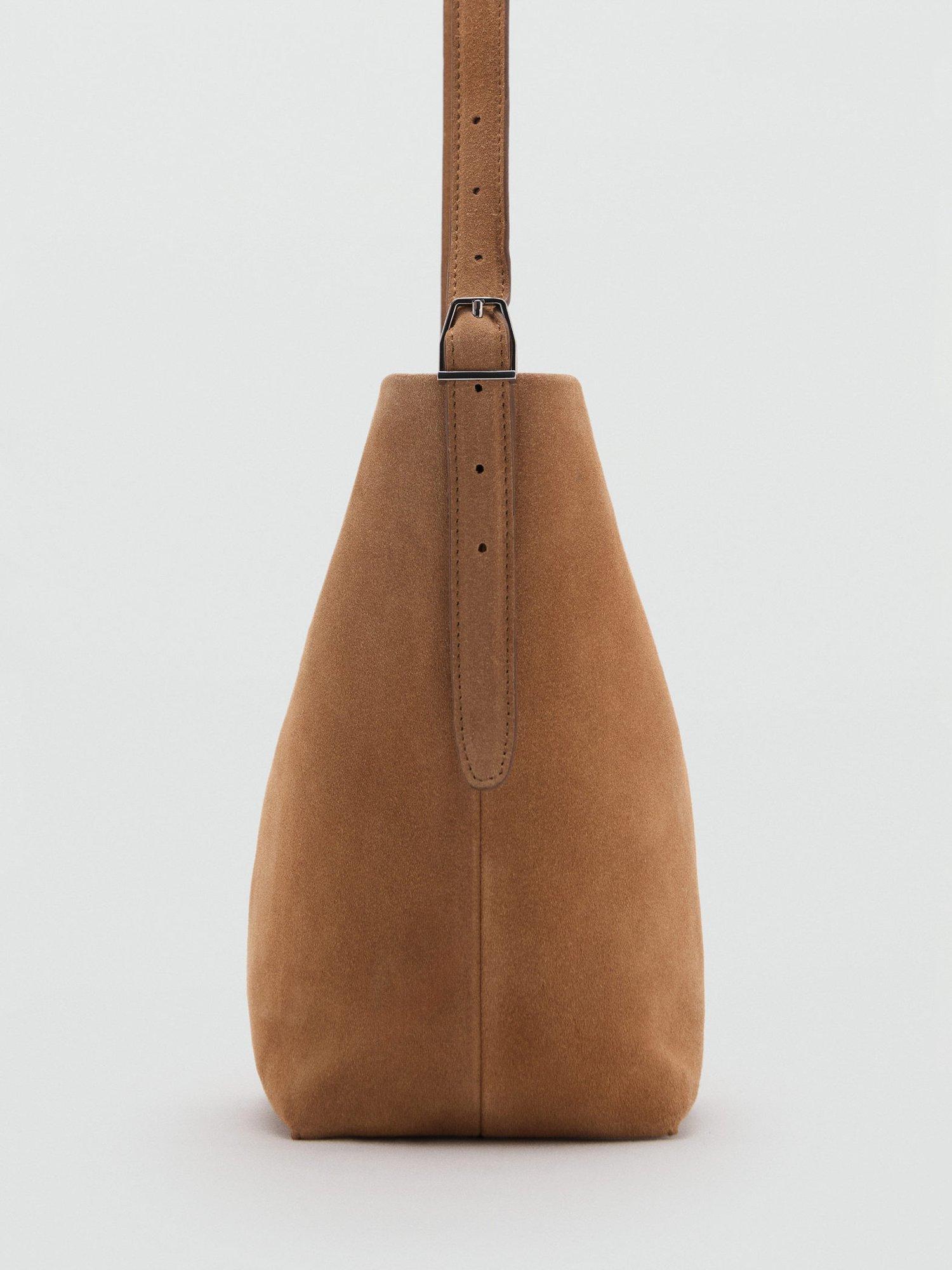 Small bucket bag made of 100% bovine leather with an adjustable shoulder strap, magnetic button closure and internal zipped pocket.