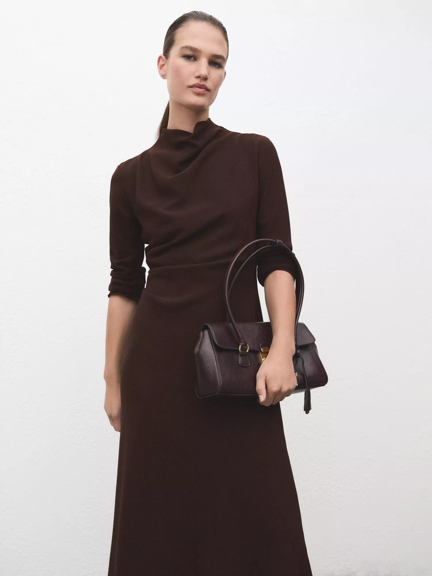 This midi dress features a ruched, draped shape with a high neck and long sleeves, offering comfort and style for your daytime plans. The lined finish gives you a polished look, making it easy to feel confident wherever you go.