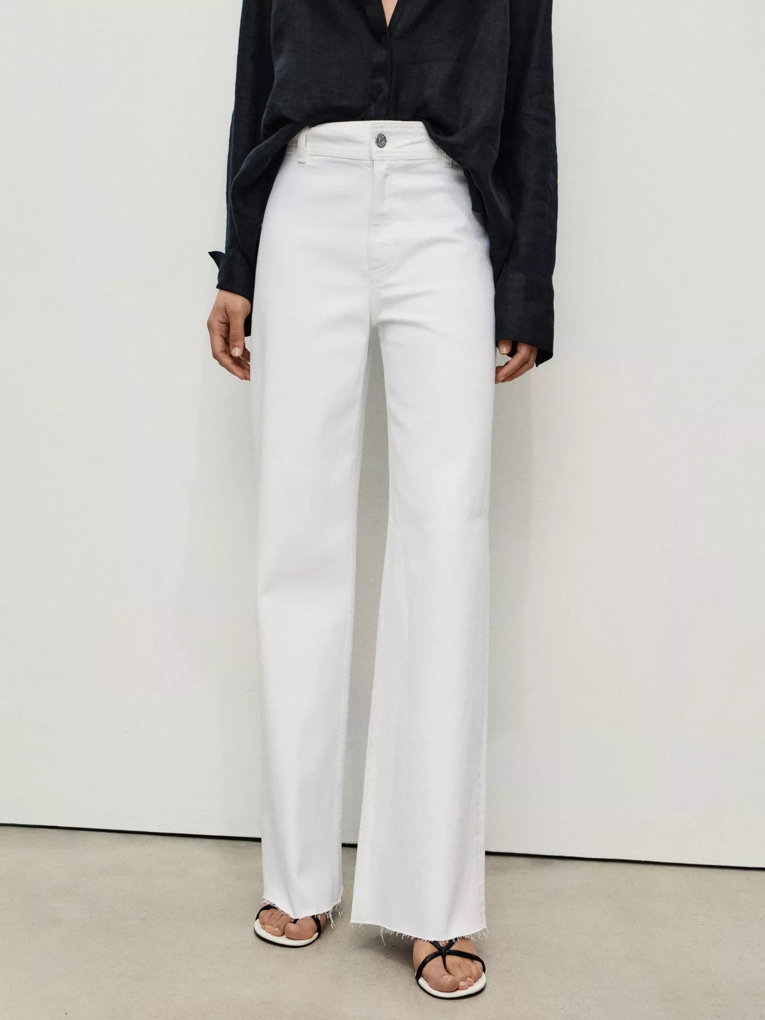 A pair of characteristically wide legged jeans from Mango. Made from a cotton blend with a comfortable mid rise, zip fly and frayed hems.