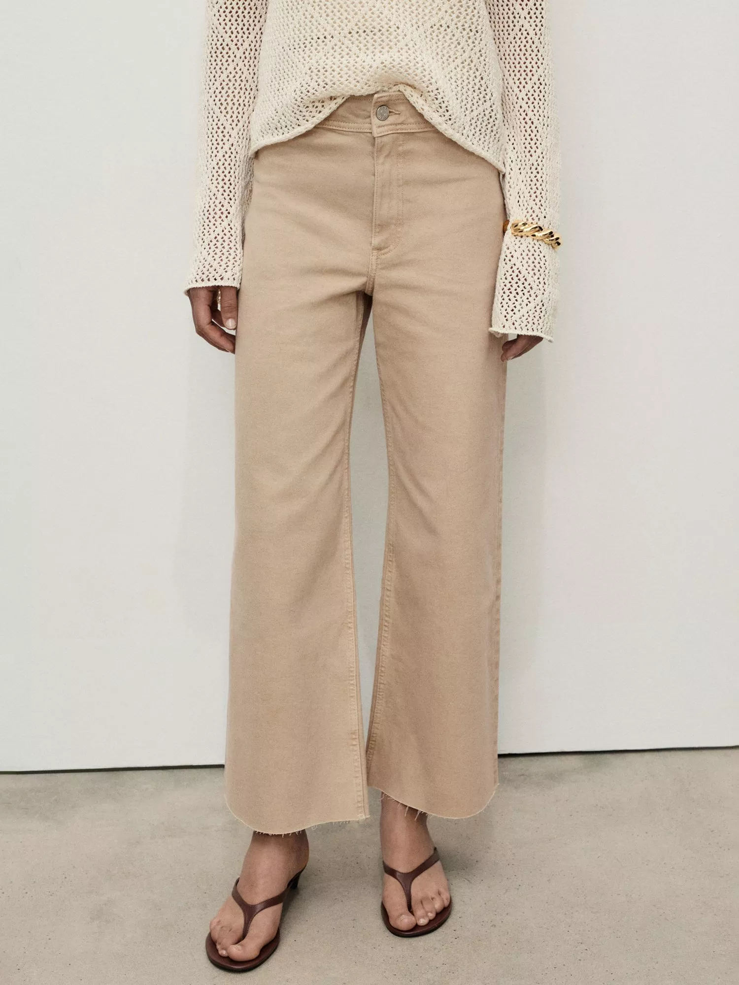 Falling to a flared, wide-leg, these high-waisted jean trousers by Mango come with frayed cropped cuffs. Plain for a versatile finish, mix and match with whatever the day demands.