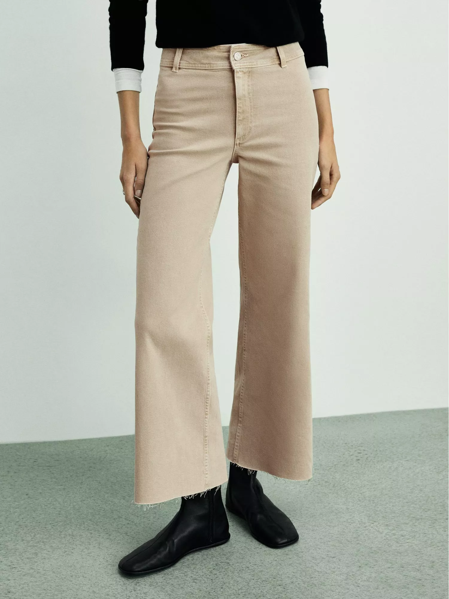 Falling to a flared, wide-leg, these high-waisted jean trousers by Mango come with frayed cropped cuffs. Plain for a versatile finish, mix and match with whatever the day demands.