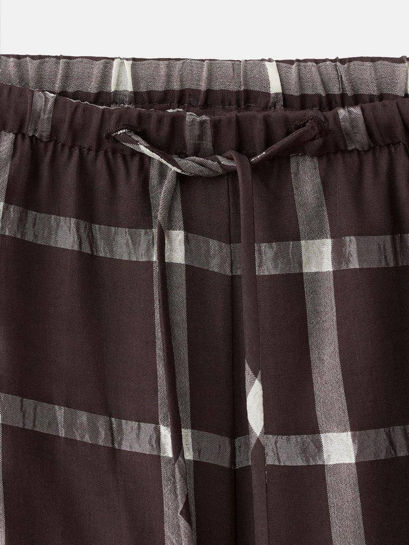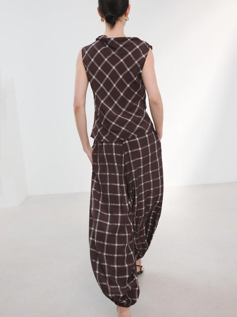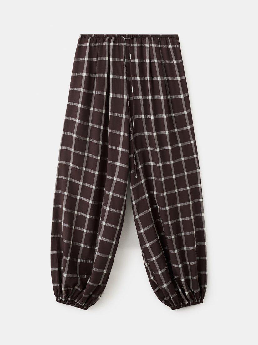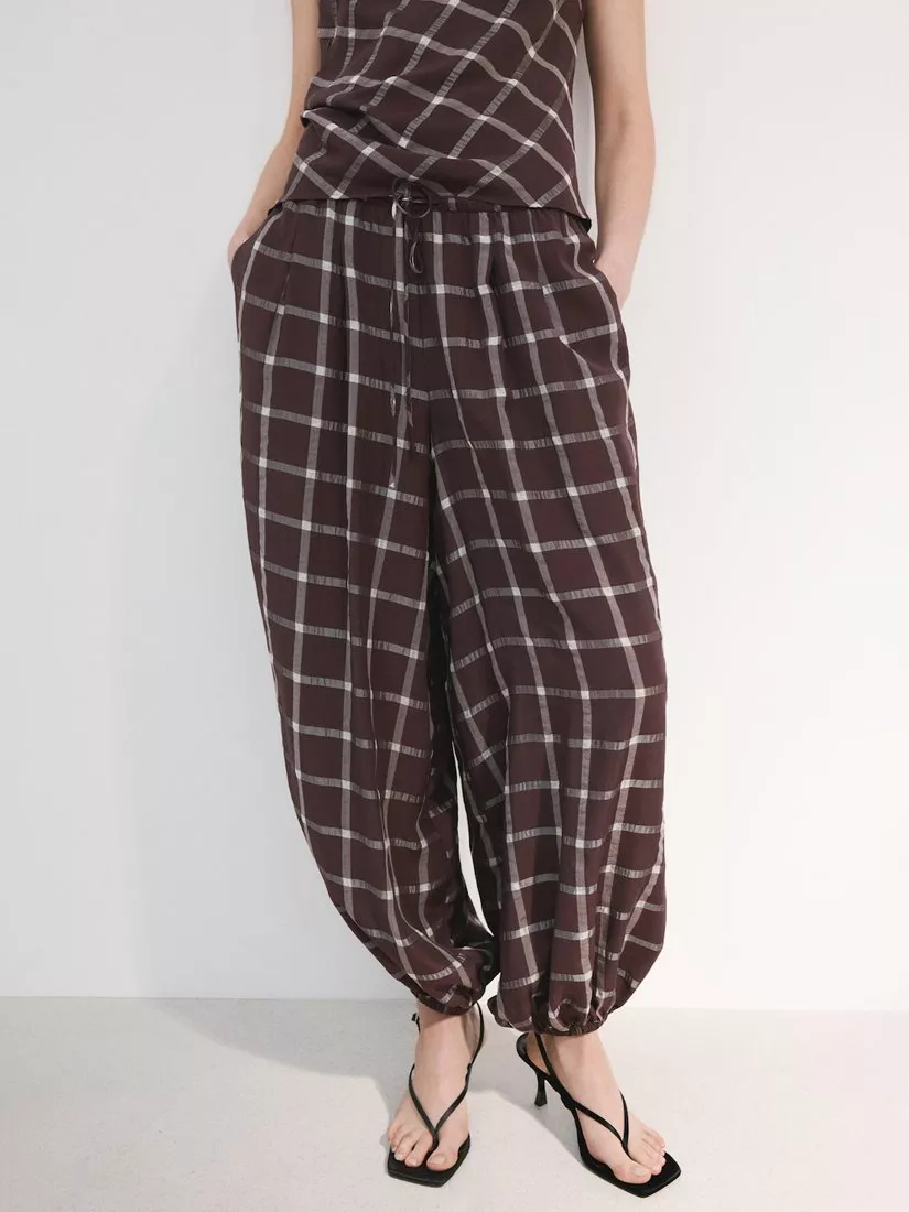 A pair of checked airy balloon trousers by Mango, cut to sit mid rise with a drawstring waist and gathered ankles for a relaxed look.
