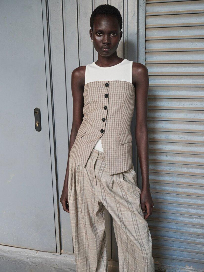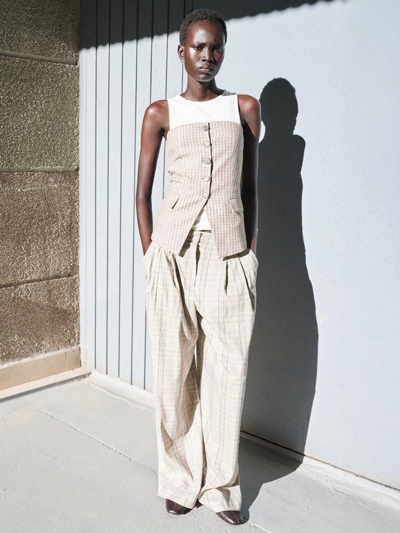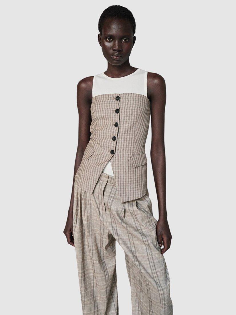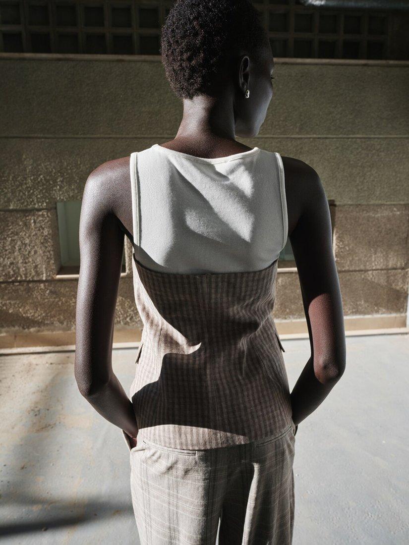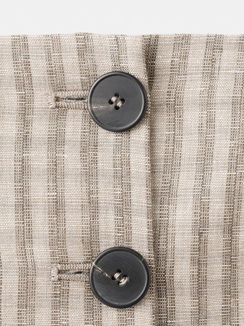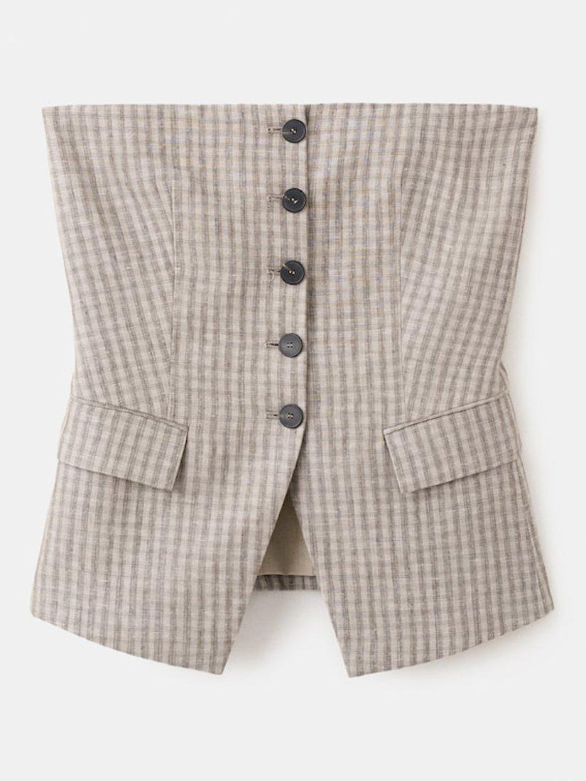 Sculptural bandeau top with a touch of linen, tailored button-front silhouette and wide straps for a sleek statement that carries from day to evening.