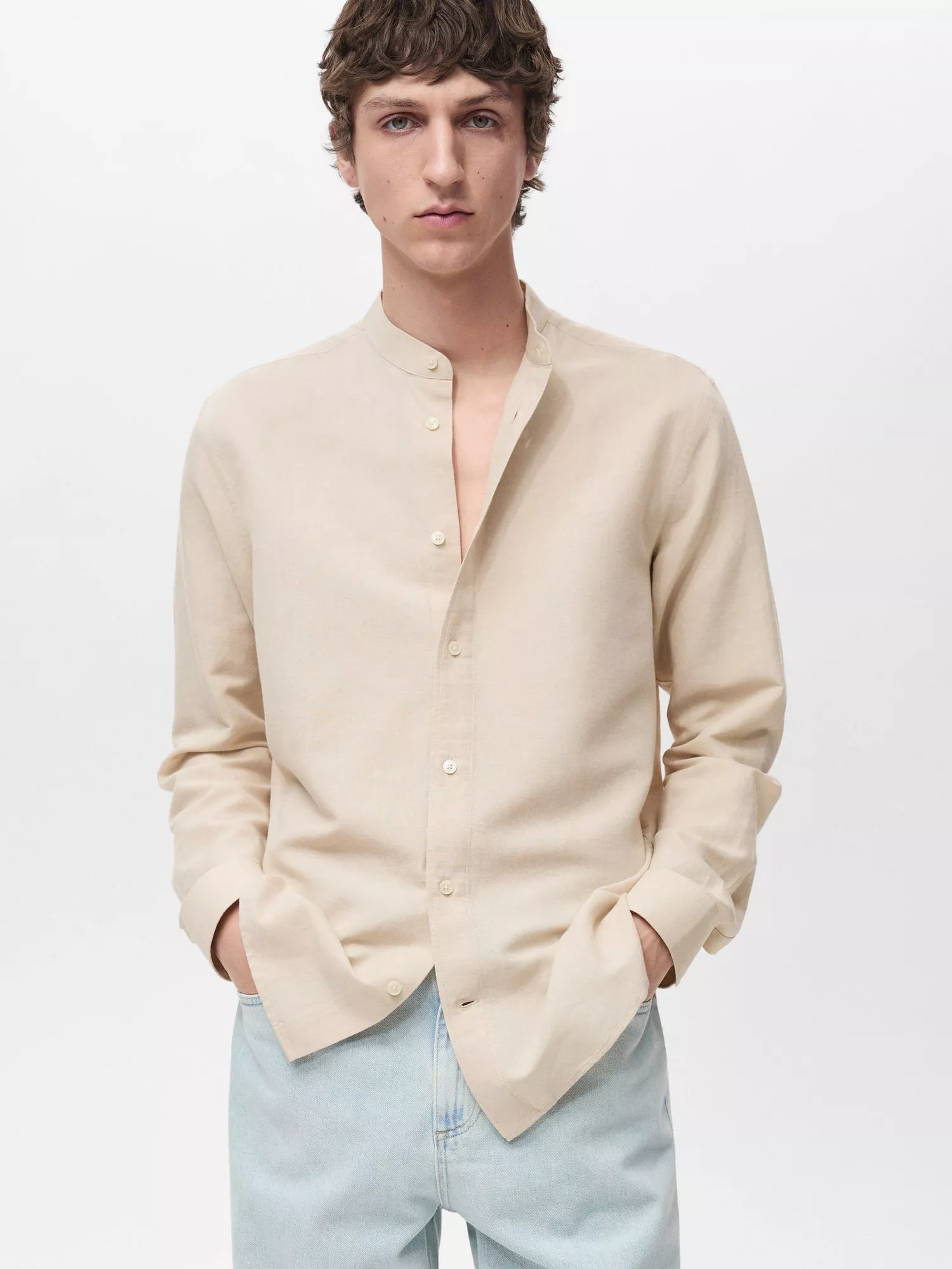 Made from a light linen blend for a light and breezy handle that will see you through holiday adventures and summer city wandering, this mandarin collar shirt from Mango is cut with a relaxed silhouette.