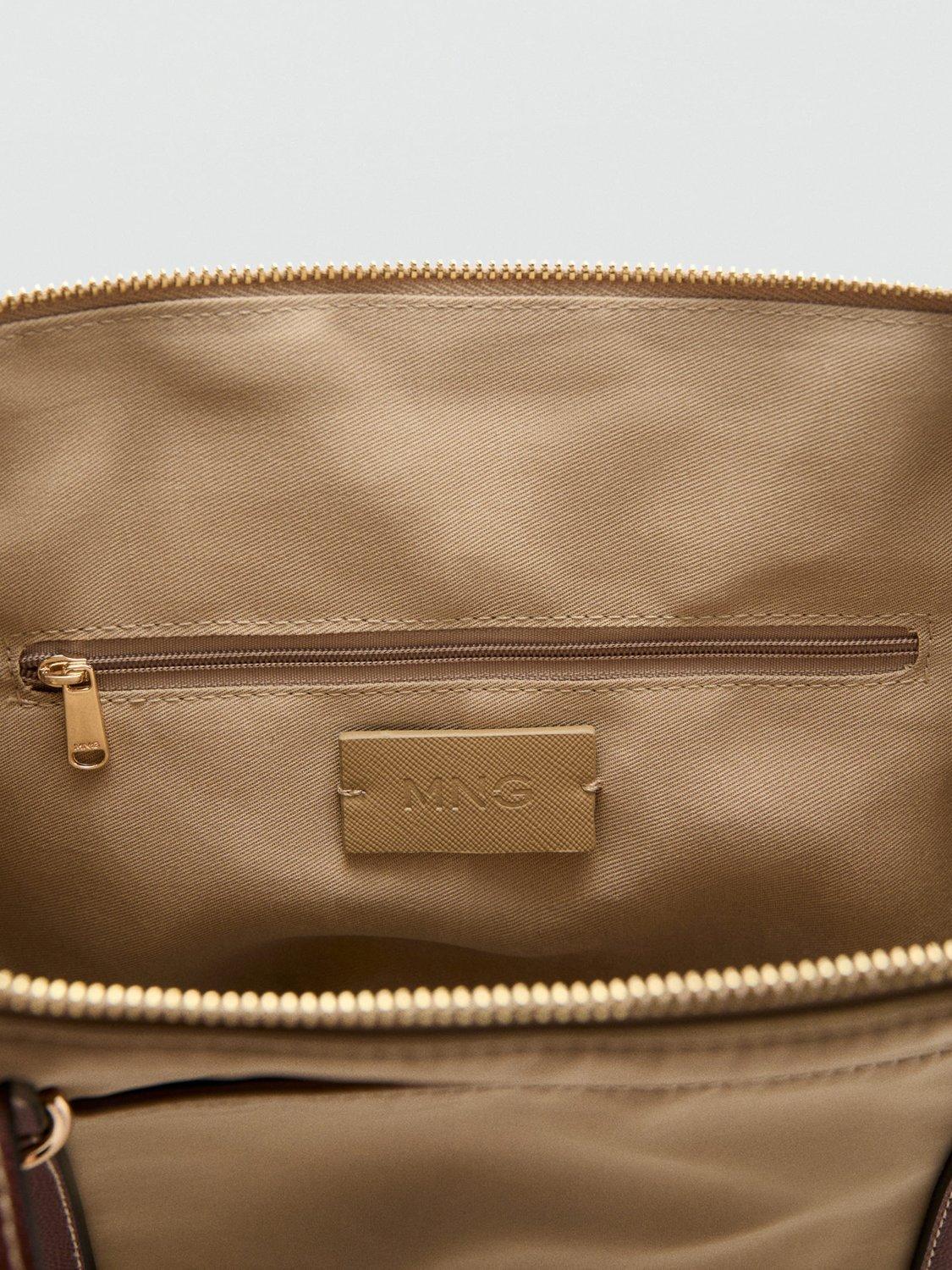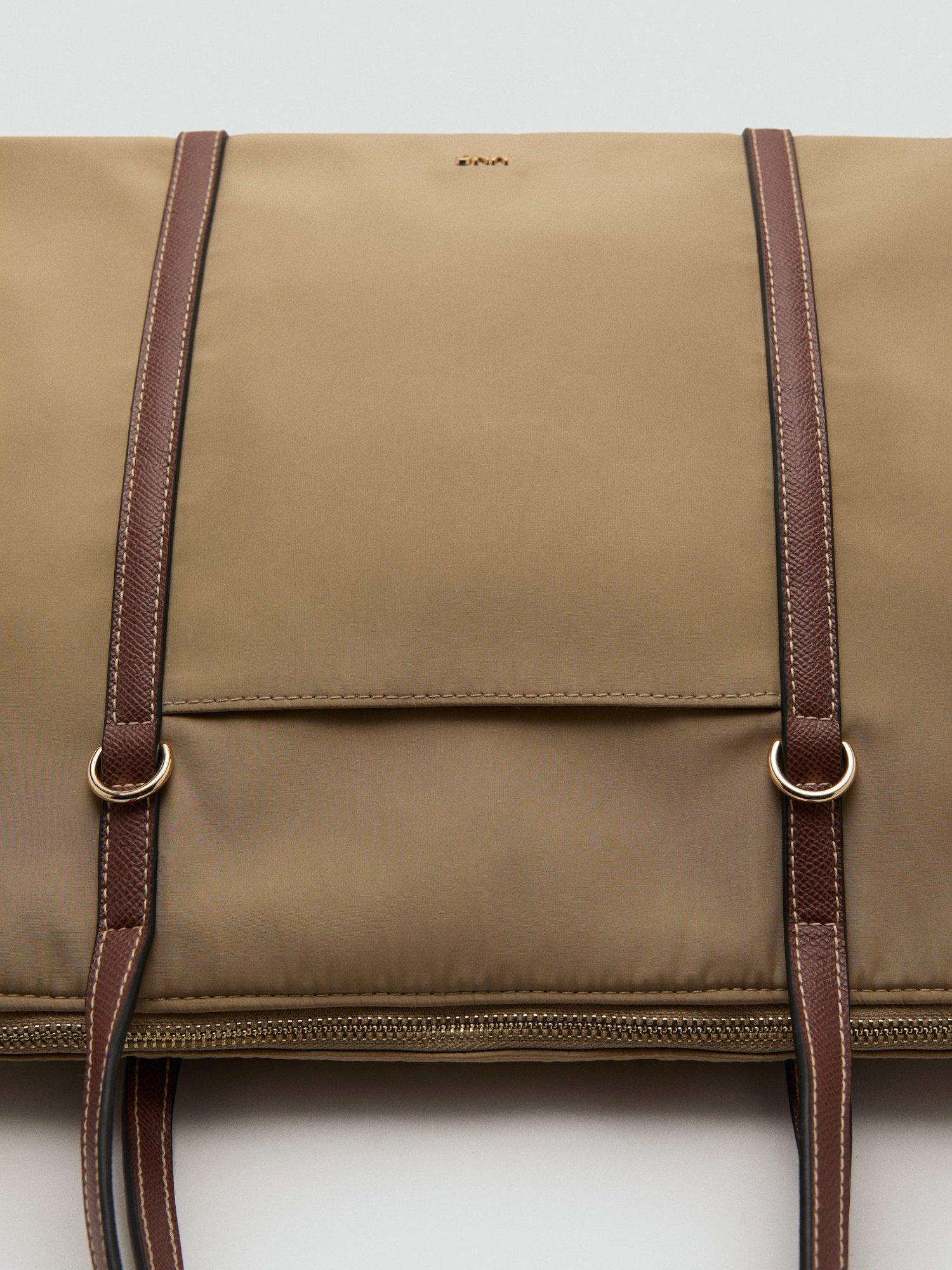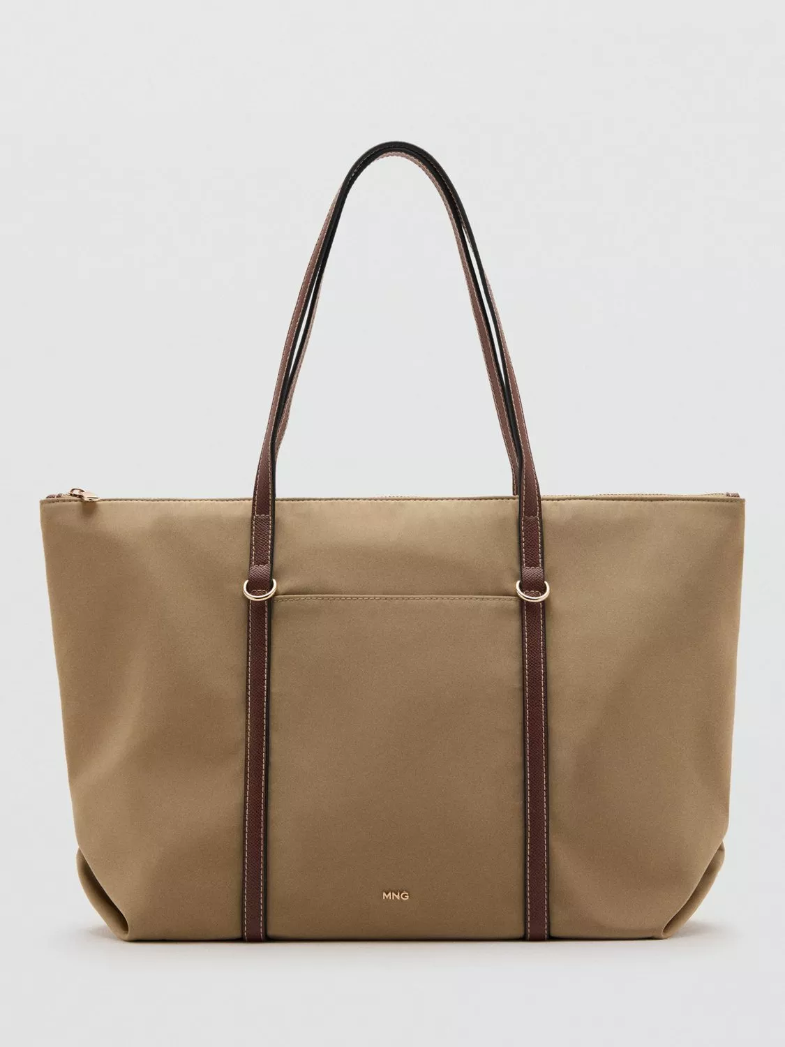 Double handle shopper bag with gold-tone hardware and faux leather accents. This large nylon bag has a zip fastening, an inner lining, an outer pocket, and contrasting shoulder straps.