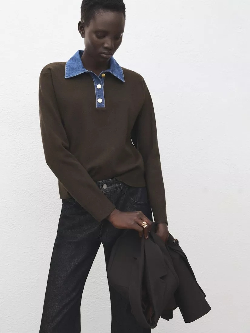 A soft knit jumper from Mango, designed for those who enjoy comfort with a twist. With a sculpted collar and button placket for a polished look, the soft viscose blend keeps you relaxed in any setting.