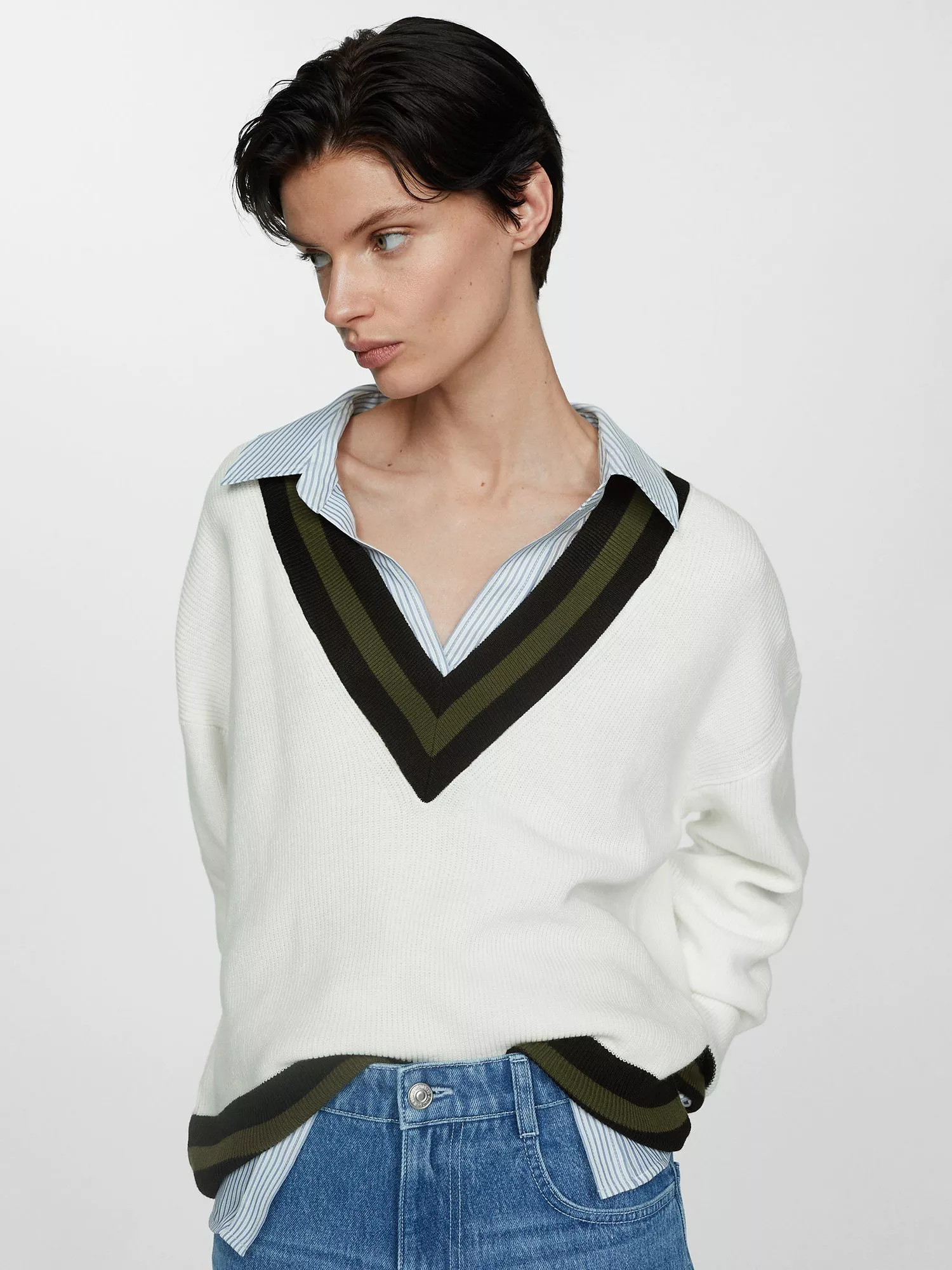 With a v-shaped neckline, this collegiate-inspired jumper from Mango plays canvas to contrast with its bold colour blocking.