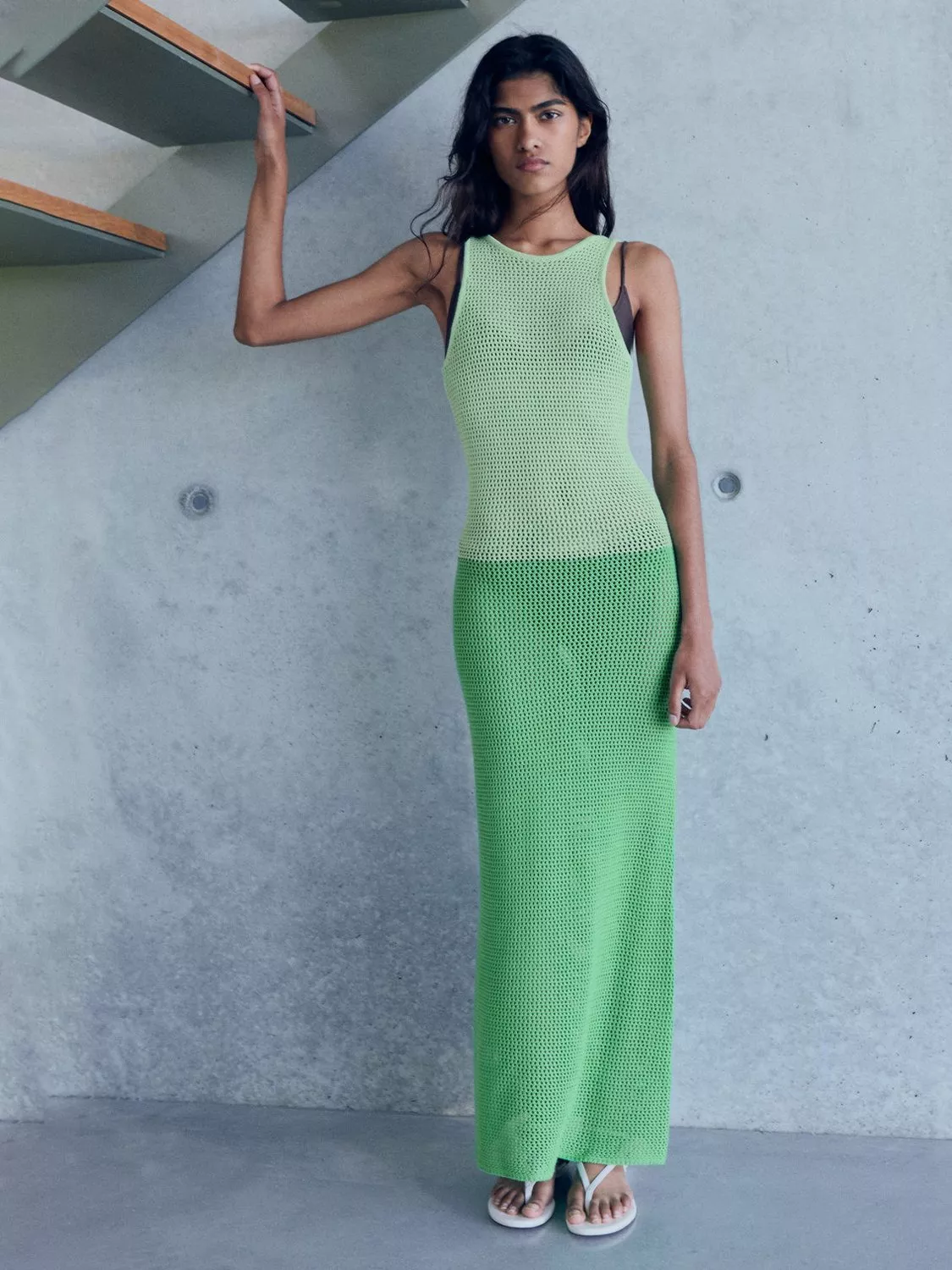 This sleeveless maxi dress from Mango has a round neck and is made from crocheted cotton in a two-tone colour block design.