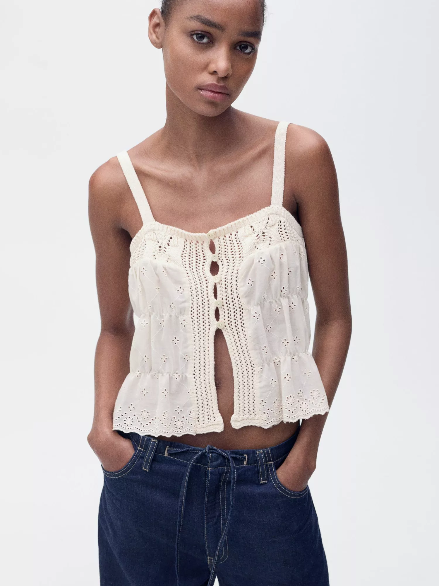 The foundation to all your summertime looks, this embroidered cami by Mango is framed with a square neckline. Slip on with tonal denim ready for the summer.