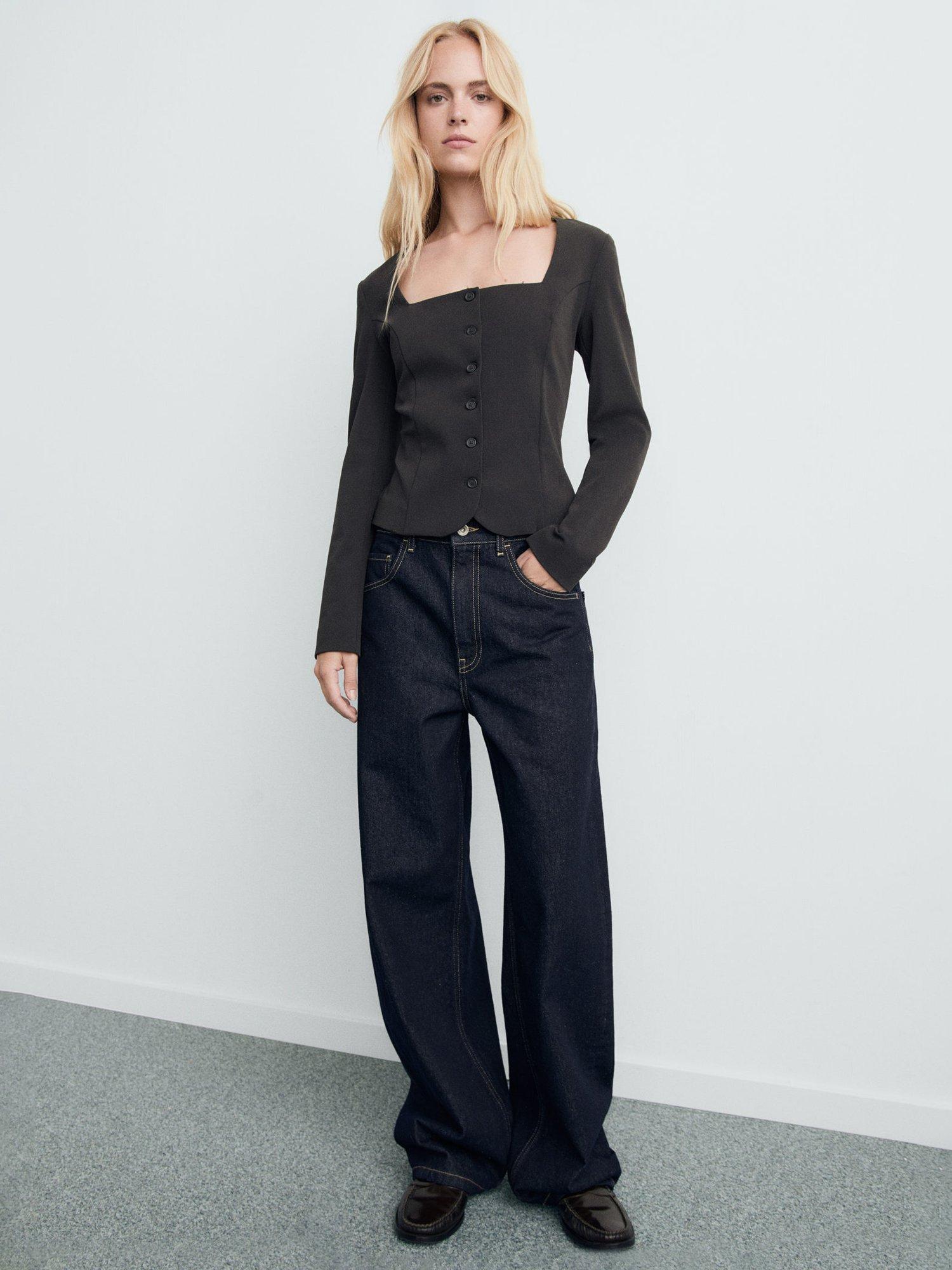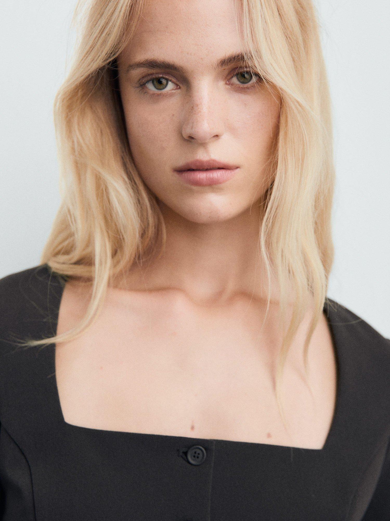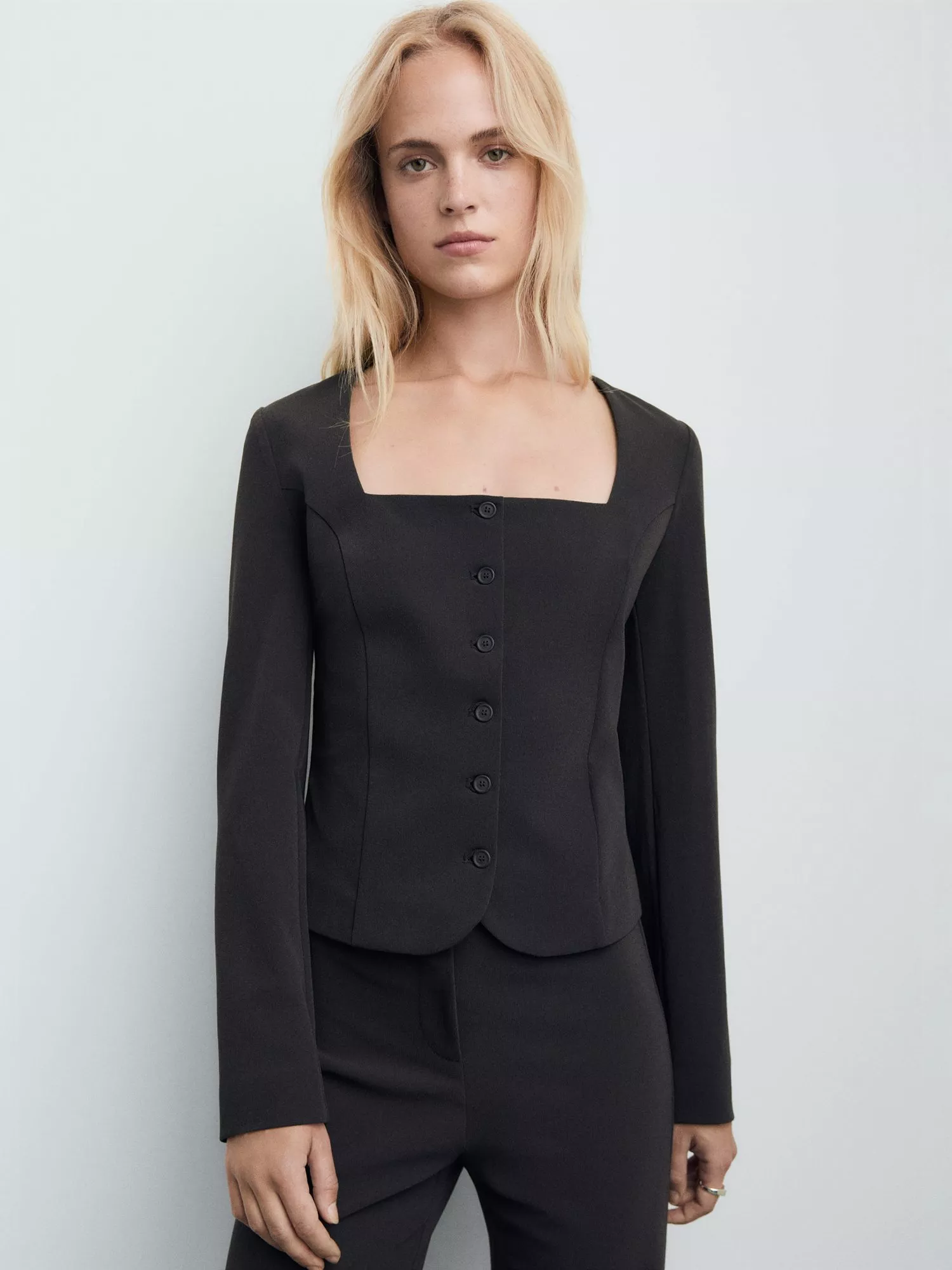 A fitted square neck blazer. With long sleeves and easy-fasten buttons through the front, it pairs easily with your wardrobe for work or leisure.