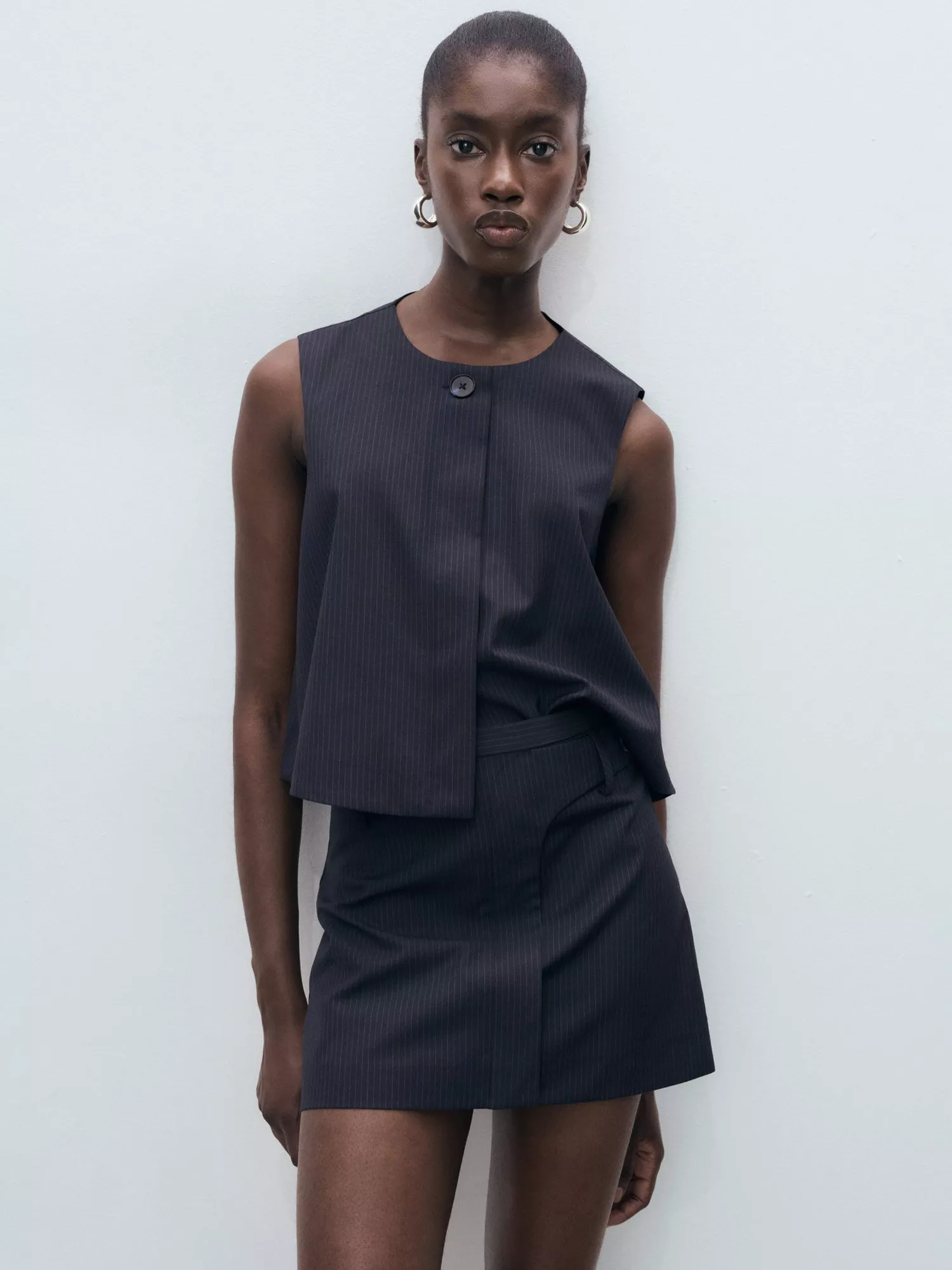 A tailored mini-length skirt from Mango. Carved to an uncomplicated straight fit, it's blended from viscose with a high waist and neat pinstripes. Finished with a button closure.