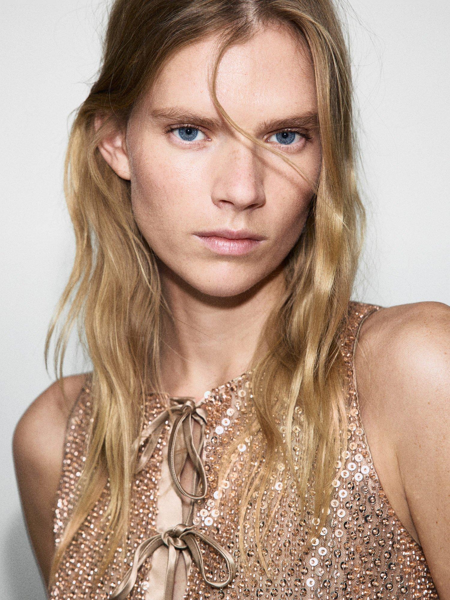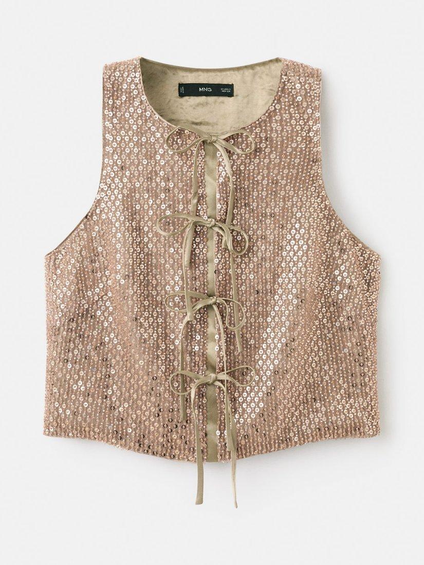 A cropped party blouse by Mango. Featuring a round neck and ties through the front, it glistens with metallic sequin detailing. Designed to dazzle at every gathering.