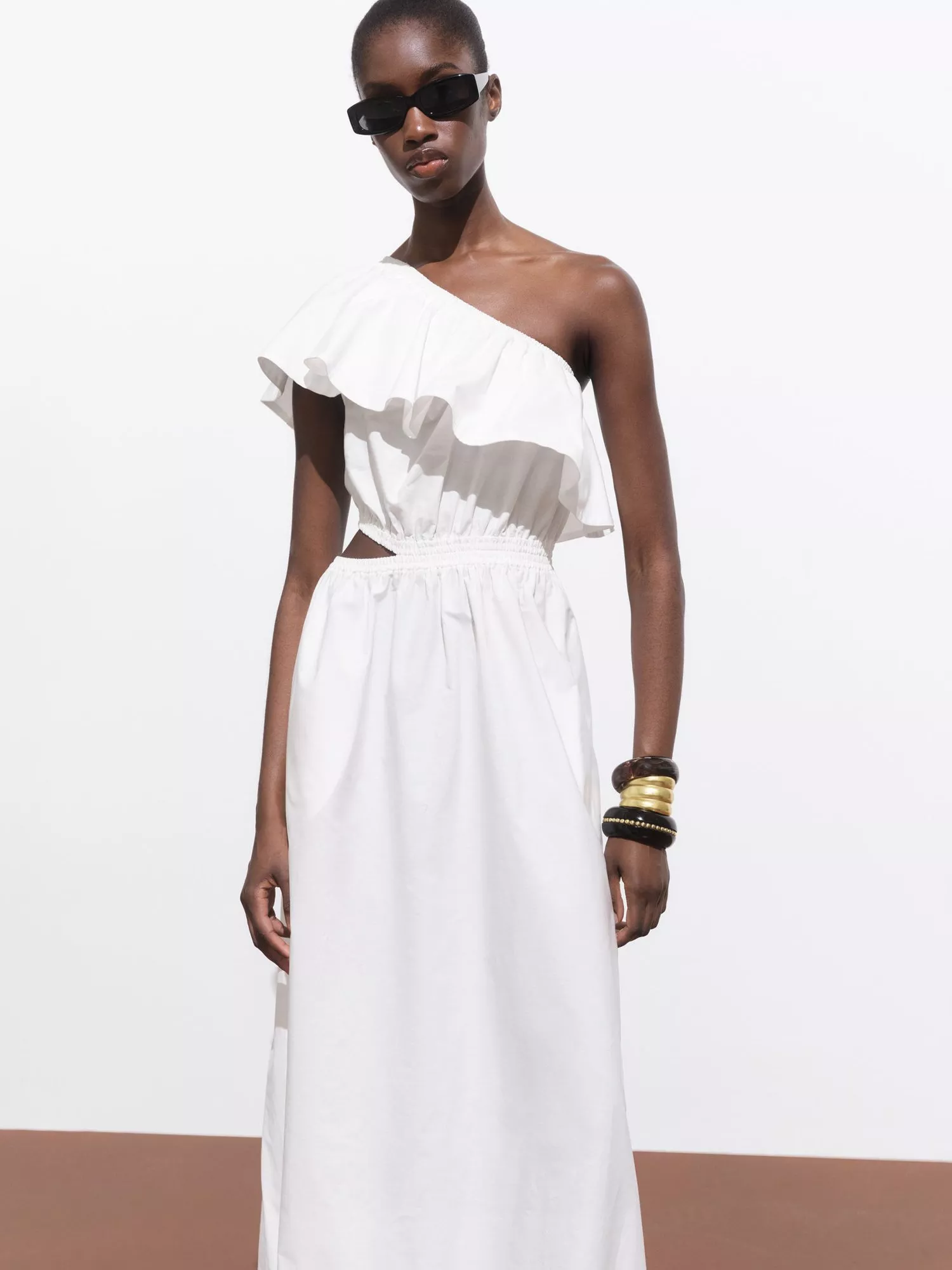 An asymmetric midi dress in pure cotton with plenty of frills. Loose and comfortable, it flatters every silhouette and adds a playful twist to your day, making you feel confident and at ease wherever you go.